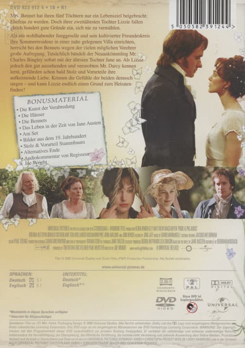 | Zusatzinfos / Bonusmaterial beim Film dabei | Die Kunst der Verabredung; Die Häuser; Die Bennets; Das Leben in der Zeit von Jane Austen; Am Set; Bilder aus dem 19. Jahrhundert; Stolz & Vorurteil Stammbaum; Alternatives Ende; Audiokommentar des Regisseurs; |