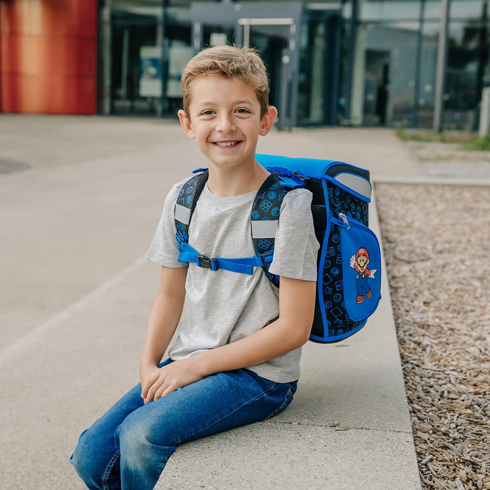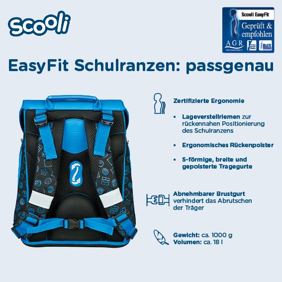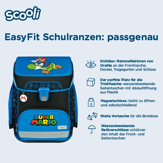 Der EasyFit Super Mario Schulranzen von Scooli ist für seine individuelle Anpassbarkeit an die Anatomie des Kindes mit dem Prüfsiegel "Ergonomisches Produkt" des Instituts für Gesundheit und Ergonomie e.V. ausgezeichnet. Sein geringes Gewicht (nur ca. 1.000 g bei ca. 18 Liter) und sein ergonomisches Rückenpolster sorgen für super Tragekomfort. Mit dem abnehmbaren Brustgurt und den Lageverstellriemen wird das Gewicht rückenschonend getragen. Die Oralite Reflektoren des EasyFit Schulranzen garantieren gute Sichtbarkeit im Straßenverkehr. Das 5-teilige Schulranzen Set besteht aus einem EasyFit Schulranzen, einem befülltem Schüleretui mit hochwertigen Buntstiften von Eberhard-Faber, einem Turnbeutel, einem Schlamperetui und einem abnehmbaren Schlüsselanhänger. Mit ihrem heldenhaften Avengers Design mit Ironman, Captain America und Hulk ist diese Schultasche die perfekte Wahl für alle Jungen.