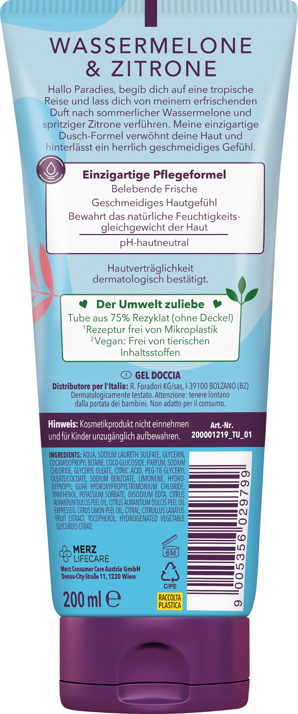 Hallo Paradies, begib dich auf eine tropische Reise und lass dich von meinem erfrischenden Duft nach sommerlicher Wassermelone und spritziger Zitrone verführen. Meine einzigartige Dusch-Formel verwöhnt deine Haut und hinterlässt ein herrlich geschmeidiges Gefühl.