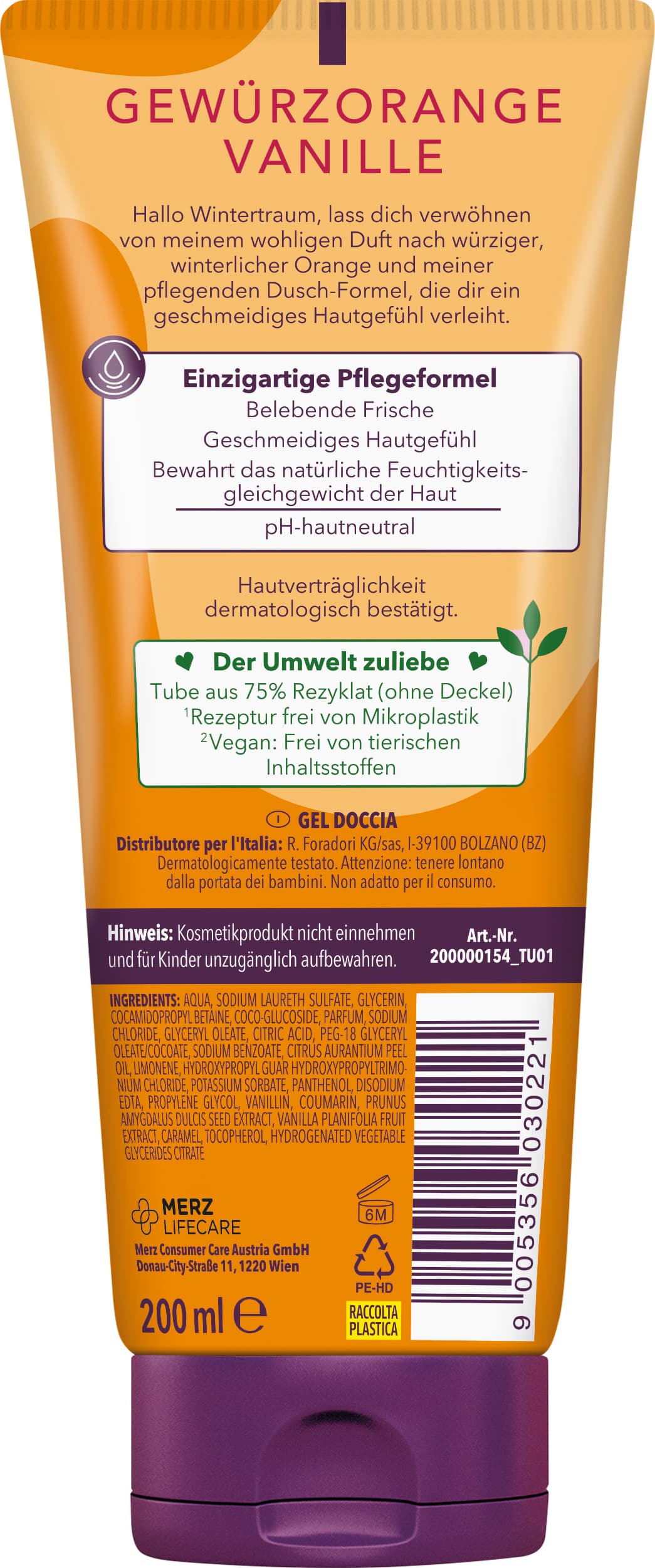 Hallo Wintertraum, lass dich verwöhnen von meinem wohligen Duft nach würziger, winterlicher Orange und meiner pflegenden Dusch-Formel, die dir ein geschmeidiges Hautgefühl verleiht.