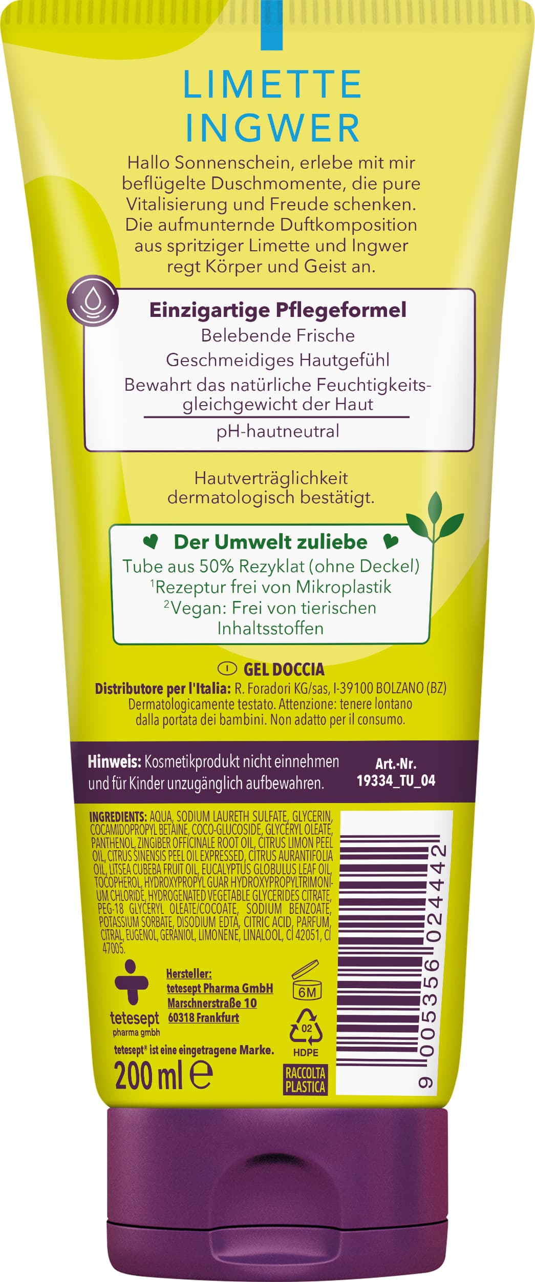 Hallo Sonnenschein, erlebe mit mir beflügelte Duschmomente, die pure Vitalisierung und Freude schenken. Die aufmunternde Duftkomposition aus spritziger Limette und Ingwer regt Körper und Geist spürbar an.