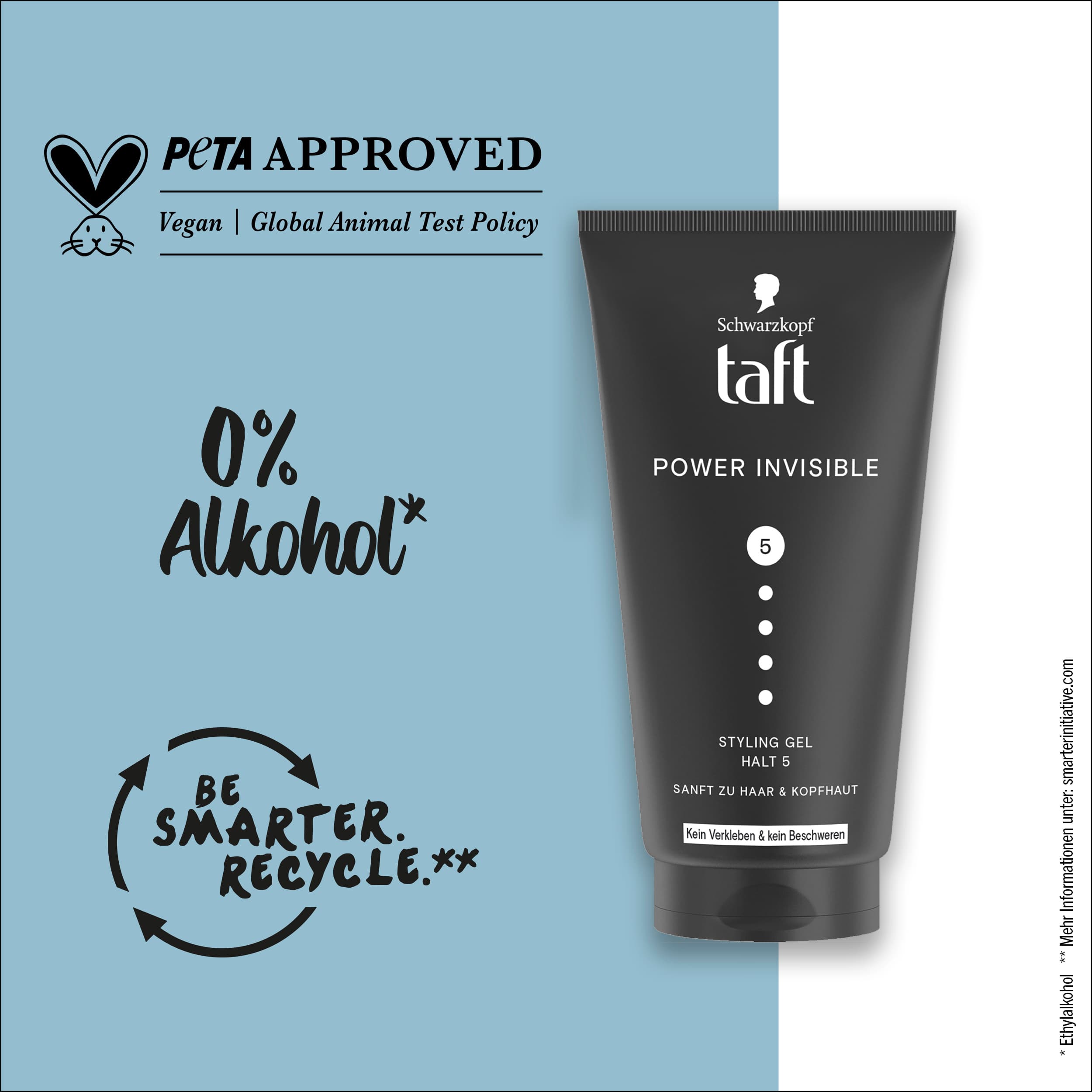 Schwarzkopf TAFT Gel Power Invisible Styling - Halt ohne Verkleben und BeschwerenDieses TAFT Power Invisible Styling Gel bietet eine transparente Textur mit langanhaltendem Halt, ohne zu Verkleben oder zu Beschweren. Das TAFT Haltegel lässt sich auch leicht mit Shampoo auswaschen und beschwert das Haar nicht, während es dank des feuchtigkeitsspendenden Panthenols sanft zum Haar und zur Kopfhaut ist. Es hilft auch, die Frisur vor Feuchtigkeit zu schützen. TAFT Stylingprodukte verwenden vegane Formeln, und sind von PETA, , zertifiziert. Die Formel enthält 0% Alkohol, , , . Sei klug. Recycle., , , ,Anwendung: Auf trockenem oder nassem Haar auftragen und stylen. Für beste Ergebnisse die Frisur mit TAFT Haarspray fixieren.Die Produktvorteile im Detail:• Ohne zu verkleben und zu beschweren• Sanft zum Haar und zur Kopfhaut• Langanhaltender Halt dank Haltegrad 5• Leicht auszuwaschen• Vegane Formel,• PETA zertifiziert, ,, Frei von tierischen Inhaltsstoffen, , Global Animal Test Policy, , , Ethylalkohol, , , , Weitere Informationen unter: smarterinitiative.com
