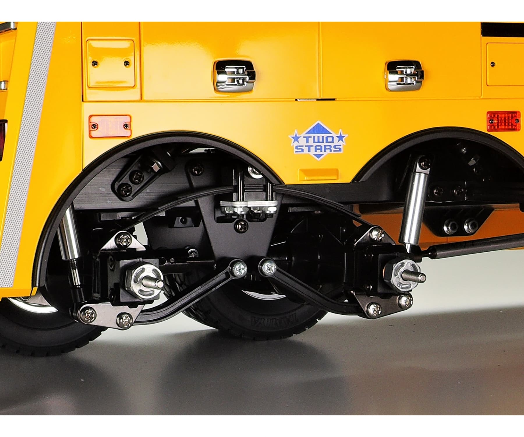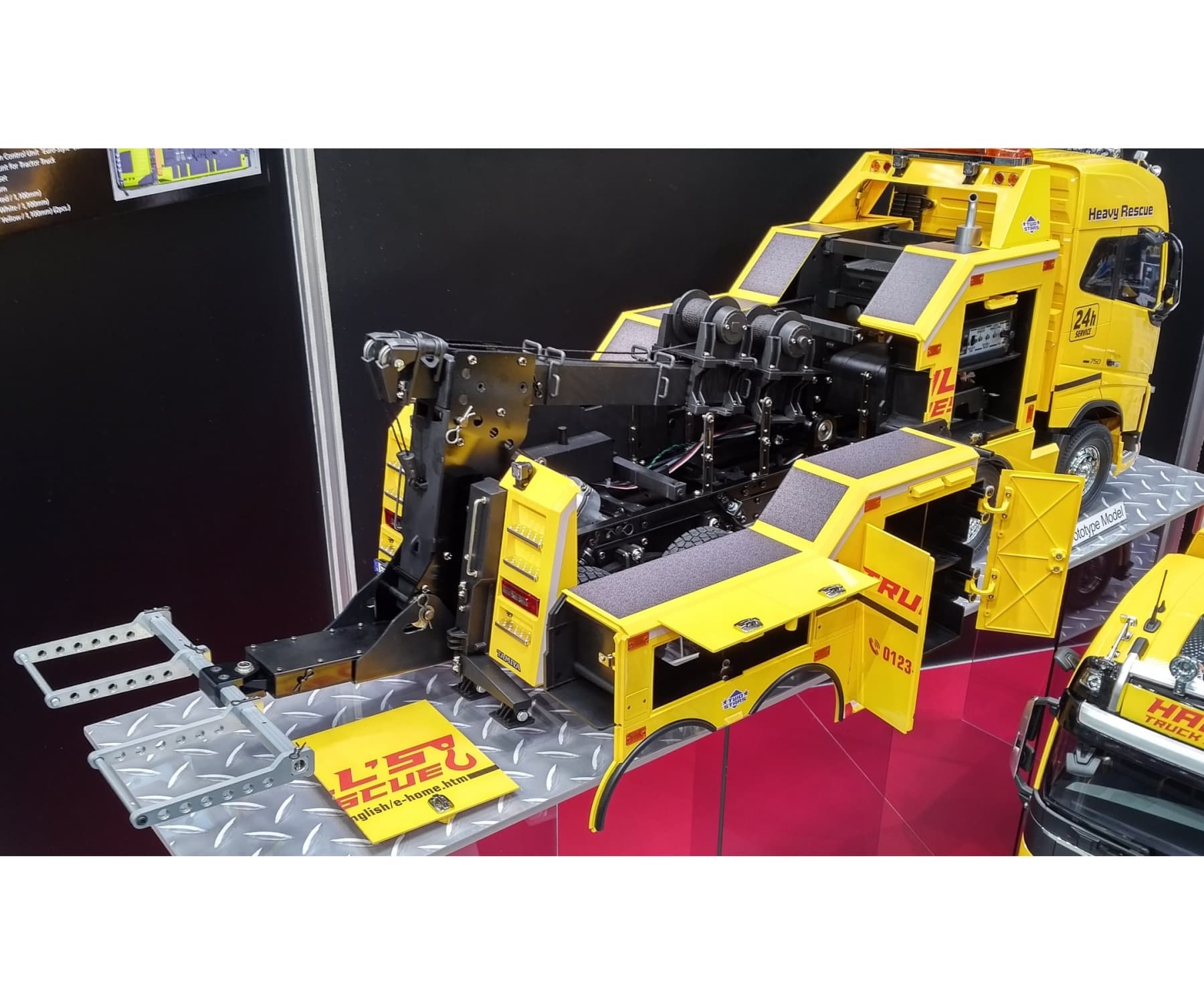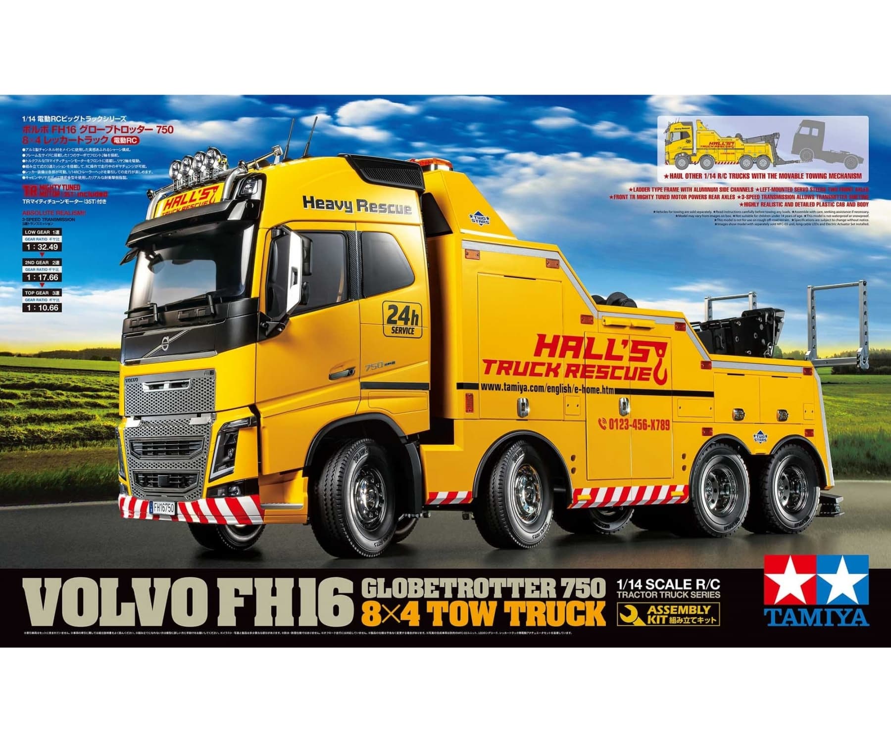 TAMIYA präsentiert mit dem Volvo FH16 den ersten Truck mit 4 Achsen und lenkbarer Doppelachse vorne. Das Chassis ist auf 8x4 umgebaut und die perfekte Basis für den Abschlepp-Truck. Der Kranaufbau ist extrem robust und besteht aus vielen Metallteilen. Angetrieben wird der Kran von einer optional erhältlichen ACU Einheit (Bestellnummer 300056553). Mit dieser Einheit kann der Kran nach oben und unten bewegt werden.Das Modell wird als Bausatz ausgeliefert und beinhaltet schon zahlreiche Zurüstteile, wie z.B. Fotoätzteile für den Kühlergrill, Spannschlösser mit Ketten für die Ladungssicherung u.v.m..Das Modell hat eine stattliche Länge von über 70 cm und wird über die beiden Hinterachsen angetrieben. Für ausreichend Power sorgt der TAMIYA TR Mighty Tuned Truckmotor (35T).Für den Antrieb, Beleuchtung und Sound wird die TAMIYA Multifunktionseinheit MFC-03 (300056523) empfohlen. Durch die enorme Länge des Modells müsse hier nur die Serien-MFC LED´s durch die speziellen mit längerem Kabel (300056549 bis 300056551) ersetzt werden.Der FH16 ist das erste TAMIYA Truckmodell, bei dem die Fahrerkabine fest verschraubt ist. Dadurch kann die MFC hinter den Sitzen verbaut werden und das Interior ist voll sichtbar.Benötigtes Zubehör:- Mind. 4 Kanal Fernsteuerung - empfohlen Carson Reflex Stick500501006 (6-Kanal), 500501003 (14-Kanal) oder500501004 (14-Kanal LCD Display)- 7.2V NiMH Akkupack, Ladegerät- TAMIYA TS-Farbe für die Lackierung- Lenkservo + Servo für Schaltgetriebe- Fahrtenregler oder TAMIYA Multifunktionseinheit MFC-03300056523 für die Fahr-, Licht- und Soundfunktionen- optional die ACU Einheit (300056553) für den Antrieb desKranarmesLieferumfang:Bausatzmodell mit ausführlicher Anleitung, Elektromotor, 3-Gang SchaltgetriebeWARNHINWEISE:Die Anleitung sollte zusammen mit einem Erwachsenen vollständig gelesen und verstanden werden. Von kleinen Kindern fernhalten. Kinder dürfen keine Teile oder Verpackungsmaterial in den Mund nehmen. Das Modell kann einige scharfe Ecken haben. Achten Sie beim Umgang darauf. Lesen Sie die der RC Einheit beiliegende Anleitung und bewahren Sie diese für späteren Bedarf auf.Falls beim Zusammenbau Schwierigkeiten auftreten, fragen Sie einen Erwachsenen, der die Arbeiten überwacht oder einen Modellbauer mit RC Erfahrungen bzw. Fachhändler.Werkzeuge jeweils nur zweckbestimmt einsetzen. Bei fehlerhafter Anwendung besteht Verletzungsgefahr.Wenn Sie Farben und/oder Kleber verwenden (nicht im Bausatz enthalten), beachten und befolgen Sie die dort beiliegenden Anweisungen.Bausatz von kleinen Kindern fernhalten. Verhüten Sie, dass Kinder irgendwelche Bauteile in den Mund nehmen oder Plastiktüten über den Kopf ziehen.