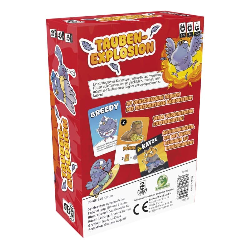 In Taubenexplosion füttert ihr exzentrische Stadttauben mit Futterkarten, bis sie entweder glücklich sind – oder explodieren. Doch Vorsicht: Eure Mitspieler sabotieren mit Aktionskarten eure Pläne oder lassen eure Tauben mit überraschenden Effekten hochgehen. Wer als Erstes genügend glückliche Tauben sammelt oder als Letzter übrig bleibt, gewinnt dieses herrlich gemeine Familienspiel voller Chaos, Timing und Schadenfreude.