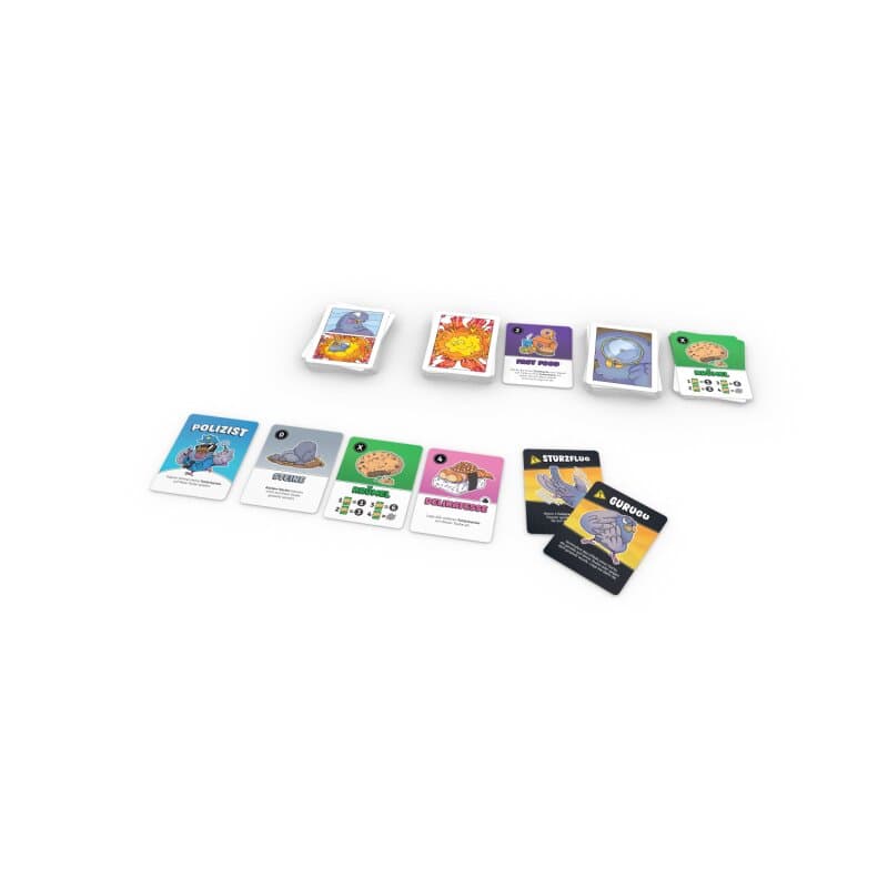 Kombination erzielt. Gleichzeitig kann man gegnerische Tauben sabotieren – durch gezielte Kacke-Attacken, Abfall, Steine oder Raubaktionen. Doch Vorsicht: Wer eine Taube zu bunt füttert, bringt sie zur Explosion! Glückliche Tauben bringen euch dem Spielsieg näher, explodierte Tauben können euch aus dem Spiel werfen. Wer 2 (bei 4-5 Spielern) bzw. 3 glückliche Tauben hat oder als letzter Spieler im Spiel ist, gewinnt.