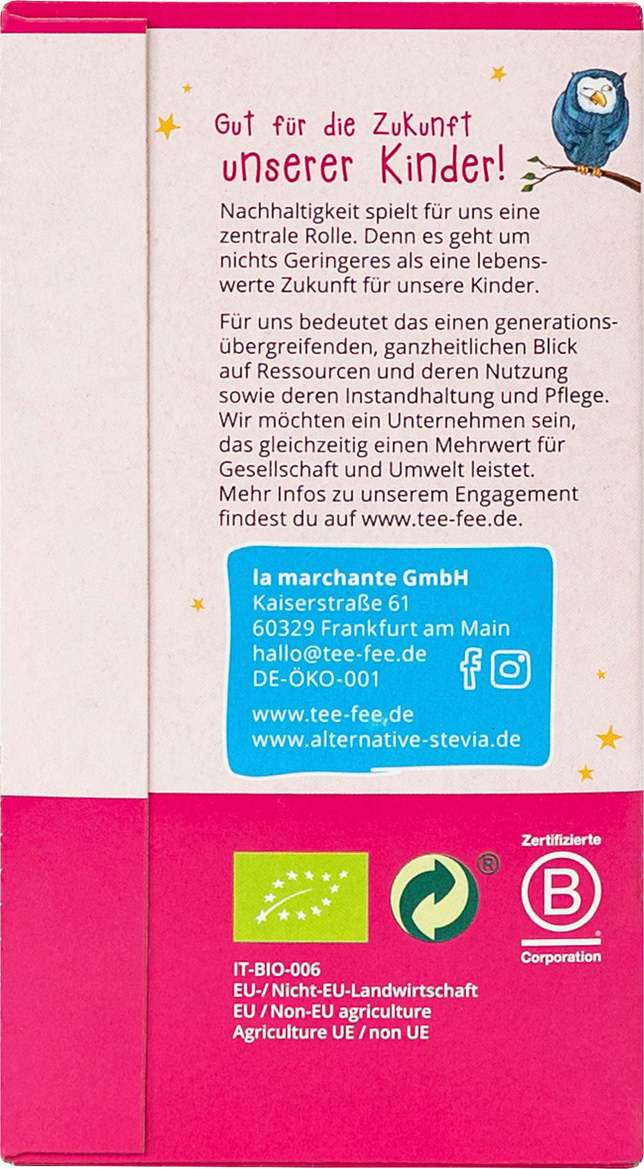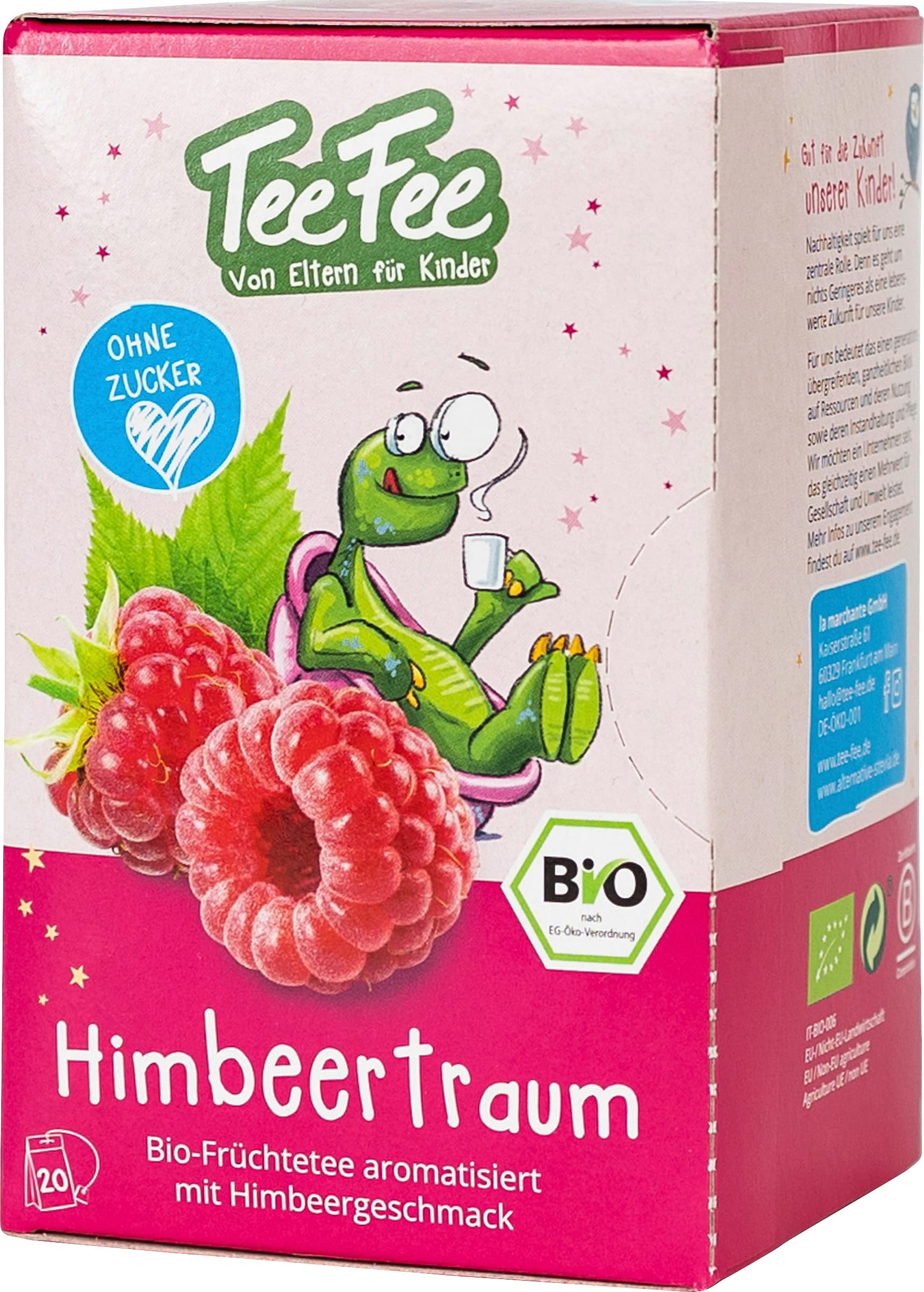 Unser Himbeertraum ist nicht einfach nur ein Getränk; er ist ein kreativer Weg, kleinen Wasserverweigerern die Freude am Trinken näherzubringen. Die TeeFee setzt auf eine einzigartige Mischung, um einen süßen, kalorienfreien Genuss zu schaffen, der nicht nur den Durst löscht, sondern Kindern hilft, ihre täglich empfohlene Trinkmenge zu erreichen.Warum sollte dich der TeeFee Bio-Früchtetee Himbeere begeistern? Weil er nicht nur aus Zutaten aus biologisch kontrolliertem Anbau besteht, sondern auch einen magischen Reiz hat, der Kinder dazu ermutigt, spielerisch das Trinken zu erkunden. Unsere Bio-Tees sind mehr als nur Tee-Mischungen; jeder Schluck des TeeFee Himbeertraums ist eine Verführung der Sinne und ein magisches Erlebnis. Erlebe die Faszination, wenn die fruchtige Süße den Gaumen berührt und die Vorstellungskraft in eine Welt voller Genuss entführt. Bei der TeeFee geht es darum, Kinder für leckeres Trinken zu begeistern – und unser Himbeertraum ist der charmante Schlüssel dazu. Entdecke mit der TeeFee die Magie des Trinkens, verpackt in einem süßen Himbeertraum für die kleinen Teetrinker von Morgen.
