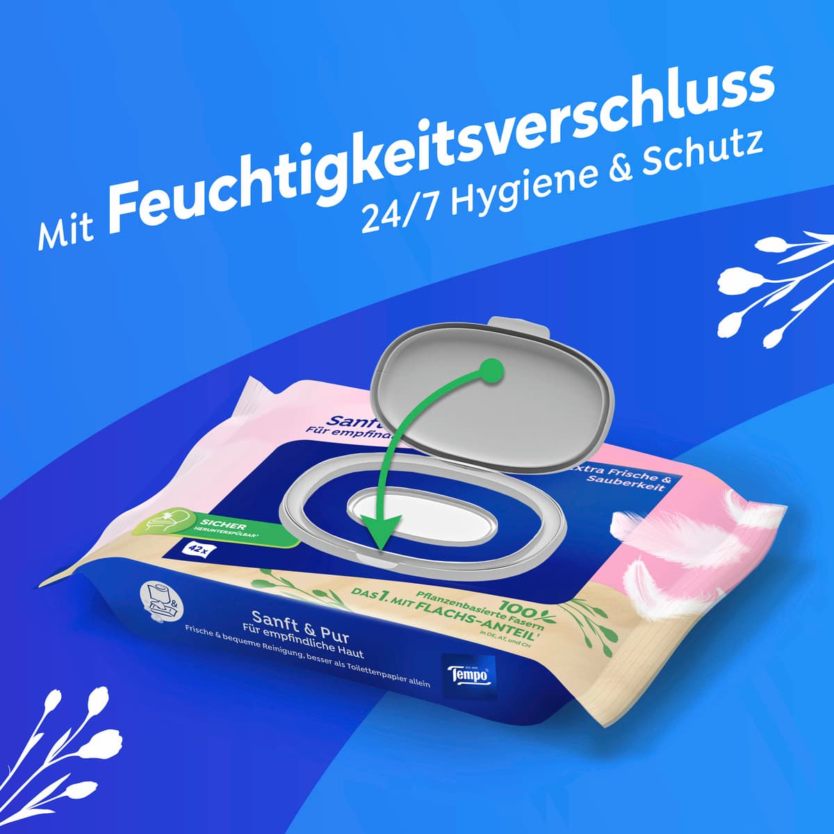 Tempo Feuchte Toilettentücher werden aus 100% pflanzenbasierten Fasern mit Flachsanteil hergestellt und wurden entwickelt, um Druck von den Wäldern zu nehmen und so etwas für unseren Planeten zu tun. Die plastikfreien Tücher können genau wie trockenes Toilettenpapier heruntergespült werden und sind sicher herunterspülbarähnlich wie trockenes Toilettenpapier. Tempo Feuchte Toilettentücher sind dermatologisch getestet und auch für sensible Haut geeignet. Integriere die perfekte 2-Schritte-Reinigung aus trockenem Toilettenpapier und Tempo Feuchte Toilettentücher in deinen Hygiene-Alltag und fühle dich jedes Mal verlässlich frisch. Die recycelbare Verpackung*** von Tempo Feuchte Toilettentücher ist mit einem Feuchtigkeitsverschluss ausgestattet, durch den die Blätter feucht und hygienisch bleiben.
