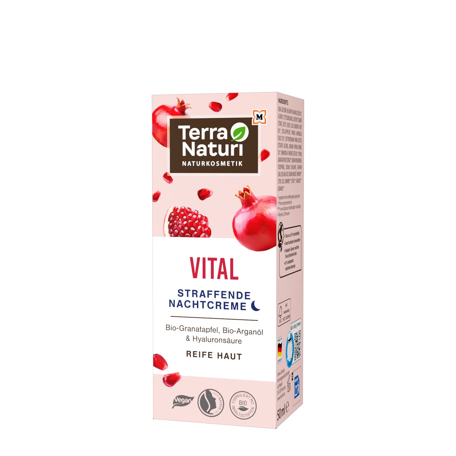 Die reichhaltige Formel der straffenden Terra Naturi VITAL Nachtcreme unterstützt die anspruchsvolle und reife Haut während der nächtlichen Regeneration.