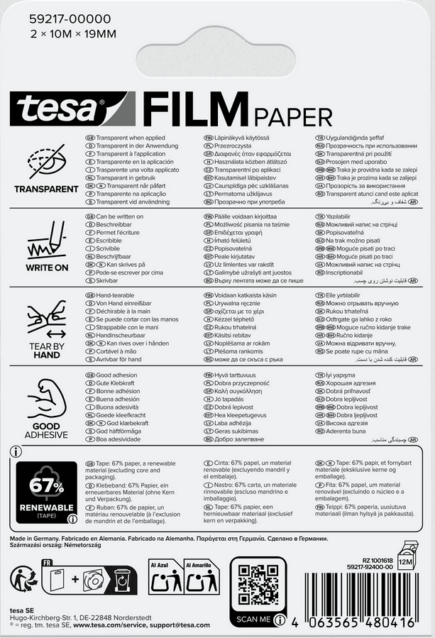 Entdecken Sie das transparente tesafilm® PAPER Klebeband. Es besteht zu 67% aus Papier, ein erneuerbares Material (ohne Kern und Verpackung) - zertifiziert durch DIN CERTCO (Registernummer: 8C428), eine Zertifizierungsgesellschaft der TÜV Rheinland Gruppe. Vielseitig einsetzbar, zum Verpacken, Fixieren, Labeln oder Reparieren - nahezu unsichtbar auf hellem Untergrund und von Hand einreißbar. Ideal mit Permanentmarker und alternativ auch mit Bleistift oder Kugelschreiber beschreibbar. Leise abrollend und mit verlässlicher Klebeleistung dank wasserbasiertem Acrylat. FSC®-zertifiziertes Papier (FSC® C148769) und recyclingfreundlich nach INGEDE Methode 12.