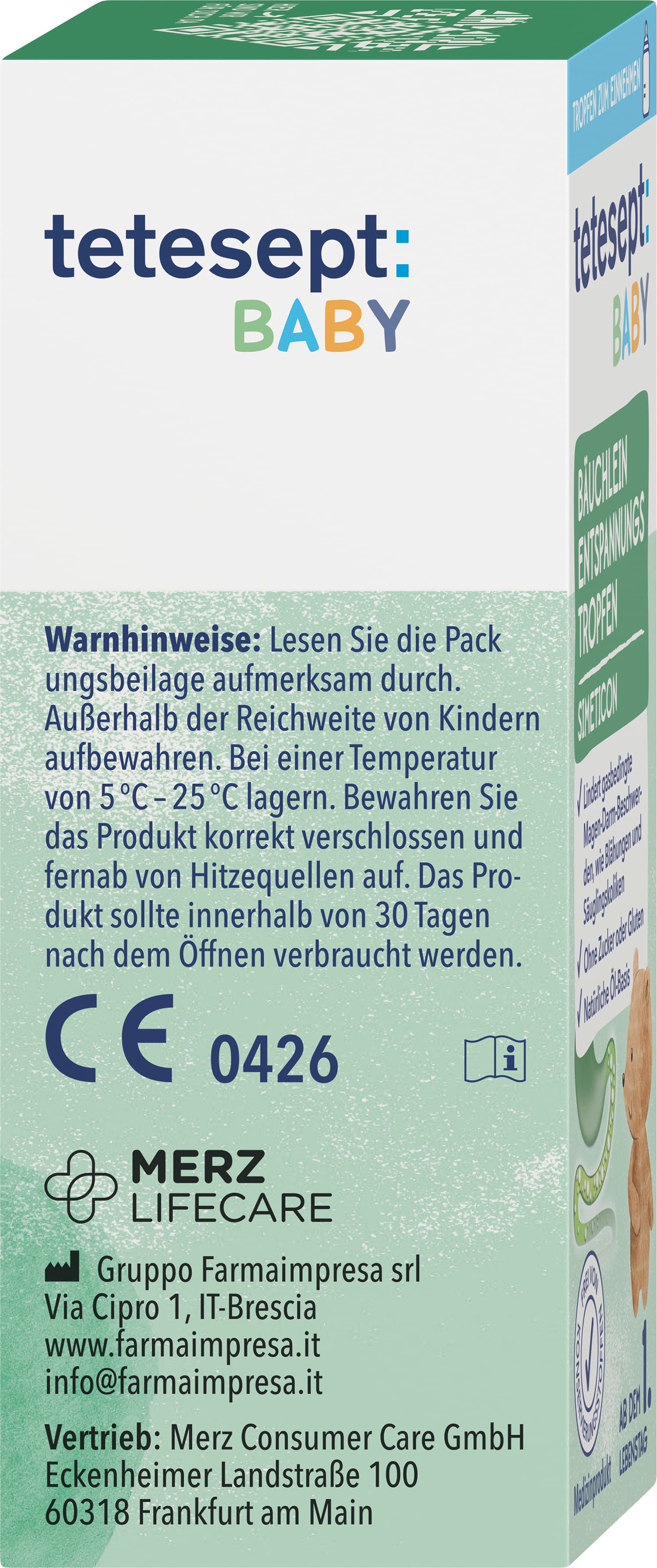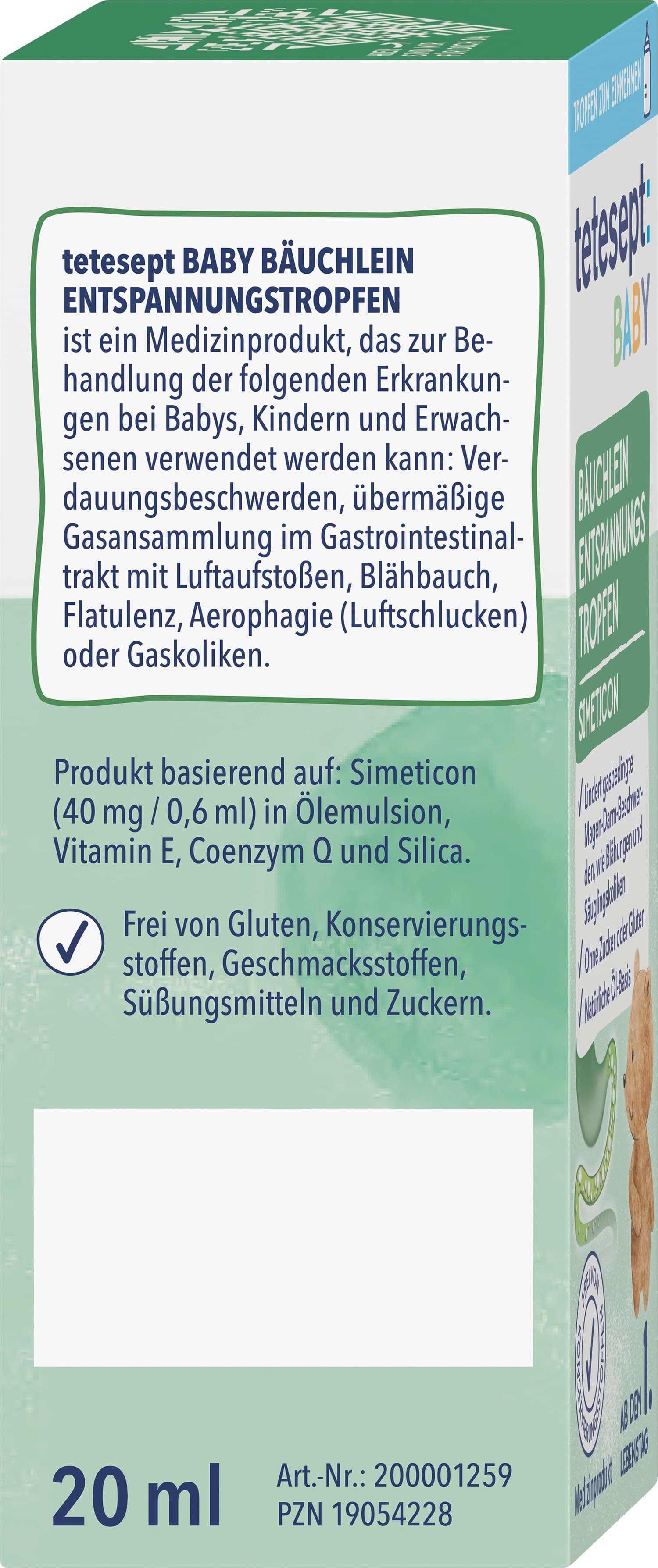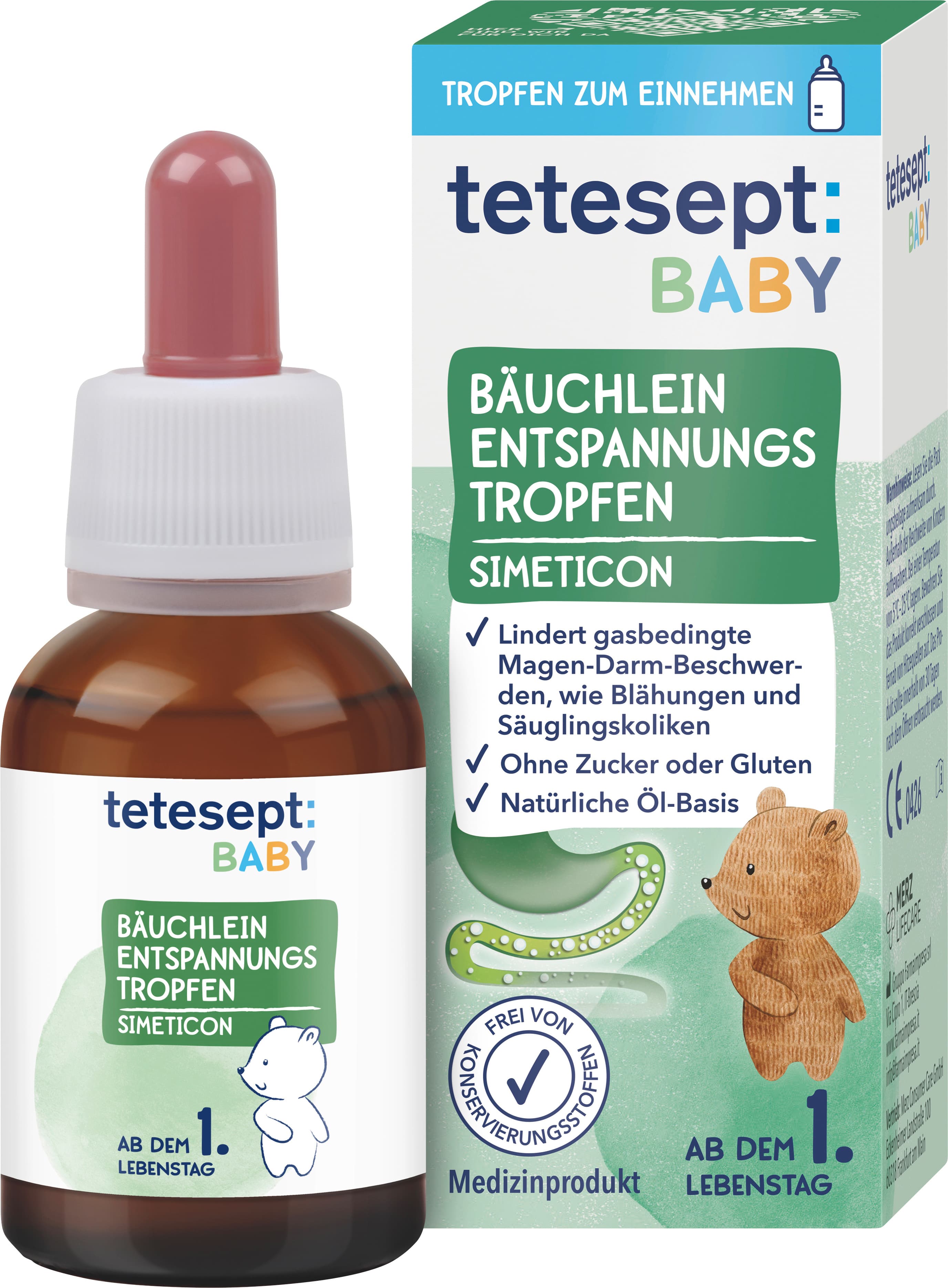tetesept Baby Bäuchlein Entspannungstropfen ist ein Medizinprodukt, das zur Behandlung der folgenden Erkrankungen bei Babys, Kindern und Erwachsenen verwendet werden kann: Verdauungsbeschwerden, übermäßige Gasansammlung im Gastrointestinaltrakt mit Luftaufstoßen, Blähbauch, Flatulenz, Aerophagie (Luftschlucken) oder Gaskoliken. Ab dem 1. Lebenstag.,tetesept Baby Bäuchlein Entspannungstropfen ist ein Medizinprodukt, das gasbedingte Magen-Darm-Beschwerden wie Blähungen und Säuglingskoliken lindert. Ab dem 1. Lebenstag.