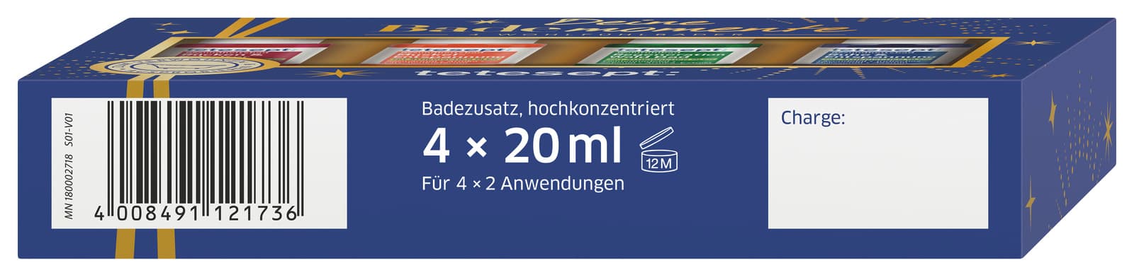 | Lagerhinweis | tetesept Badezusatz dem einlaufenden Badewasser hinzugeben, um Wannenverfärbungen zu vermeiden. Nach dem Baden die Badewanne mit einem heißen Wasserstrahl ausspülen und Produktrückstände entfernen. Direkten Kontakt mit empfindlichen Oberflächen und Gegenständen vermeiden. Erwachsenenbäder. Nur auf intakter Haut anwenden. Nicht während Schwangerschaft und Stillzeit anwenden. |
