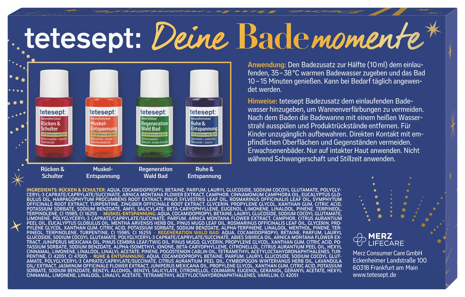 Deine Bademomente Geschenkset von tetesept enthält vier Wohlfühlbäder: Rücken & Schulter, Muskel-Entspannung, Regeneration Wald Bad und Ruhe & Entspannung. Jetzt Ausprobieren und Verwöhnen!