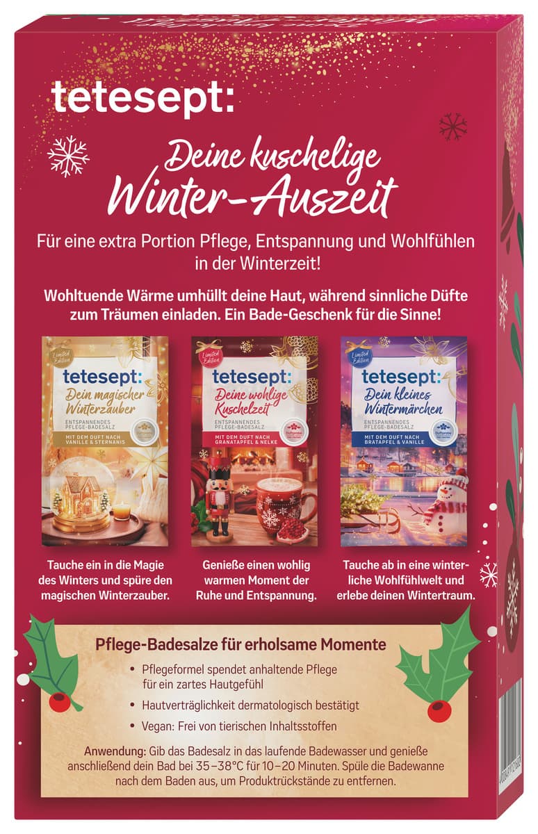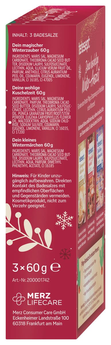 | Inhaltsstoffe | DEIN MAGISCHER WINTERZAUBER 60 G: MARIS SAL, MAGNESIUM CARBONATE, THEOBROMA CACAO SEED BUTTER, DISODIUM LAURYL SULFOSUCCINATE, LECITHIN, AQUA, ILLICIUM VERUM FRUIT OIL, PARFUM, ANETHOLE, CITRUS AURANTIUM PEEL OIL, COUMARIN, EUGENOL, LIMONENE, VANILLIN, CI 16185, CI 47005 INGREDIENTS: DEINE WOHLIGE KUSCHELZEIT 60 G: : MARIS SAL, MAGNESIUM CARBONATE, PARFUM, THEOBROMA CACAO SEED BUTTER, DISODIUM LAURYL SULFOSUCCINATE, LECITHIN, CITRUS AURANTIUM PEEL OIL, PUNICA GRANATUM FRUIT/ROOT/STEM POWDER, EUGENIA CARYOPHYLLUS FLOWER OIL, MALTODEXTRIN, AQUA, SODIUM CHLORIDE, SODIUM SULFATE, COUMARIN, EUGENOL, LIMONENE, VANILLIN, CI 16035, CI 17200 INGREDIENTS: DEIN KLEINES WINTERMÄRCHEN 60 G: : MARIS SAL, MAGNESIUM CARBONATE, THEOBROMA CACAO SEED BUTTER, DISODIUM LAURYL SULFOSUCCINATE, LECITHIN, AQUA, PARFUM, DIMETHYL PHENETHYL ACETATE, CI 16185 |