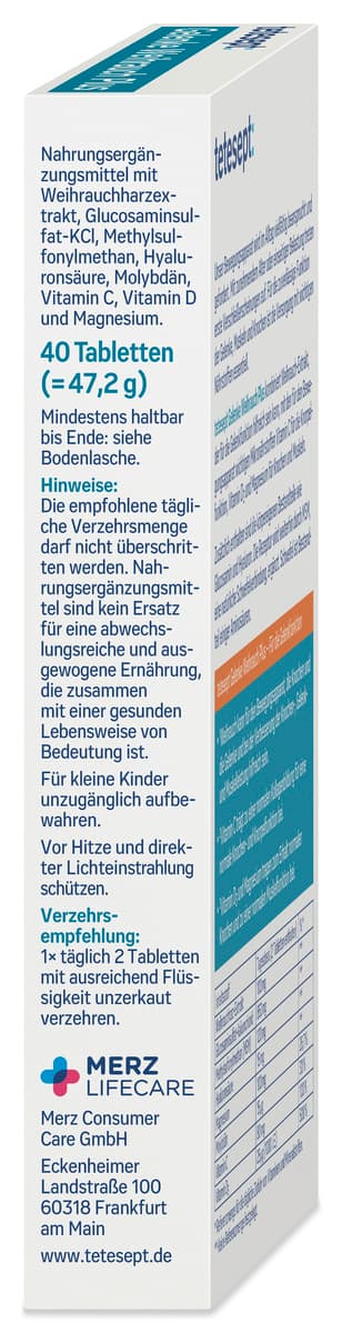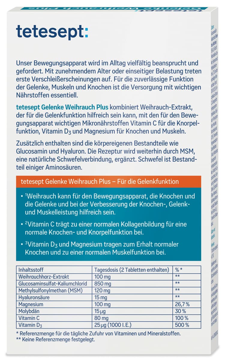 Unser Bewegungsapparat wird im Alltag vielfältig beansprucht und gefordert. Mit zunehmendem Alter oder einseitiger Belastung treten erste Verschleißerscheinungen auf. Für die zuverlässige Funktion der Gelenke, Muskeln und Knochen ist die Versorgung mit wichtigen Nährstoffen essentiell. tetesept Gelenke Weihrauch Plus kombiniert Weihrauch-Extrakt, der für die Gelenkfunktion hilfreich sein kann, mit den für den Bewegungsapparat wichtigen Mikronährstoffen Vitamin C für die Knorpelfunktion, Vitamin D3 und Magnesium für Knochen und Muskeln. Zusätzlich enthalten sind die körpereigenen Bestandteile wie Glucosamin und Hyaluron. Die Rezeptur wird weiterhin durch MSM, eine natürliche Schwefelverbindung, ergänzt. Schwefel ist Bestandteil einiger Aminosäuren.