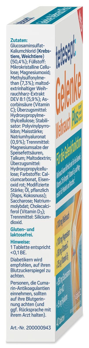 | Zutaten | Zutaten in absteigender Reihenfolge: Glucosaminsulfat-Kaliumchlorid (Krebstiere, Weichtiere) (50,4%); Füllstoff: Mikrokristalline Cellulose; Magnesiumoxid; Methylsulfonylmethan (7,3%); maltodextrinhaltiger Weihrauchharz Extrakt DEV 8:1 (5,9%); Ascorbinsäure (Vitamin C); Überzugsmittel: Hydroxypropylmethylcellulose; Stabilisator: Polyvinylpyrrolidon; Maisstärke; Natriumhyaluronat (0,9%); Trennmittel: Magnesiumsalze der Speisefettsäuren, Talkum; Maltodextrin; Überzugsmittel: Hydroxypropylcellulose; Farbstoffe: Calciumcarbonat, Eisenoxid rot; Modifizierte Stärke; Öl, pflanzlich (Raps, Kokosnuss); Saccharose; Natriummolybdat; Cholecalciferol (Vitamin D3); Trennmittel: Siliciumdioxid. |