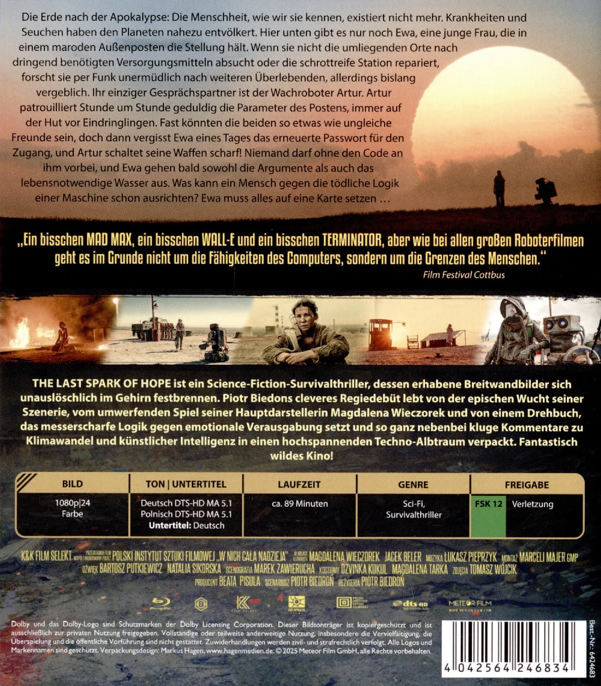 Die Erde nach der Apokalypse: Die Menschheit, wie wir sie kennen, existiert nicht mehr. Krankheiten und Seuchen haben den Planeten nahezu entvölkert. Hier unten gibt es nur noch Ewa, eine junge Frau, die in einem maroden Außenposten die Stellung hält. Wenn sie nicht die umliegenden Orte nach dringend benötigten Versorgungsmitteln absucht oder die schrottreife Station repariert, forscht sie per Funk unermüdlich nach weiteren Überlebenden, allerdings bislang vergeblich. Ihr einziger Gesprächspartner ist der Wachroboter Artur. Artur patrouilliert Stunde um Stunde geduldig die Parameter des Postens, immer auf der Hut vor Eindringlingen. Fast könnten die beiden so etwas wie ungleiche Freunde sein, doch dann vergisst Ewa eines Tages das erneuerte Passwort für den Zugang, und Artur schaltet seine Waffen scharf! Niemand darf ohne den Code an ihm vorbei, und Ewa gehen bald sowohl die Argumente als auch das lebensnotwendige Wasser aus. Was kann ein Mensch gegen die tödliche Logik einer Maschine schon ausrichten? Ewa muss alles auf eine Karte setzen … THE LAST SPARK OF HOPE ist ein Science-Fiction-Survivalthriller, dessen erhabene Breitwandbilder sich unauslöschlich im Gehirn festbrennen. Piotr Biedons cleveres Regiedebüt lebt von der epischen Wucht seiner Szenerie, vom umwerfenden Spiel seiner Hauptdarstellerin Magdalena Wieczorek und von einem Drehbuch, das messerscharfe Logik gegen emotionale Verausgabung setzt und so ganz nebenbei kluge Kommentare zu Klimawandel und künstlicher Intelligenz in einen hochspannenden Techno-Albtraum verpackt. Fantastisch wildes Kino!