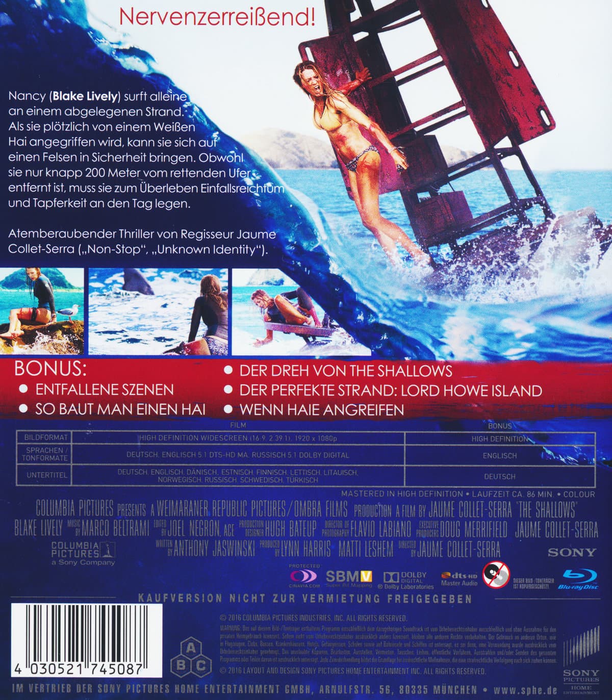| Zusatzinfos / Bonusmaterial beim Film dabei | Entfallene Szenen; Der Dreh von The Shallows-Gefahr aus der Tiefe; Wenn Haie angreifen; Der perfekte Strand: Lord Howe Island; Wie man einen Hai konstruiert; |
