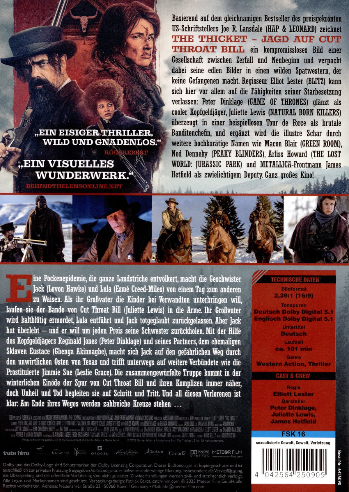 Eine Pockenepidemie, die ganze Landstriche entvölkert, macht die Geschwister Jack (Levon Hawke) und Lula (Esmé Creed-Miles) von einem Tag zum anderen zu Waisen. Als ihr Großvater die Kinder bei Verwandten unterbringen will, laufen sie der Bande von Cut Throat Bill (Juliette Lewis) in die Arme. Ihr Großvater wird kaltblütig ermordet, Lula entführt und Jack totgeglaubt zurückgelassen. Aber Jack hat überlebt – und er will um jeden Preis seine Schwester zurückholen. Mit der Hilfe des Kopfgeldjägers Reginald Jones (Peter Dinklage) und seines Partners, dem ehemaligen Sklaven Eustace (Gbenga Akinnagbe), macht sich Jack auf den gefährlichen Weg durch den unwirtlichen Osten von Texas und trifft unterwegs auf weitere Verbündete wie die Prostituierte Jimmie Sue (Leslie Grace). Die zusammengewürfelte Truppe kommt in der winterlichen Einöde der Spur von Cut Throat Bill und ihren Komplizen immer näher, doch Unheil und Tod begleiten sie auf Schritt und Tritt. Und all diesen Verlorenen ist klar: Am Ende ihres Weges werden zahlreiche Kreuze stehen … Basierend auf dem gleichnamigen Bestseller des preisgekrönten US-Schriftstellers Joe R. Lansdale (HAP & LEONARD) zeichnet THE THICKET – JAGD AUF CUT THROAT BILL ein kompromissloses Bild einer Gesellschaft zwischen Zerfall und Neubeginn und verpackt dabei seine edlen Bilder in einen wilden Spätwestern, der keine Gefangenen macht. Regisseur Elliot Lester (BLITZ) kann sich hier vor allem auf die Fähigkeiten seiner Starbesetzung verlassen: Peter Dinklage (GAME OF THRONES) glänzt als cooler Kopfgeldjäger, Juliette Lewis (NATURAL BORN KILLERS) überzeugt in einer beispiellosen Tour de Force als brutale Banditenchefin, und ergänzt wird die illustre Schar durch weitere hochkarätige Namen wie Macon Blair (GREEN ROOM), Ned Dennehy (PEAKY BLINDERS), Arliss Howard (THE LOST WORLD: JURASSIC PARK) und METALLICA-Frontmann James Hetfield als zwielichtigem Deputy. Ganz großes Kino!