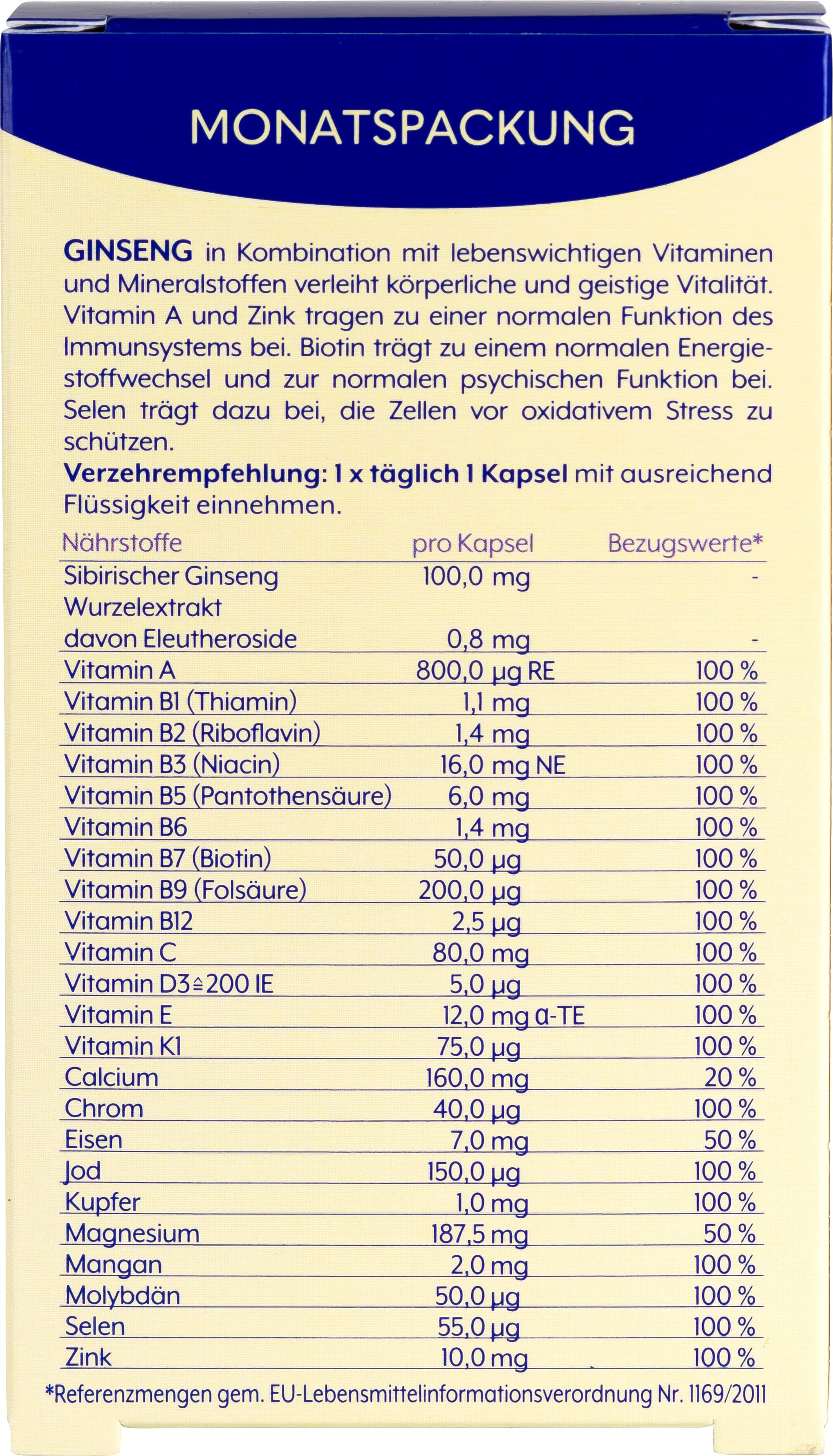 | Zutaten | Calciumcarbonat, Magnesiumoxid, Hydroxypropylmethylcellulose (Kapselhülle), Sibirischer Ginseng Wurzelextrakt, L-Ascorbinsäure, Eisenbisglycinat, Natriumselenat, D-Alpha-Tocopherylacetat, Nicotinamid, Zinkoxid, Calcium-D-pantothenat, Mangansulfat, Retinylacetat, Natriummolybdat (Molybdän(VI), Trennmittel: Magnesiumsalze der Speisefettsäuren, Chrompicolinat, Kupfersulfat, Cyanocobalamin, Cholecalciferol, Pyridoxinhydrochlorid, Phyllochinon (Phytomenadion), Thiaminhydrochlorid, Riboflavin, Pteroylmonoglutaminsäure, Kaliumiodid, D-Biotin. |