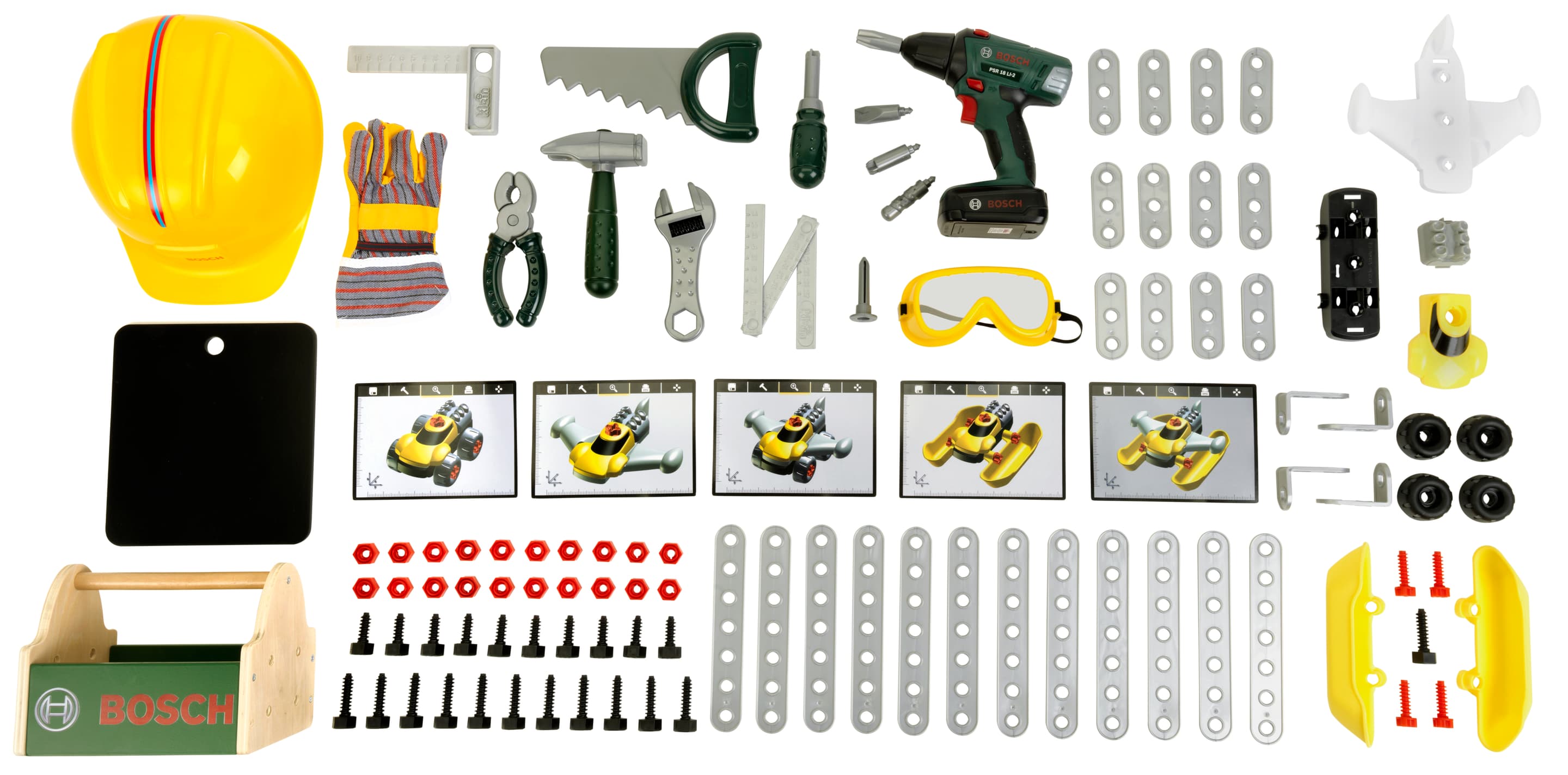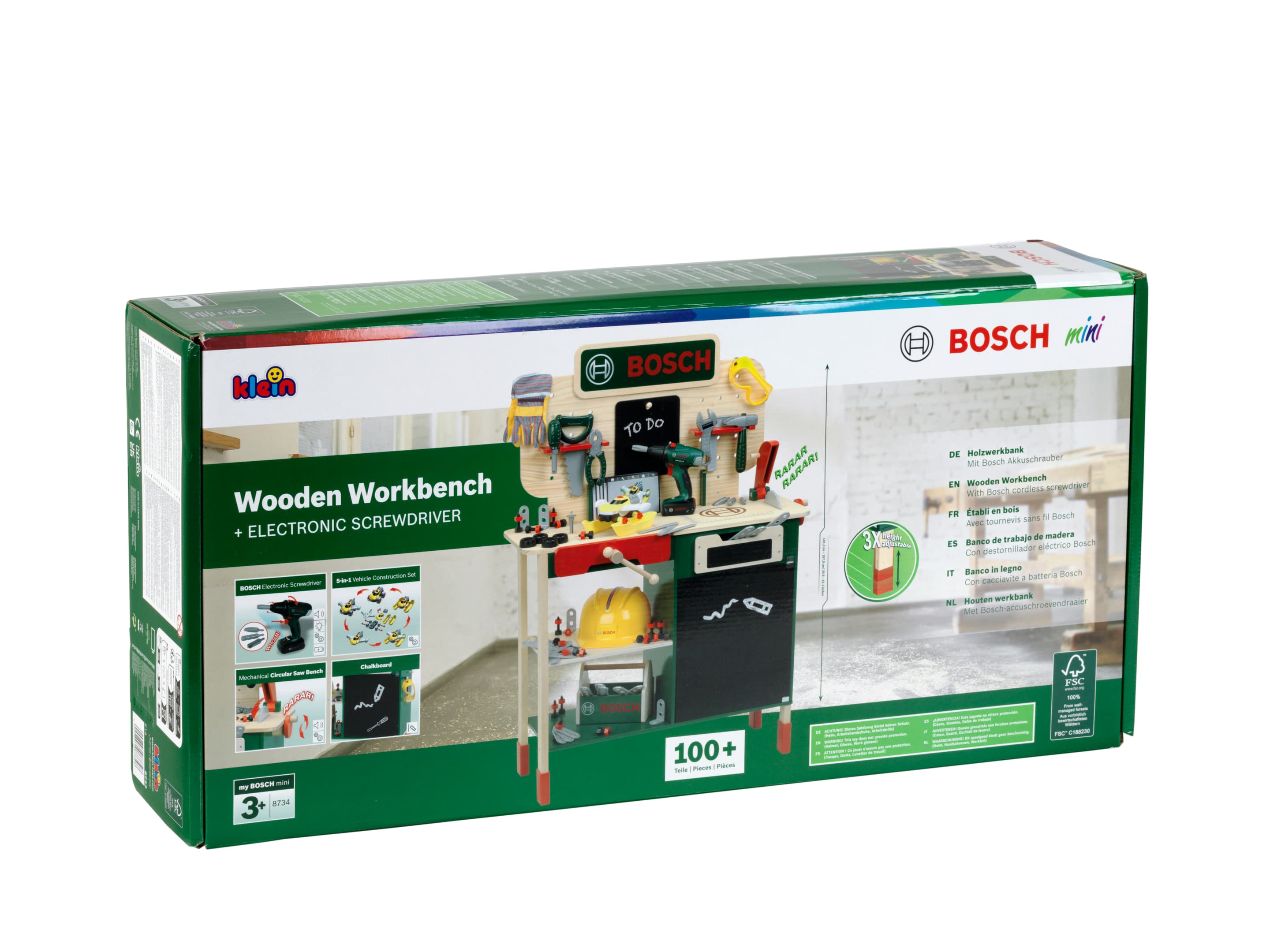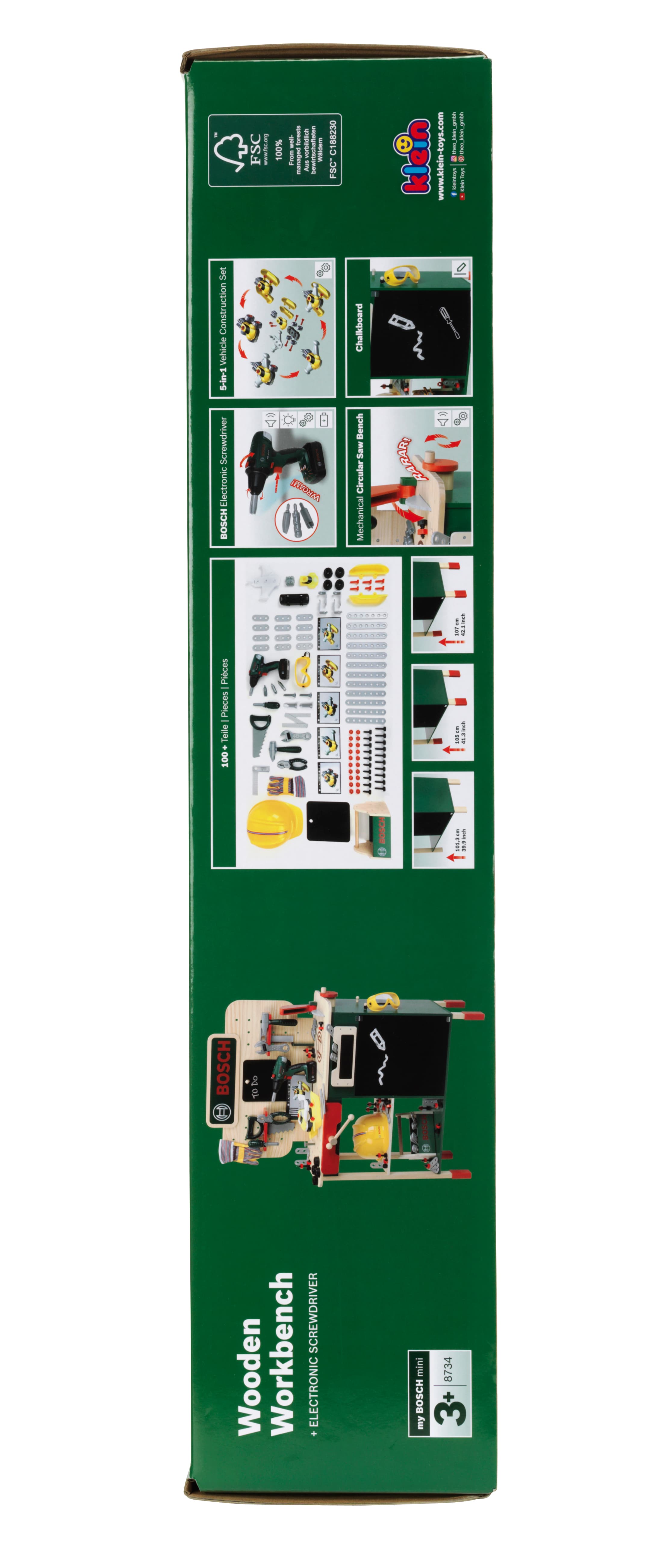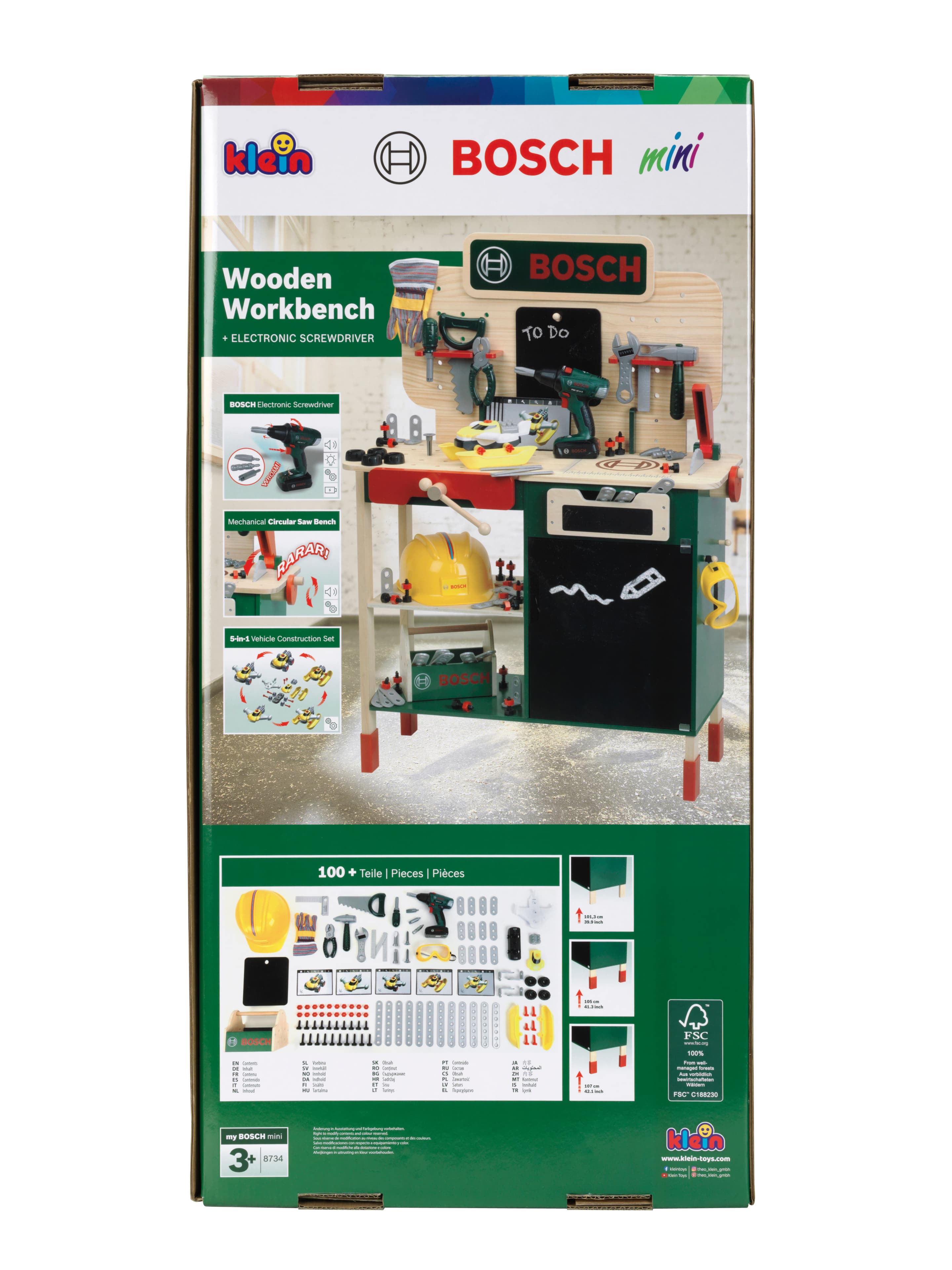 Die höhenverstellbare Kinderwerkbank wird im beliebten Bosch-Design aus Holz hergestellt. Die Arbeitsplatte bietet viele Lernfunktionen sowie praktische Ablageflächen für den batteriebetriebenen Bosch-Akkuschrauber und die coole mechanische Kreissäge mit Sound. Unter der Arbeitsplatte kann das zahlreiche Zubehör verstaut werden - auf den Regalböden, in der Schublade und in der robusten Werkzeug-Box finden Schraubendreher und -schlüssel, Hammer, Zange, Säge, Winkel, Metermaß, Schraubstock sowie Schrauben, Muttern und Schraubelemente in verschiedenen Größen und Formen Platz. Viele Kinderwerkzeuge können auch mit den praktischen Haken an der Rückwand aufgehängt werden. Besonders gut kommen bei den kleinen Handwerker*innen Helm und Sicherheitshandschuhe an sowie das 5in1 Montagefahrzeug und die beschreibbare Tür, auf der Baupläne oder Aufgaben festgehalten werden können (die Kreide ist nicht im Lieferumfang enthalten).