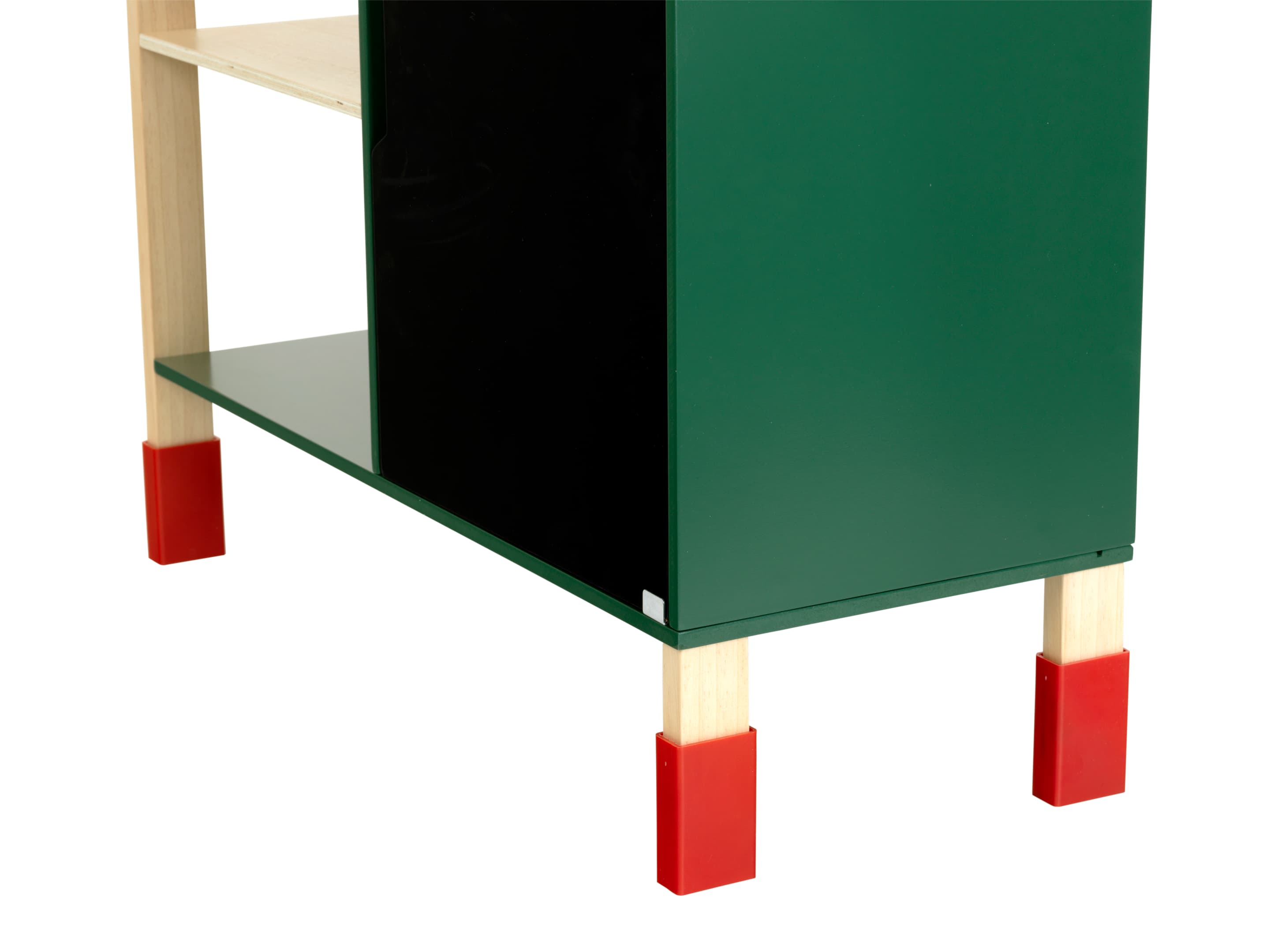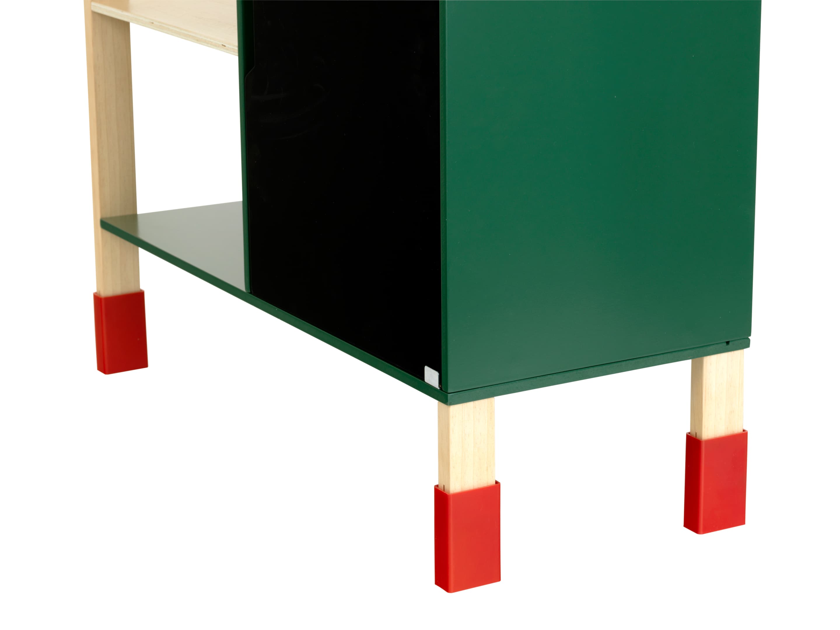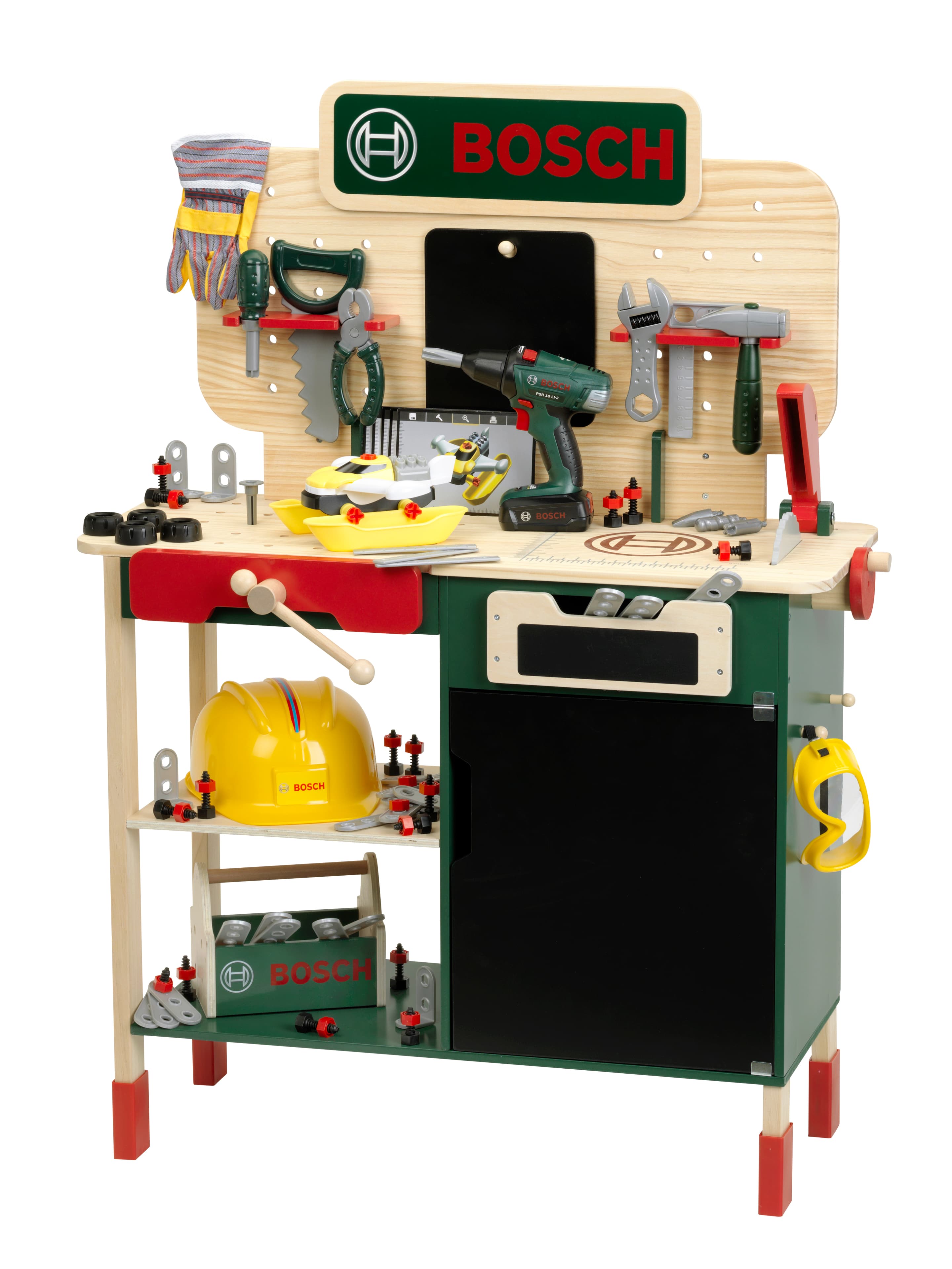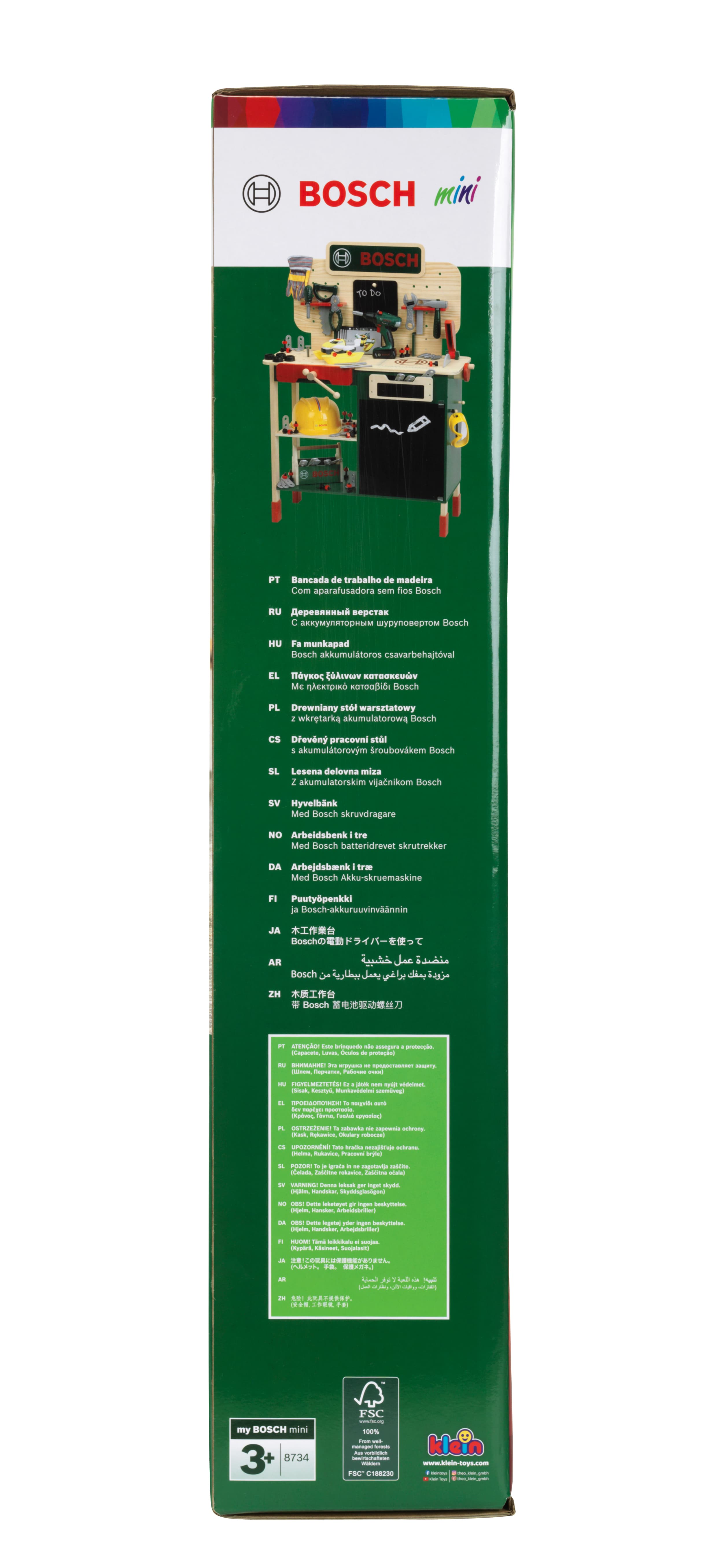 Die höhenverstellbare Kinderwerkbank wird im beliebten Bosch-Design aus Holz hergestellt. Die Arbeitsplatte bietet viele Lernfunktionen sowie praktische Ablageflächen für den batteriebetriebenen Bosch-Akkuschrauber und die coole mechanische Kreissäge mit Sound. Unter der Arbeitsplatte kann das zahlreiche Zubehör verstaut werden - auf den Regalböden, in der Schublade und in der robusten Werkzeug-Box finden Schraubendreher und -schlüssel, Hammer, Zange, Säge, Winkel, Metermaß, Schraubstock sowie Schrauben, Muttern und Schraubelemente in verschiedenen Größen und Formen Platz. Viele Kinderwerkzeuge können auch mit den praktischen Haken an der Rückwand aufgehängt werden. Besonders gut kommen bei den kleinen Handwerker*innen Helm und Sicherheitshandschuhe an sowie das 5in1 Montagefahrzeug und die beschreibbare Tür, auf der Baupläne oder Aufgaben festgehalten werden können (die Kreide ist nicht im Lieferumfang enthalten).