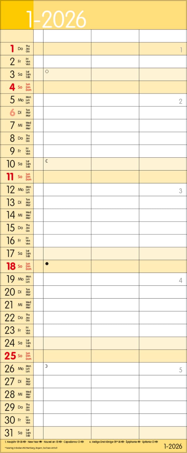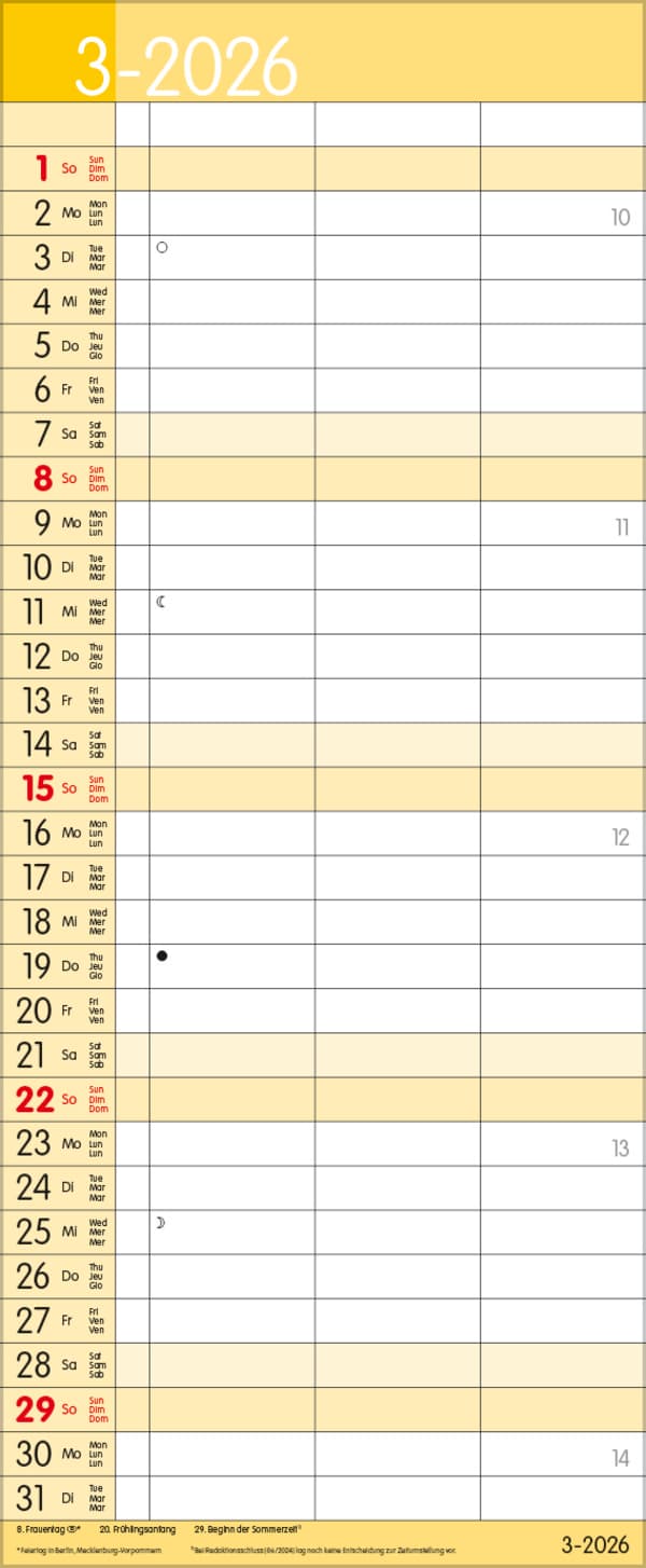 Korsch Familienkalender - Produktmerkmale Übersichtlicher Familienplaner mit 3 großen Spalten; sehr stabile Rückwand; 19 x 46 cm Terminkalender mit viel Platz für Eintragungen, ohne störende Bilder in den Spalten leichte Beschreibbarkeit, auch mit Bunt- und Bleistiften Mehrsprachiges Kalendarium (d,e,f,i) mit regionalen Feiertagen für Deutschland, Österreich und Schweiz Farblich hervorgehobene Sonn- und Feiertage, sowie Anzeige der Zeitumstellung Gedruckt auf dickem und umweltfreundlichem FSC Papier Korsch Timer for 2 - Jahreskalender Dieser Wandkalender hilft Ihnen dabei alle wichtigen Termine stets im Blick zu haben. Mit drei Spalten zum Eintragen von Geburtstagen, Terminen und Erinnerungen bietet dieser Jahreskalender viel Platz für Notizen. Dadurch ist es auch möglich mehrere Termine in einen Tag zu schreiben. Er eignet sich perfekt für die Organisation des Ehe- oder Familienlebens. Neben dem gesamten Kalenderjahr enthält der Wandplaner auch eine Vorschaubis März des Folgejahres. Weitere Informationen wie Mondphasen, Ferientermine und Feiertage (auch regionale) sowie deutlich lesbare Kalenderwochen runden den Kalender ab und sorgen für einen vollständigen Überblick Ihres Jahres.