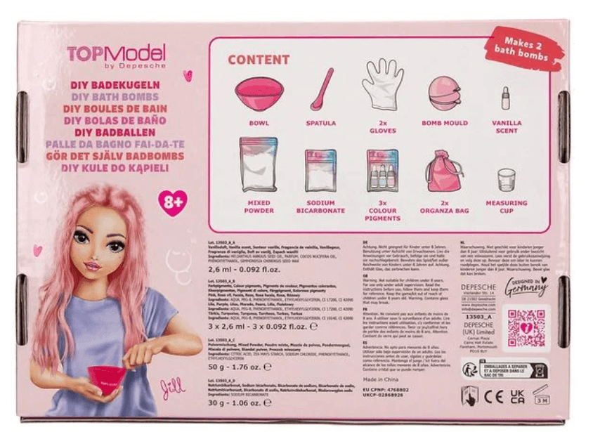 Badespaß zum Selbermachen: Mit dem DIY-Set von TOPModel kann man kinderleicht 2 Badebomben herstellen. Alles, was man dazu braucht, ist dabei: Schüssel, Spachtel, Handschuhe, Form, Vanille-Duft, Mix-Pulver, Natriumbicarbonat, Farbpigmente, Messbecher und Organza-Säckchen zum Verschenken. Mit anschaulicher Anleitung.