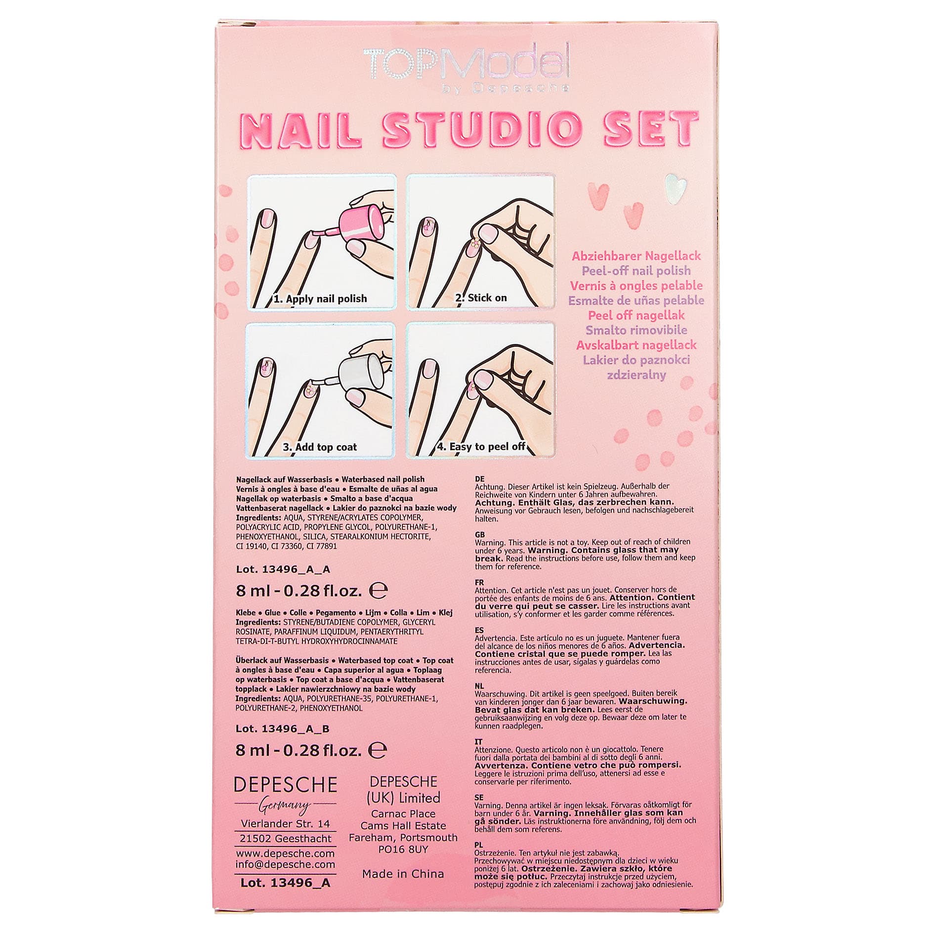 Lieferumfang: Mit dabei: rosa Nagellack (auf Wasserbasis, 8 ml), transparenter Überlack zum Fixieren (auf Wasserbasis, 8 ml) und viele süße Nagelsticker.