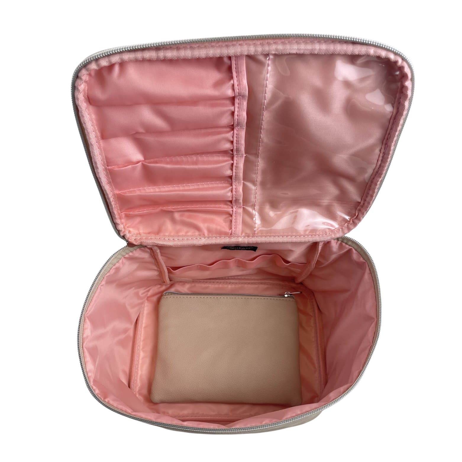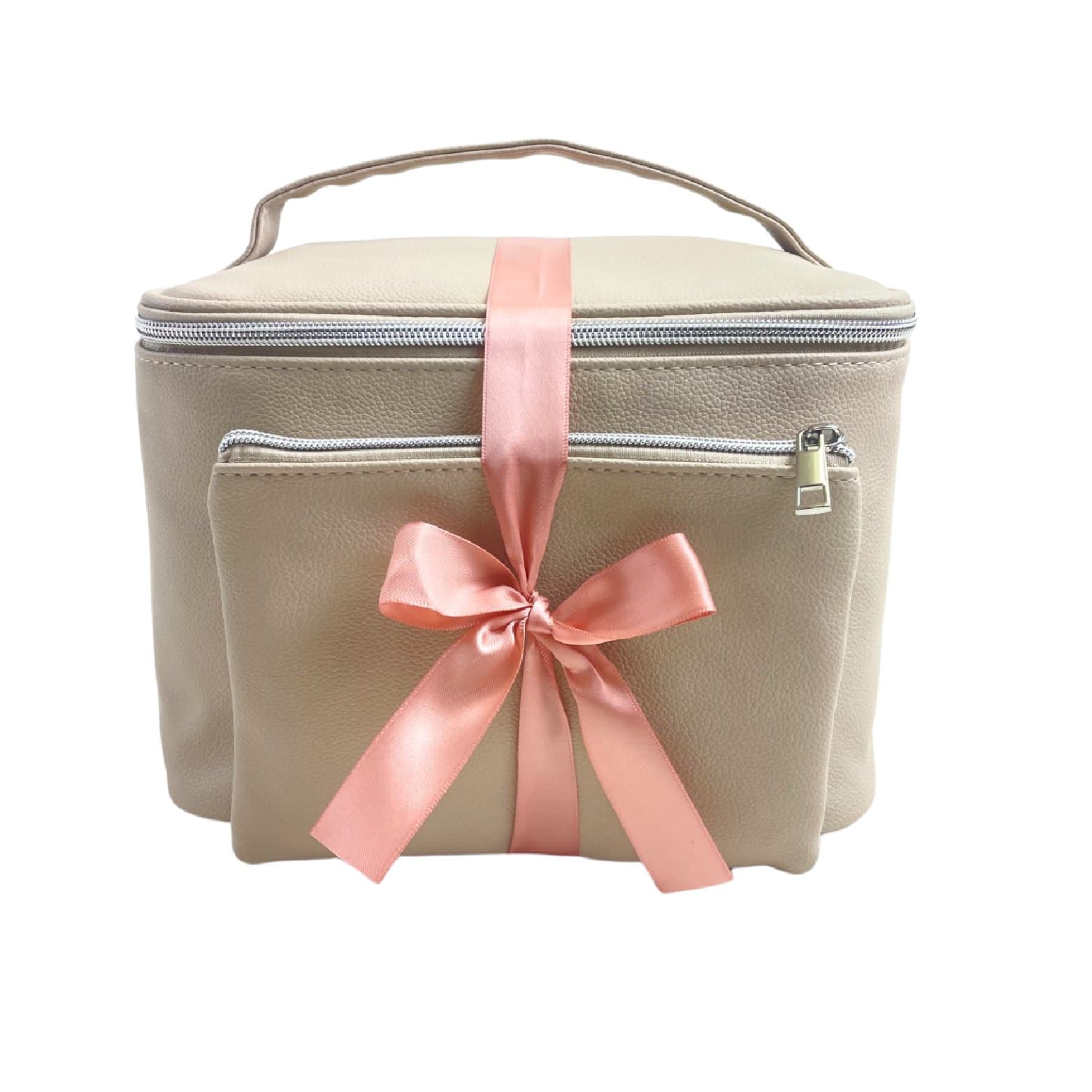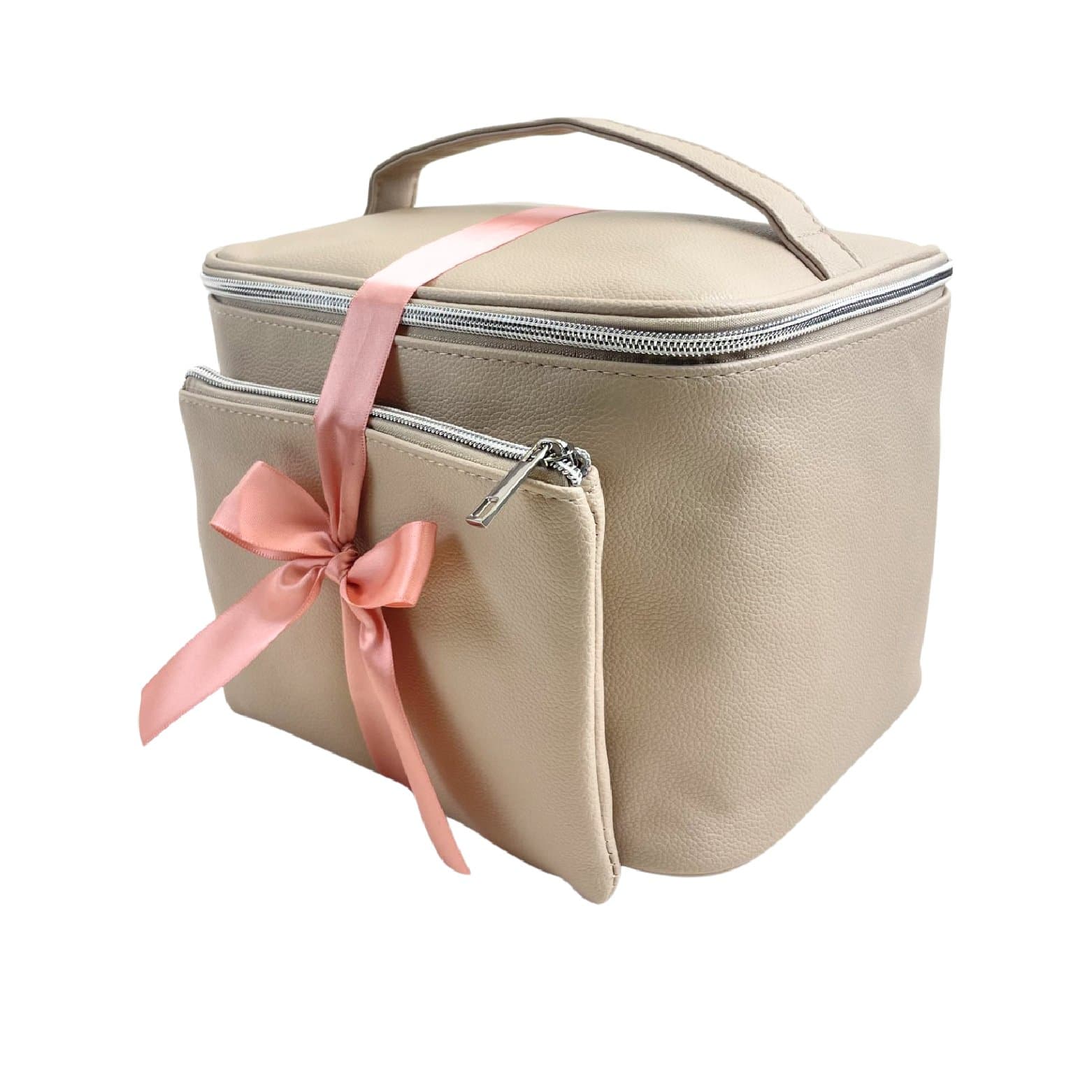 Das Kosmetikkoffer Set besteht aus einem hochwertigem und wasserabweisendem Kunstleder. Darüber hinaus ist der Kosmetikkoffer mit einem stilvollen und stabilen Doppelreißverschluss ausgestattet. Die Innenseite des Kosmetikkoffers ist unter anderem mit separaten Fächern für Make-Up Pinsel ausgestattet. Eine PVC-Schicht unter den Fächern sorgt für eine leichte Reinigung. Die dazu kombinierte Schminktasche kann für Lippenstifte, Lidschatten oder sogar als Geldbeutel verwendet werden. Der Kosmetikkoffer ist perfekt für den täglichen Gebrauch oder auf Reisen. Durch das schöne Geschenkband ist er auch ein tolles Geschenk zu Weihnachten zum Valentinstag oder auch zum Muttertag.