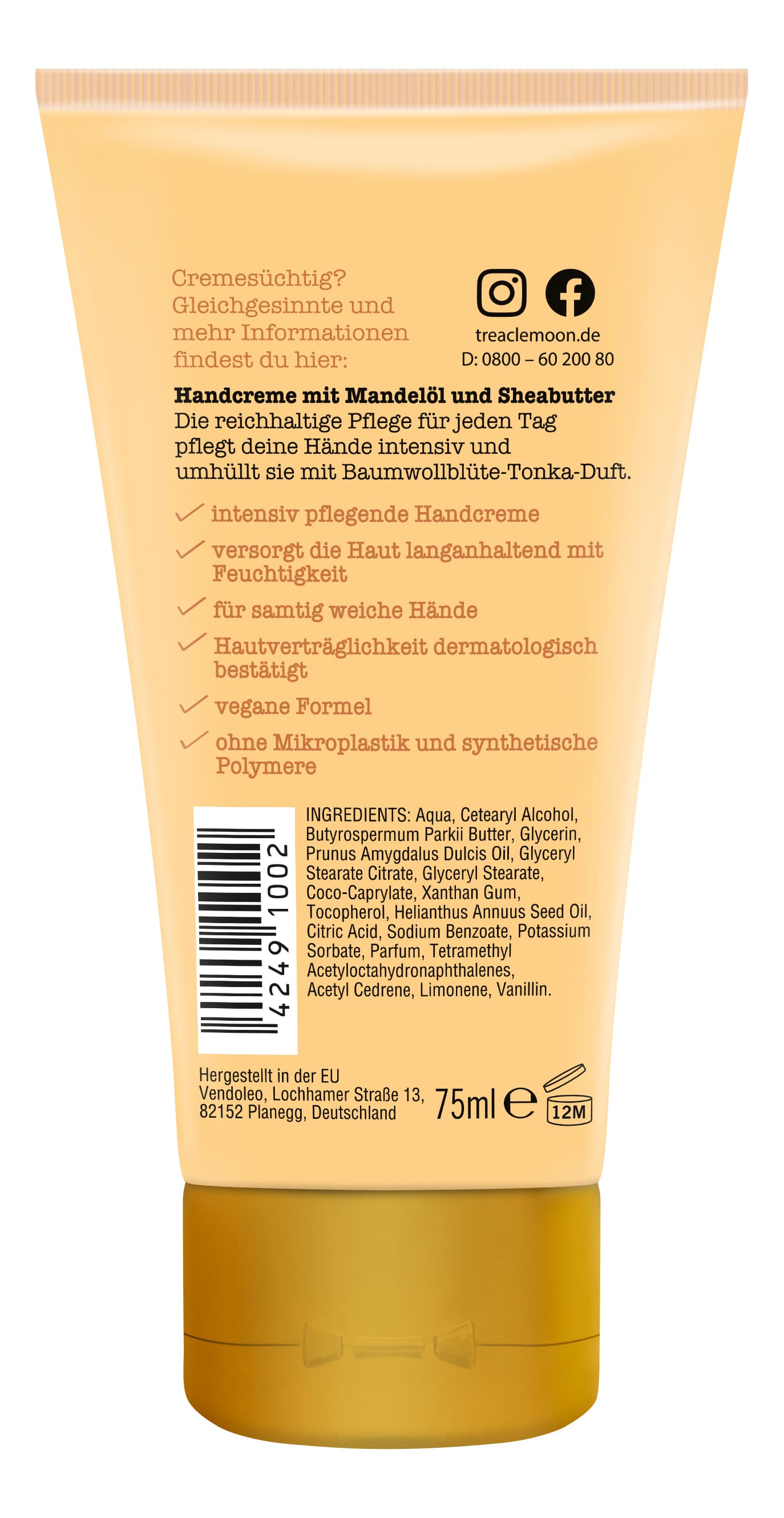 | Inhaltsstoffe | Aqua, Cetearyl Alcohol, Butyrospermum Parkii Butter, Glycerin, Prunus Amygdalus Dulcis Oil, Glyceryl Stearate Citrate, Glyceryl Stearate, Coco-Caprylate, Xanthan Gum, Tocopherol, Helianthus Annuus Seed Oil, Citric Acid, Sodium Benzoate, Potassium Sorbate, Parfum, Tetramethyl Acetyloctahydronaphthalenes, Acetyl Cedrene, Limonene, Vanillin. |