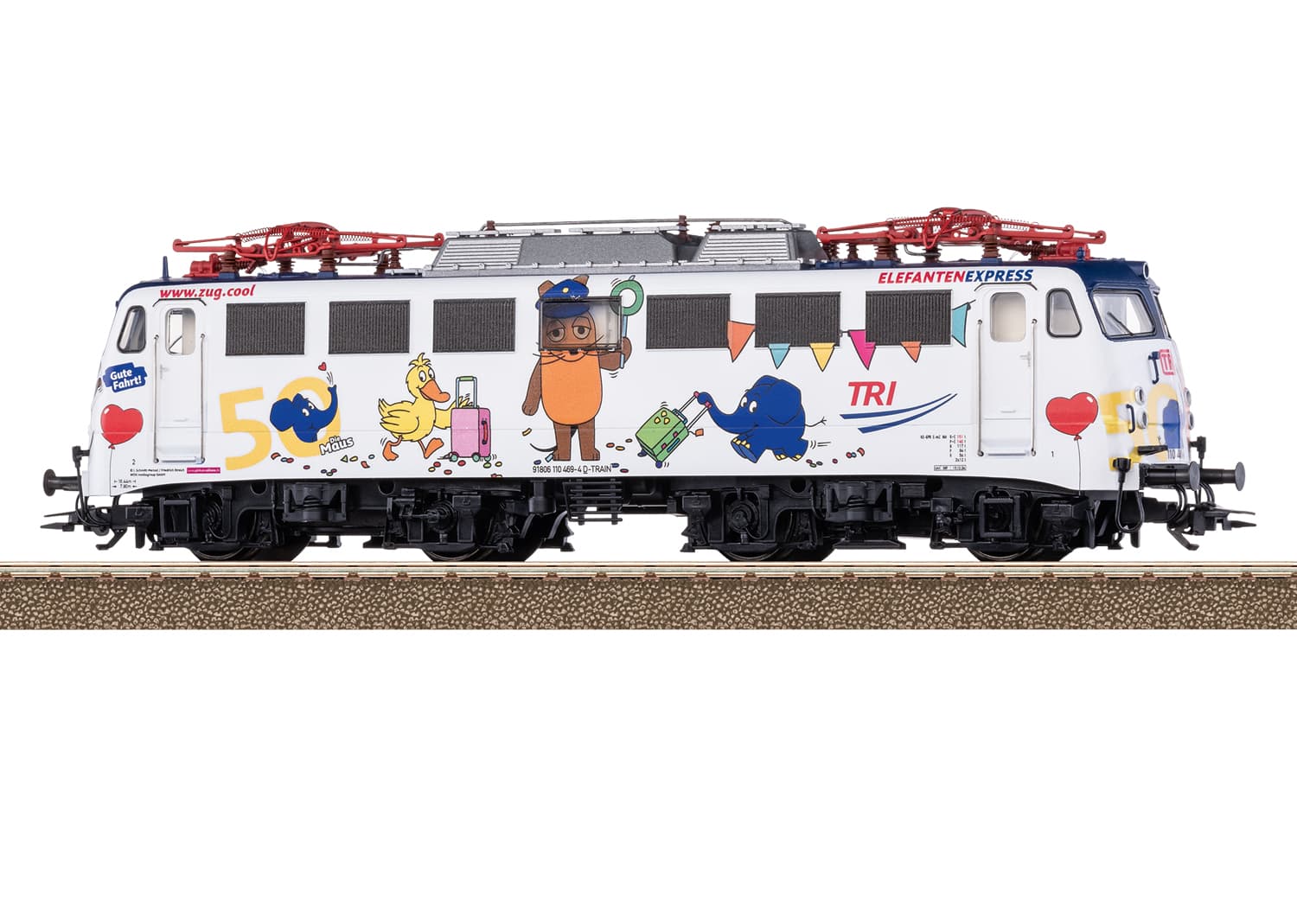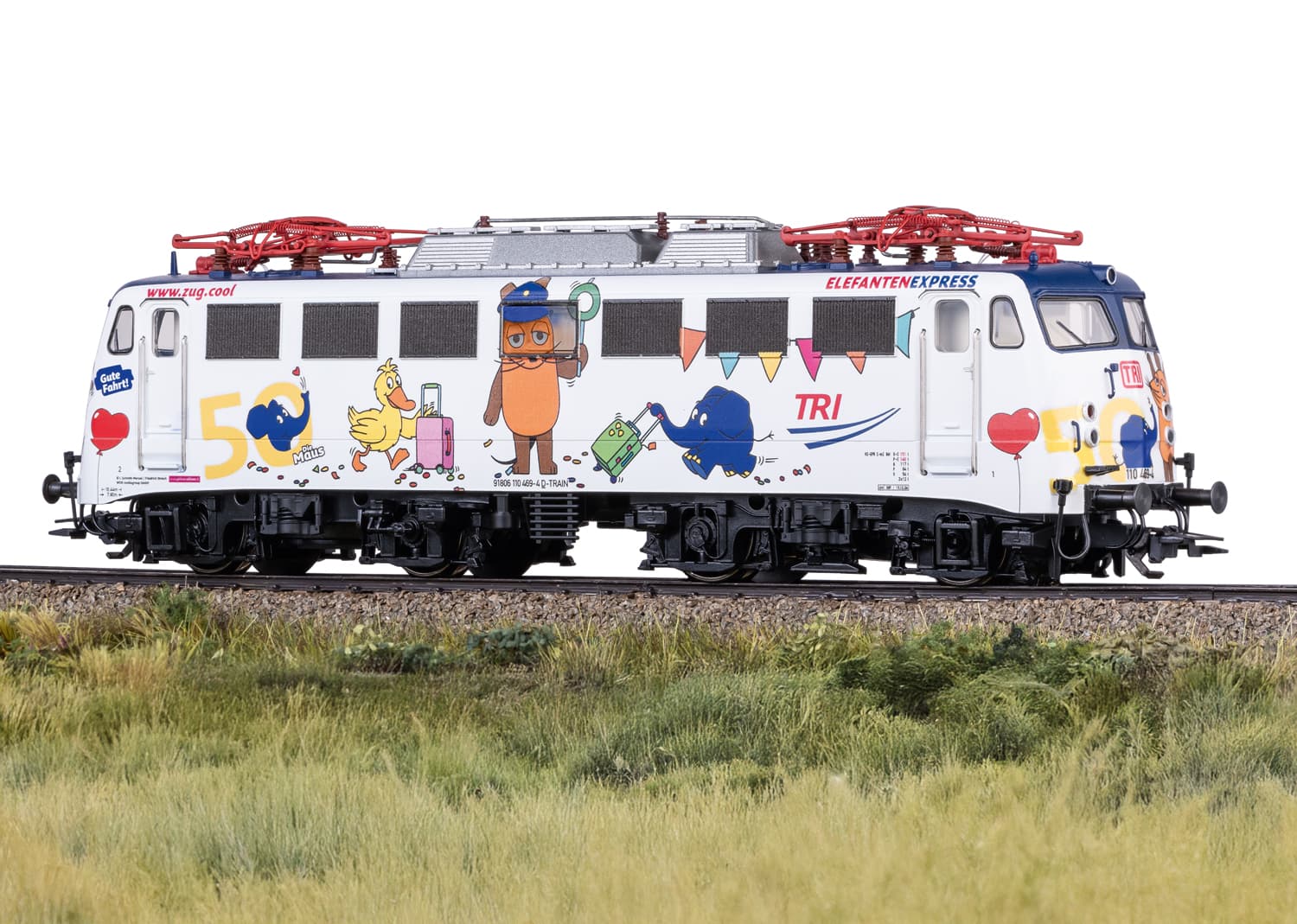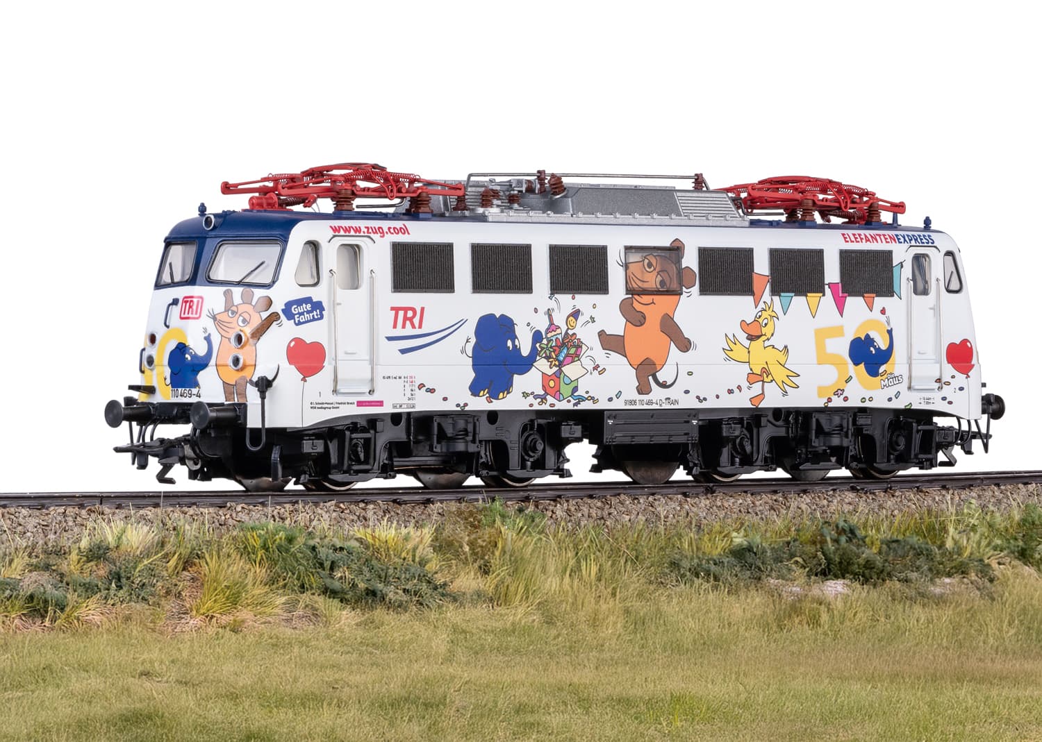 Vorbild: Elektrolokomotive Baureihe 110 der Train Rental GmbH (TRI). Lokkasten mit aerodynamischer Front, der sogenannten Bügelfalte, mit rechteckigen Klatte-Lüftergittern und Maschinenraumfenstern. Betriebsnummer 110 469-4. Betriebszustand ab Januar 2025 in auffälliger Gestaltung als "Elefantenexpress".