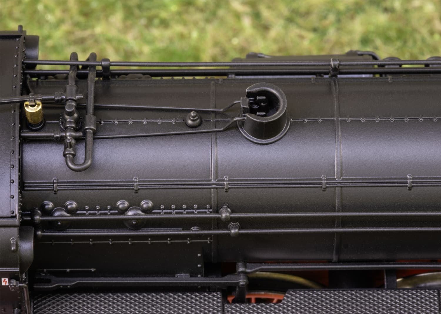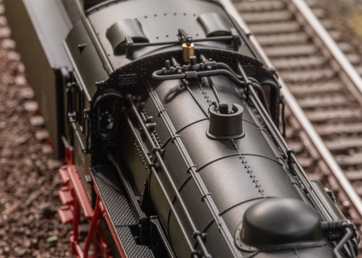 Modell: Mit Digital-Decoder und umfangreichen Geräuschfunktionen. Geregelter Hochleistungsantrieb mit Schwungmasse im Kessel. 4 Achsen angetrieben. Haftreifen. Lokomotive und Tender weitgehend aus Metall. Serienmäßig eingebauter Raucheinsatz, mit geschwindigkeitsabhängigem, dynamischem Rauchausstoß. Fahrtrichtungsabhängig wechselndes Zweilicht-Spitzensignal konventionell in Betrieb, digital schaltbar. Führerstandbeleuchtung und Feuerbüchsenflackern jeweils separat digital schaltbar. Beleuchtung mit wartungsfreien warmweißen und roten Leuchtdioden (LED). Mit Pufferspeicher. Schwenkbare Führerstandtüren und Imitation der Vorhänge zwischen Führerstand und Tender. Kurzkupplung mit Kinematik zwischen Lok und Tender. Am Tender kinematikgeführte Kurzkupplung mit NEM-Schacht. Pufferhöhe an Lok und Tender nach NEM. Befahrbarer Mindestradius R2 437,5 mm. Kolbenstangenschutzrohre und Bremsschläuche liegen bei. Länge über Puffer 26,0 cm. Hinweis: Ab Werk für Mindestradius R 2 (437,5 mm) spezifiziert; bei vorsichtiger/ reduzierter Fahrweise ist der Betrieb auf R 1 (ca. 360 mm) möglich.