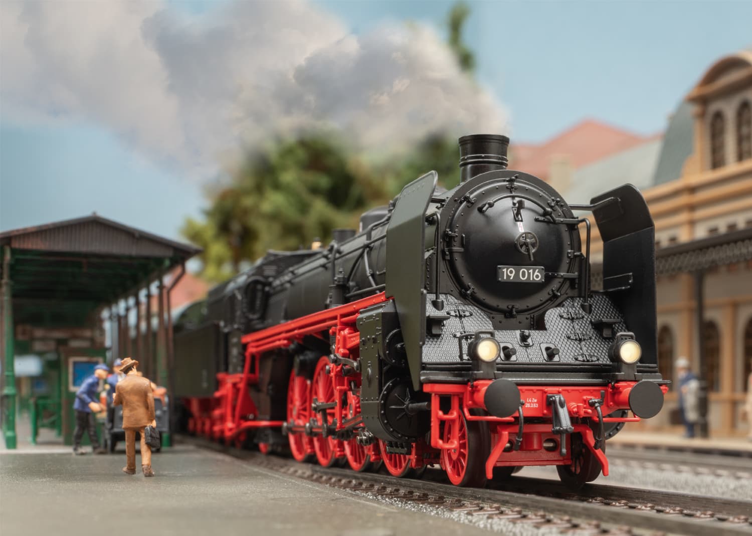 Vorbild: Schnellzug-Dampflokomotive Baureihe 19.0 "Sachsenstolz" (Sächsische Gattung XX HV), mit sächsischem Kohlen-Schlepptender 2´2 T31. Deutsche Reichsbahn der DDR (DR/DDR). Mit großen Windleitblechen. Lok-Betriebsnummer 19 016. Betriebszustand Epoche IIIa, Anfang der 1950er Jahre.