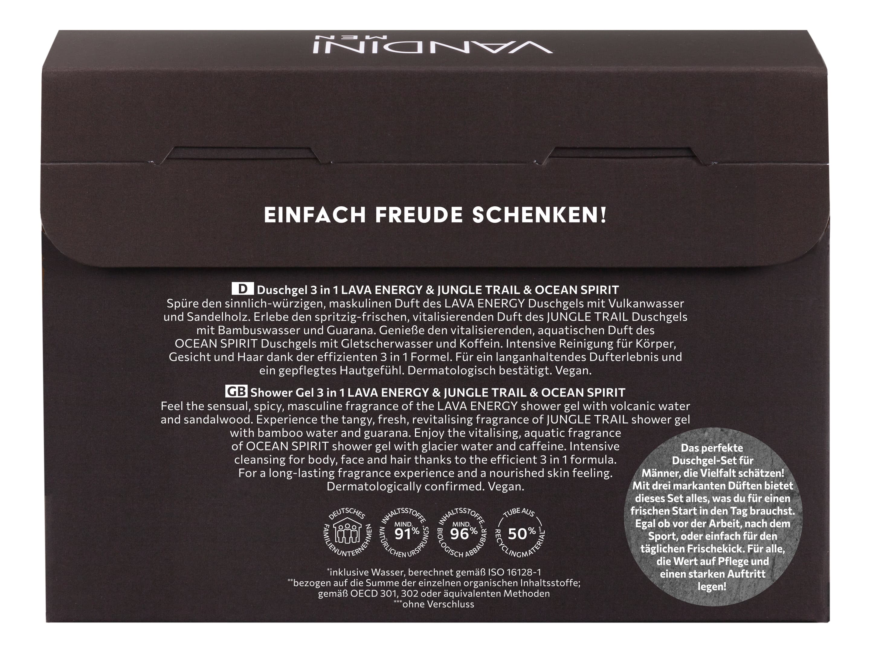Spüre den sinnlich-würzigen, maskulinen Duft des LAVA ENERGY Duschgels mit Vulkanwasser und Sandelholz. Erlebe den spritzig-frischen, vitalisierenden Duft des JUNGLE TRAIL Duschgels mit Bambuswasser und Guarana. Genieße den vitalisierenden, aquatischen Duft des OCEAN SPIRIT Duschgels mit Gletscherwasser und Koffein. Intensive Reinigung für Körper, Gesicht und Haar dank der effizienten 3 in 1 Formel. Für ein langanhaltendes Dufterlebnis und ein gepflegtes Hautgefühl. Dermatologisch bestätigt. Vegan. Das perfekte Duschgel-Set für Männer, die Vielfalt schätzen! Mit drei markanten Düften bietet dieses Set alles, was du für einen frischen Start in den Tag brauchst. Egal ob vor der Arbeit, nach dem Sport, oder einfach für den täglichen Frischekick. Für alle, die Wert auf Pflege und einen starken Auftritt legen!