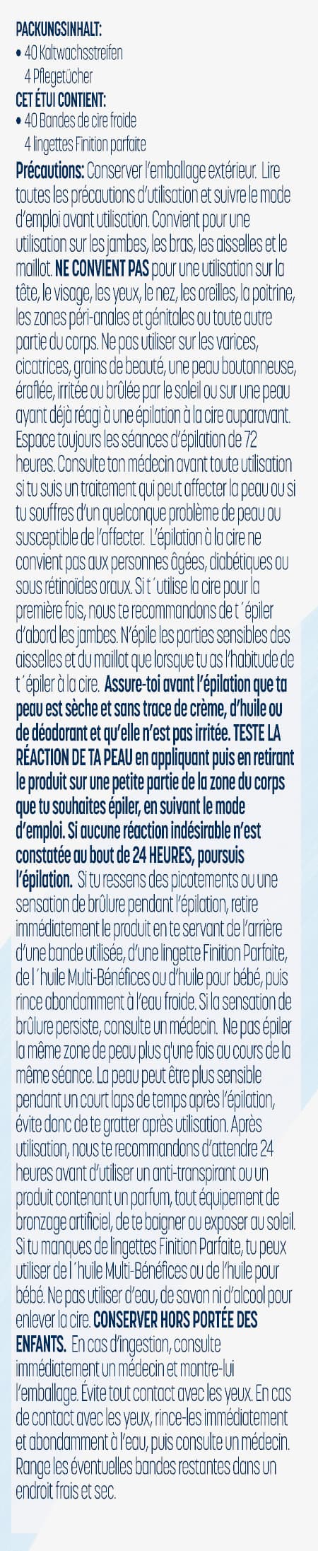 Lieferumfang20 x bzw. 40 x Kaltwachsstreifen, 2 x Pflegetücher und 1 x Gebrauchsanweisung.