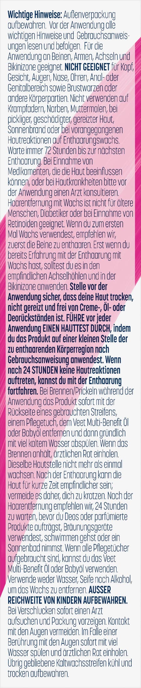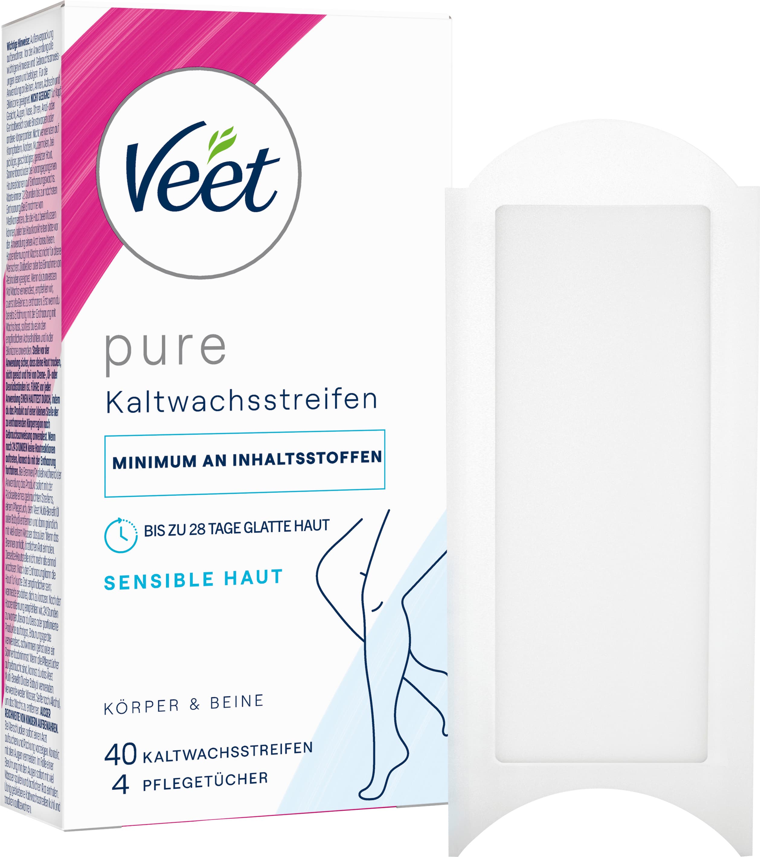 Veet Pure Kaltwachsstreifen Körper&Beine - für sensible Haut Du hast keine Lust mehr auf Stoppeln und ständiges Rasieren? Dann sind die Veet Kaltwachsstreifen genau das Richtige für dich! In 4 einfachen Schritten schenken dir die Wachsstreifen bis zu 28 Tage seidig glatte Haut. Die Waxing Streifen enthalten ein Minimum an Inhaltsstoffen und sind dermatologisch getestet. Das Kaltwachs greift selbst kurze Haare, entfernt sie schnell und einfach mitsamt der Wurzel und ermöglicht ein langanhaltendes Glättegefühl. Vor der Anwendung ist kein Reiben oder Erwärmen des Wachs nötig. Für eine unkomplizierte Haarentfernung ohne Rasieren - und somit auch weniger stoppeliges Nachwachsen ohne Risiko für Schnittverletzungen. Die Kaltwachsstreifen eignen sich besonders gut für die Enthaarung der sensiblen Haut der Arme und Beine. Mithilfe der enthaltenen Pflegetücher lassen sich Wachsreste auf der Haut leicht entfernen. Schnelle und einfache Haarentfernung Für bis zu 28 Tage seidig glatte Haut Minimum an Inhaltsstoffen Dermatologisch getestet Für sensible Haut geeignet 8 Pflegetücher Sicherheitshinweise: Für die Anwendung an Beinen, Armen, Achseln und Bikinizone geeignet. NICHT GEEIGNET für Kopf, Gesicht, Augen, Nase, Ohren, Anal- oder Genitalbereich sowie Brustwarzen oder andere Körperpartien. Nicht verwenden auf Krampfadern, Narben, Muttermalen, bei pickliger, geschädigter, gereizter Haut, Sonnenbrand oder bei vorangegangenen Hautreaktionen auf Enthaarungswachs. Warten Sie immer 72 Stunden bis zur nächsten Enthaarung. Bei Einnahme von Medikamenten, die die Haut beeinflussen können, oder bei Hautkrankheiten bitte vor der Anwendung einen Arzt konsultieren. Haarentfernung mit Wachs ist nicht für ältere Menschen, Diabetiker oder bei Einnahme von Retinoiden geeignet. Wenn Sie zum ersten Mal Wachs verwenden, empfehlen wir, zuerst die Beine zu enthaaren. Erst wenn Sie bereits Erfahrung mit Wachs haben, sollten Sie es in den empfindlichen Achselhöhlen und in der Bikinizone anwenden. Stellen Sie vor der Anwendung sicher, dass Ihre Haut trocken, nicht gereizt und frei von Creme-,Öl-oder Deorückständen ist. FÜHREN SIE vor jeder Anwendung EINEN HAUTTEST DURCH, indem Sie das Produkt auf einer kleinen Stelle der zu enthaarenden Körperregion nach Gebrauchsanweisung anwenden. Wenn nach 24 STUNDEN keine Hautreaktionen auftreten, können Sie mit der Enthaarung fortfahren. Bei Brennen/Prickeln während der Anwendung das Produkt sofort mit der Rückseite eines gebrauchten Streifens, einem Pflegetuch oder Babyöl entfernen und dann gründlich mit viel kaltem Wasser abspülen.Wenn das Brennen anhält, ärztlichen Rat einholen. Denselben Bereich nicht mehr als einmal während einer Anwendung wachsen. Nach der Enthaarung kann die Haut für kurze Zeit empfindlicher sein; vermeiden Sie es daher sich zu kratzen. Nach der Haarentfernung empfehlen wir 24 Stunden zu warten, bevor Sie Deos oder parfümierte Produkte auftragen, Bräunungsgeräte verwenden, schwimmen gehen oder ein Sonnenbad nehmen. ​