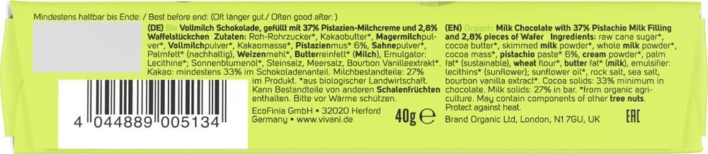| Zutaten | Roh-Rohrzucker*, Kakaobutter*, MAGERMILCHpulver*,VOLLMILCHpulver*, Kakaomasse*, PISTAZIENmus* 6%, SAHNEpulver*, Palmfett* (nachhaltig), WEIZENmehl*, BUTTERreinfett* (MILCH), Emulgator: Lecithine*; Sonnenblumenöl*, Steinsalz, Meersalz, Bourbon Vanilleextrakt*. |