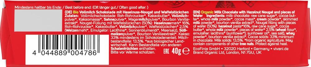 | Zutaten | Vollmilchschokolade: Roh-Rohrzucker*, Kakaobutter*, VOLLMILCHPULVER*, Kakaomasse*, SAHNEPULVER*, MAGERMILCHPULVER*, Bourbon Vanilleextrakt*, Nougat-Füllung mit Waffelstückchen (50%): HASELNUSSMARK* 16%, Roh-Rohrzucker*, Kakaobutter*, VOLLMILCHPULVER*, Waffelstückchen* 2,5% (WEIZENMEHL*, Emulgator: Lecithine*; Sonnenblumenöl*, Meersalz), SÜSSMOLKENPULVER*, Bourbon Vanilleextrakt*. |