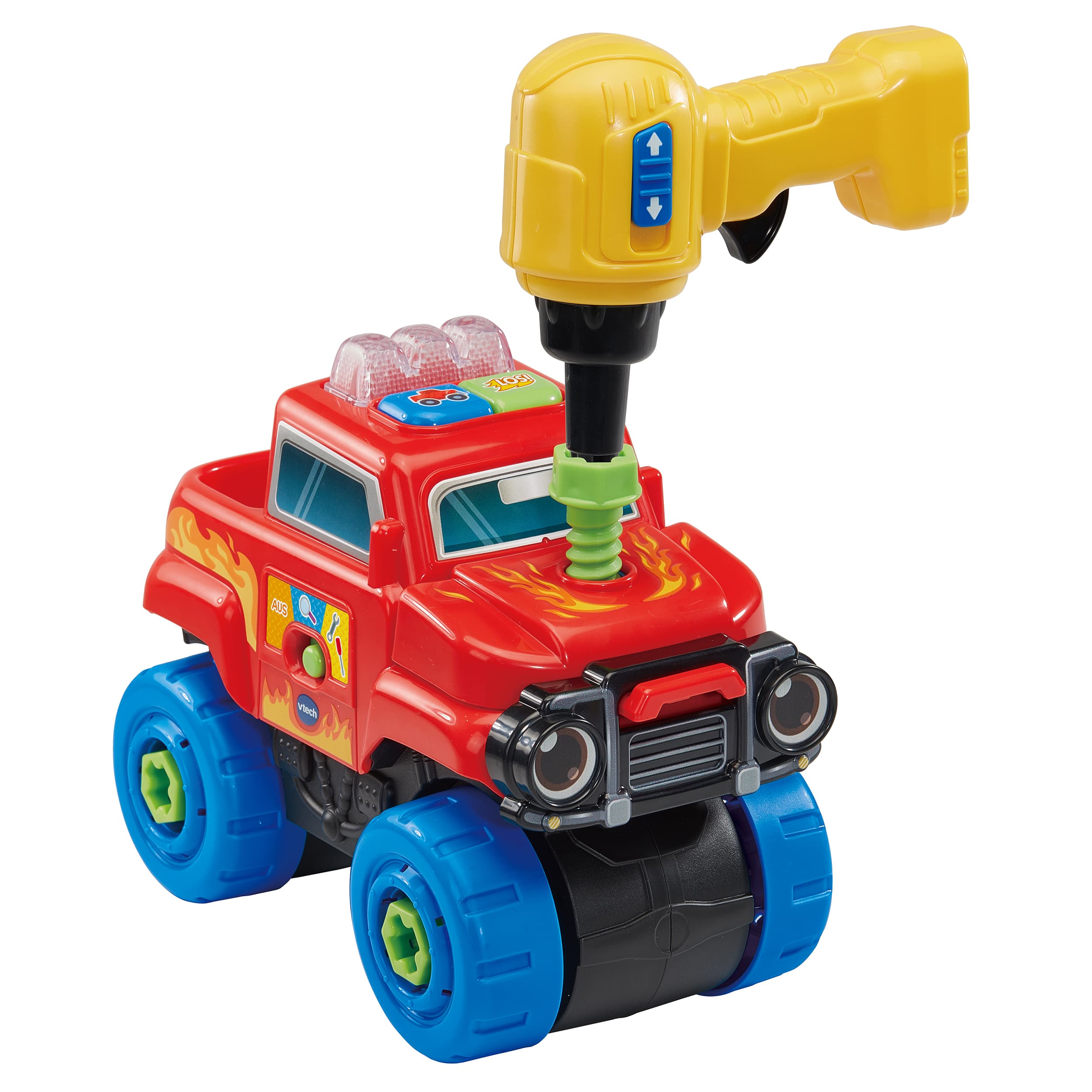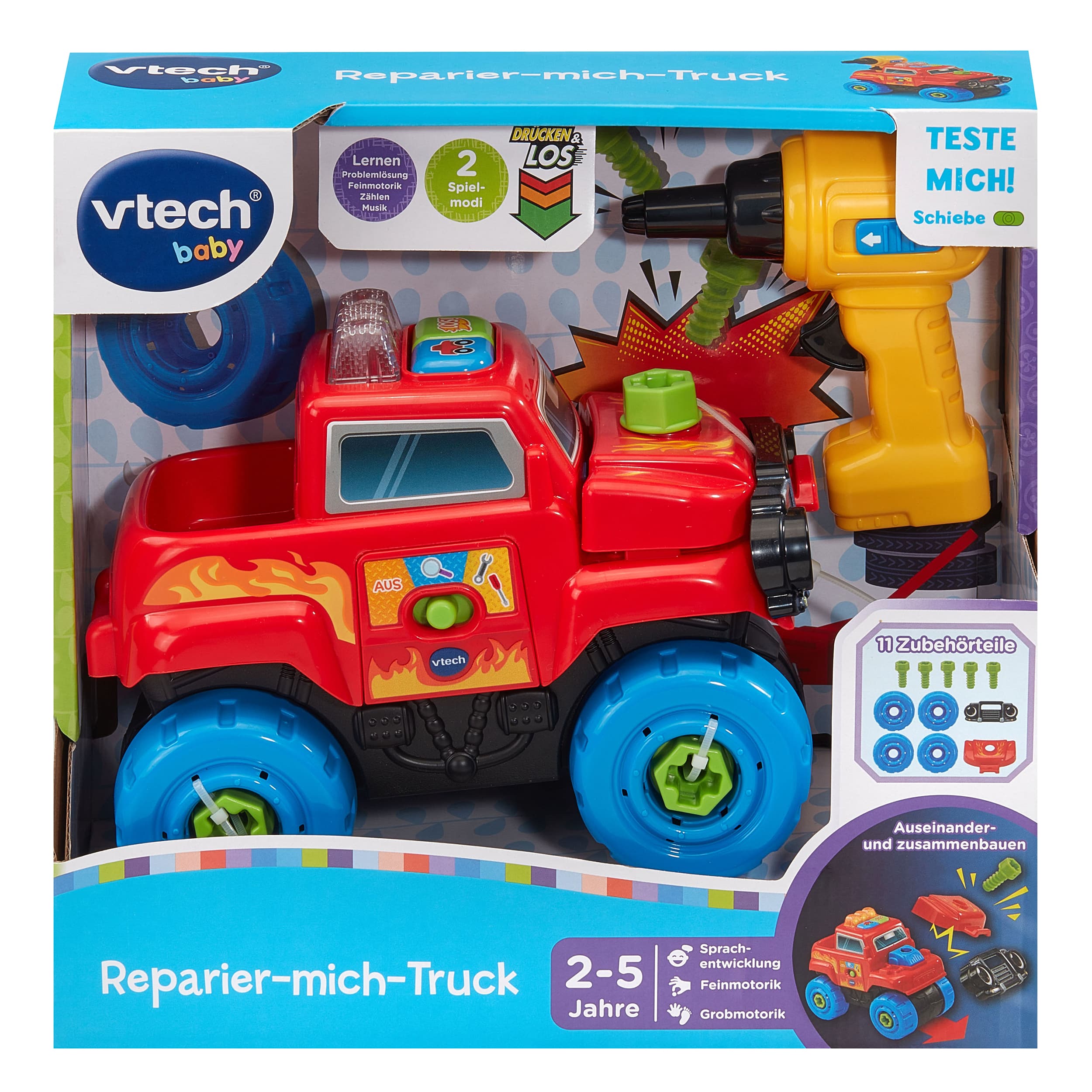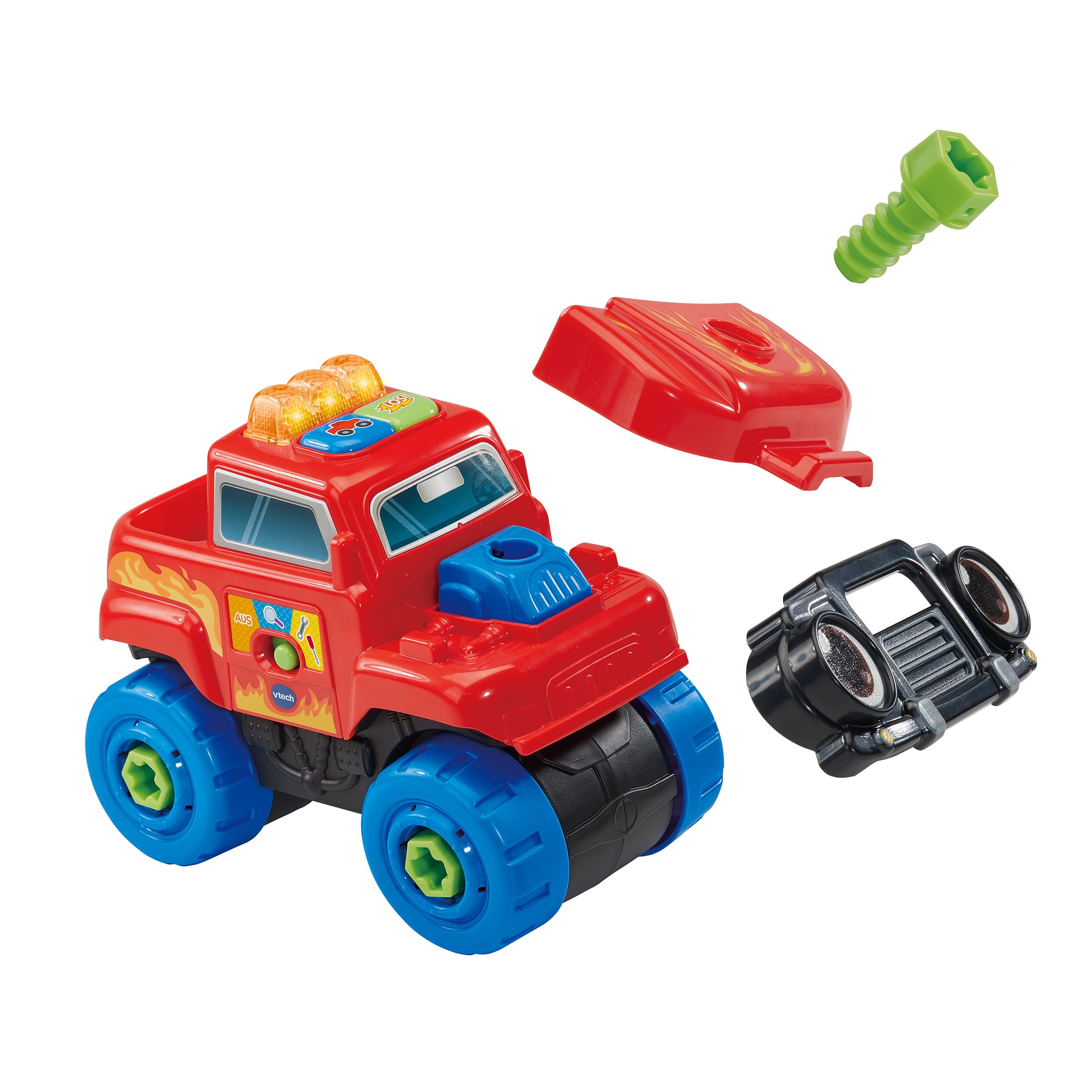 Schrauben, Lernen, Fahren - hier wird Reparieren zum Kinderspiel! Truck, der mit 11 Zubehörteilen und einem Akkuschrauber ausgestattet ist – nützliches Wissen zum Straßenverkehr im Entdeckermodus, Autoteile anschrauben im Repariermodus und im Rollenspielmodus in spannende Abenteuer eintauchen! Truck mit 11 Zubehörteilen und einem Akkuschrauber. 1 LED-Licht & 2 Tasten zum Drücken. 3 Spielmodi: Entdeckermodus (spielt Sätze zu nützlichem Wissen im Straßenverkehr & Lieder), Repariermodus (Autoteile fallen ab und müssen wieder angeschraubt werden) & Rollenspielmodus. Fahrzeug erkennt, ob die richtigen Teile angeschraubt werden und gibt entsprechende Rückmeldung. Kindersicheres Batteriefach und Abschaltautomatik.