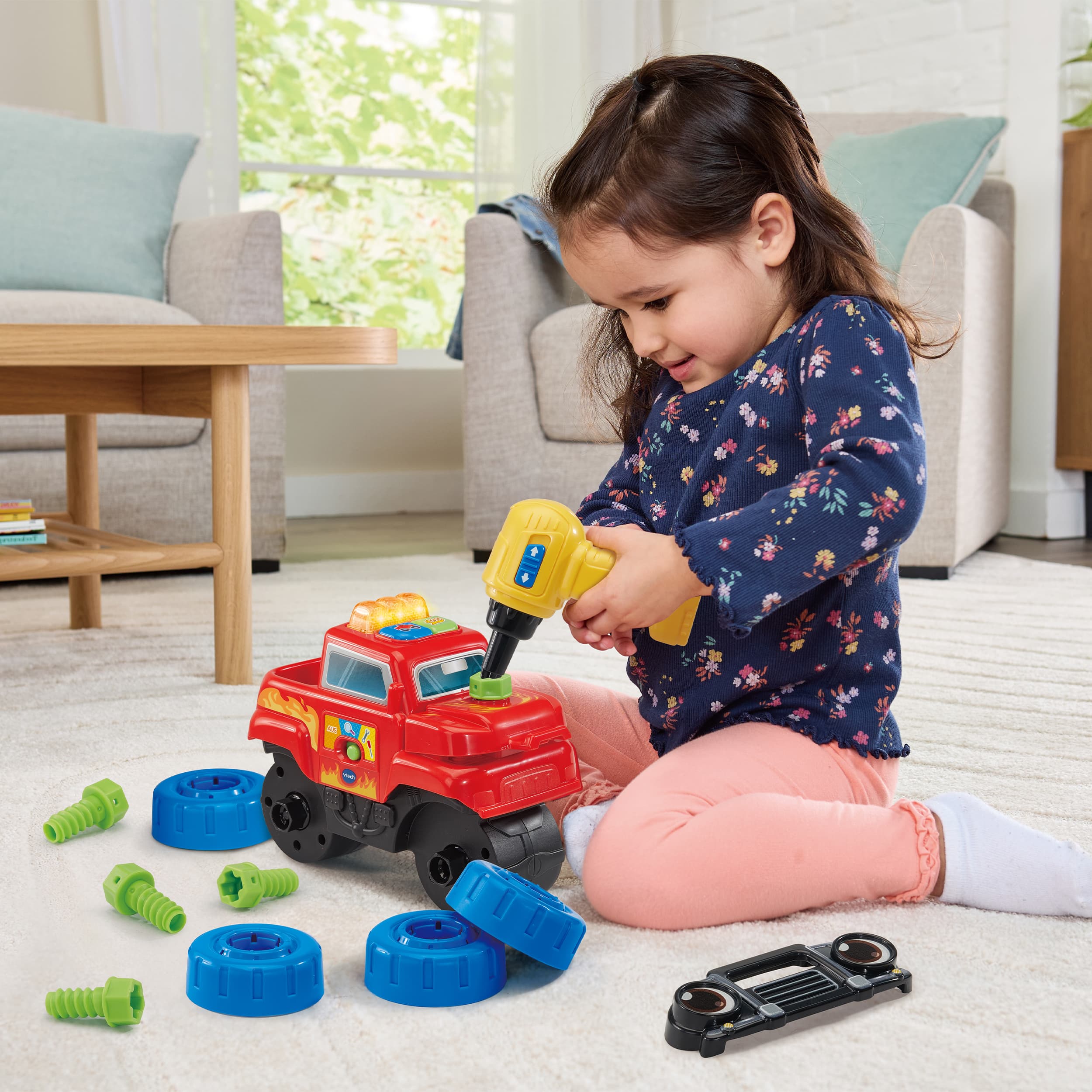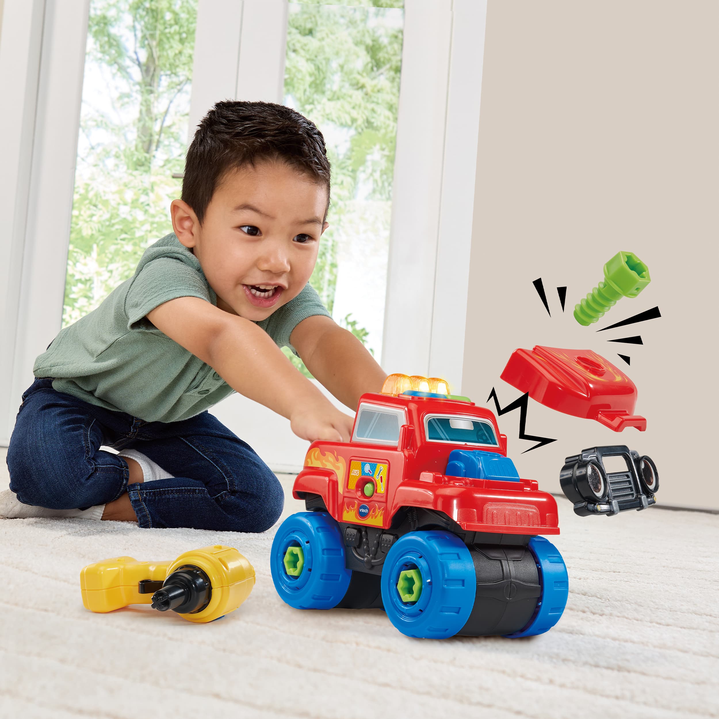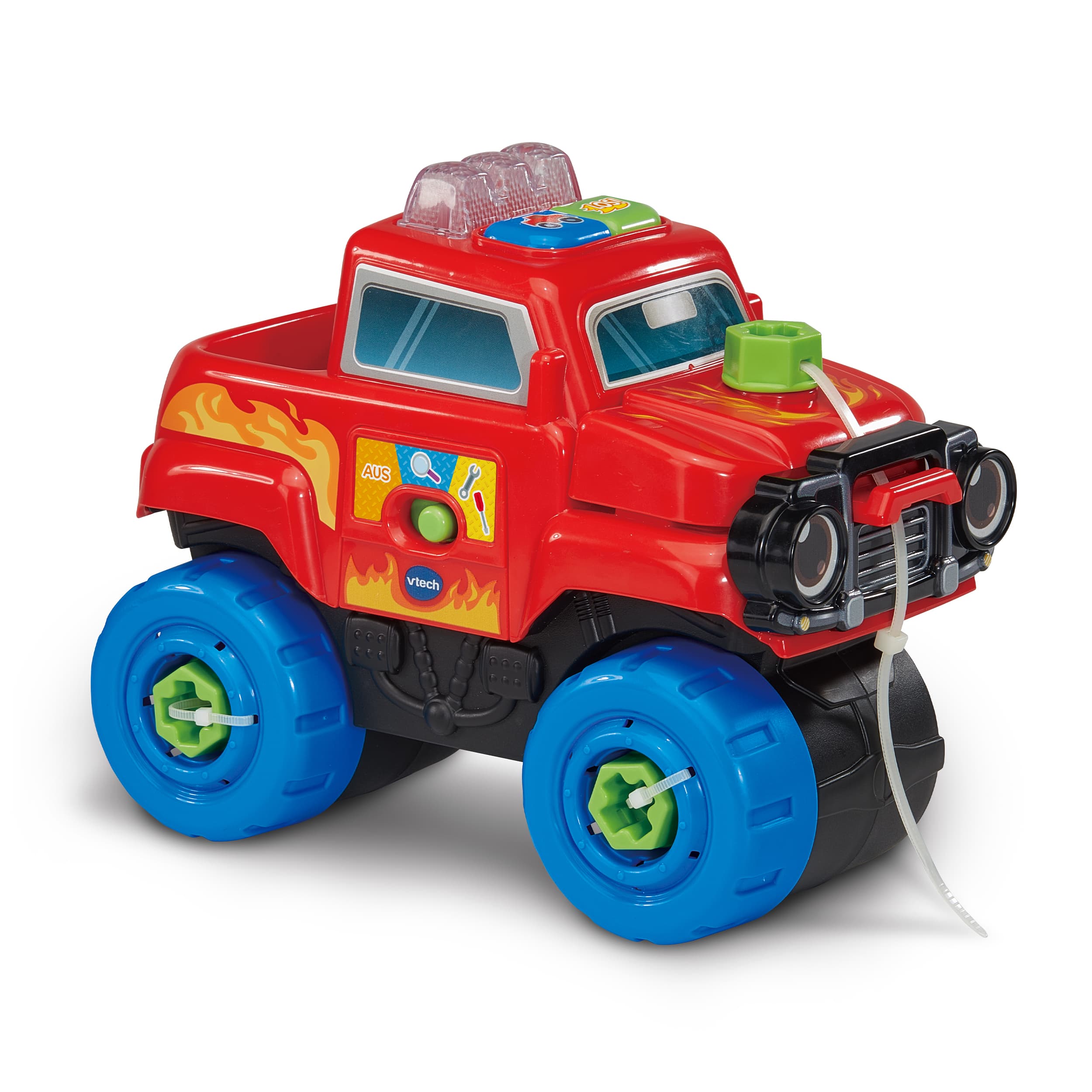 Schrauben, Lernen, Fahren - hier wird Reparieren zum Kinderspiel! Truck, der mit 11 Zubehörteilen und einem Akkuschrauber ausgestattet ist – nützliches Wissen zum Straßenverkehr im Entdeckermodus, Autoteile anschrauben im Repariermodus und im Rollenspielmodus in spannende Abenteuer eintauchen! Truck mit 11 Zubehörteilen und einem Akkuschrauber. 1 LED-Licht & 2 Tasten zum Drücken. 3 Spielmodi: Entdeckermodus (spielt Sätze zu nützlichem Wissen im Straßenverkehr & Lieder), Repariermodus (Autoteile fallen ab und müssen wieder angeschraubt werden) & Rollenspielmodus. Fahrzeug erkennt, ob die richtigen Teile angeschraubt werden und gibt entsprechende Rückmeldung. Kindersicheres Batteriefach und Abschaltautomatik.