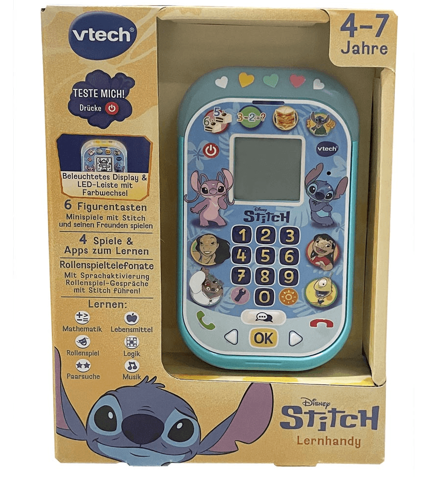 Entdecke das VTech Stitch Lernhandy – das interaktive Spielzeughandy für kleine Disney-Fans! Mit dem beliebten Charakter Stitch aus „Lilo & Stitch“ bietet dieses Lernhandy spannende Lernspiele, Musik und Rollenspielmöglichkeiten. Kinder ab 1 Jahr können mit farbenfrohen Tasten, realistischen Handygeräuschen und lustigen Animationen spielerisch Zahlen, Farben und Formen entdecken. Das robuste Design und die kindgerechte Bedienung machen es zum idealen Begleiter für unterwegs und zuhause.