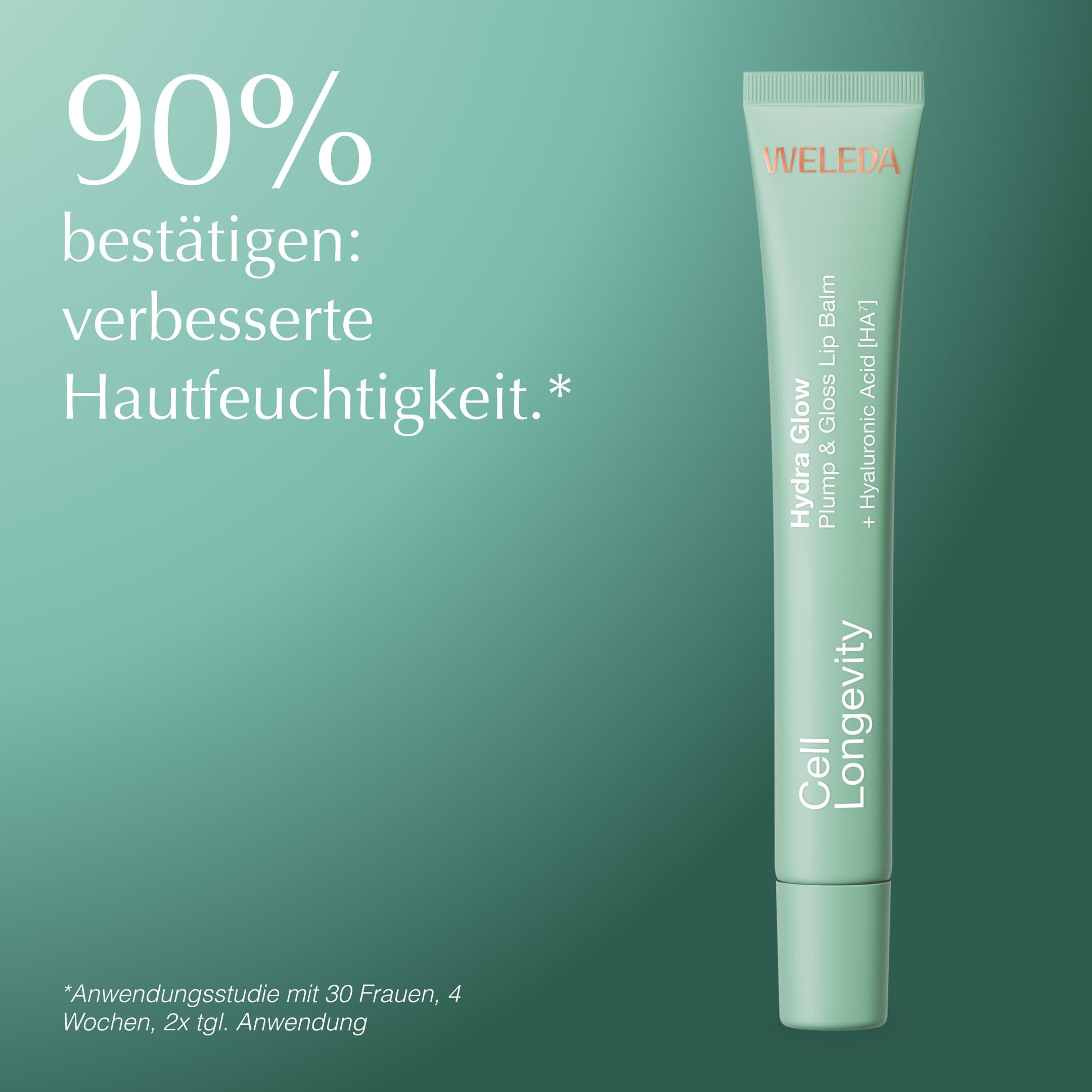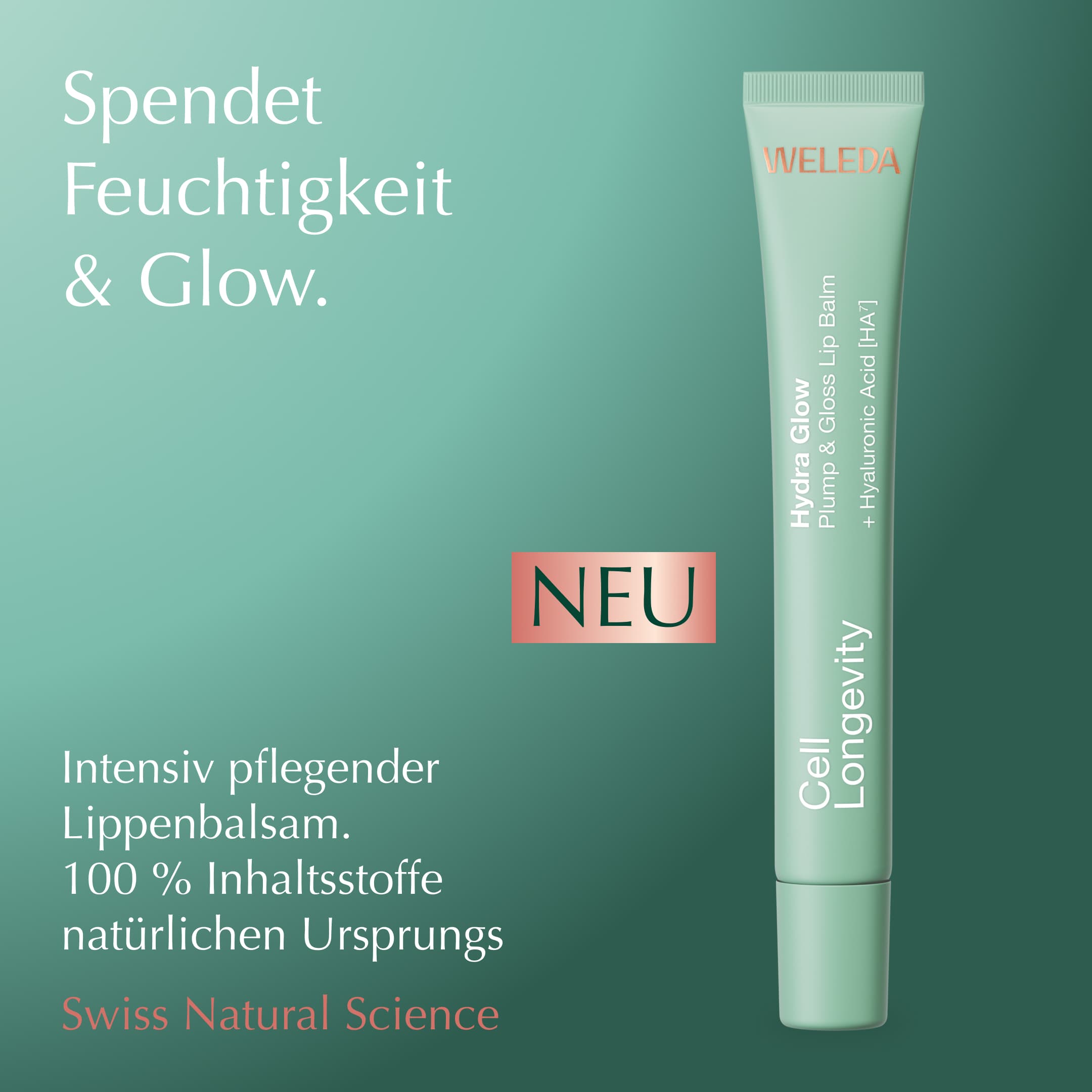 Der Cell Longevity Hydra Glow Plump & Gloss Lippenbalsam von Weleda ist die perfekte Wahl für die intensive Pflege deiner Lippen. Die innovative Rezeptur, angereichert mit Hyaluronsäure in 7 verschiedenen Molekulargewichten, polstert die Lippen sofort intensiv mit Feuchtigkeit auf. Der farblose Balsam mit einer nährenden Mischung aus Rizinus-, Macadamianuss-, Avocado- und Babassuöl pflegt intensiv und schützt empfindliche Lippen vor dem Austrocknen. Er glättet, verleiht den Lippen eine zarte Geschmeidigkeit und hinterlässt ein glossy Finish, das die natürliche Schönheit deiner Lippen unterstreicht.