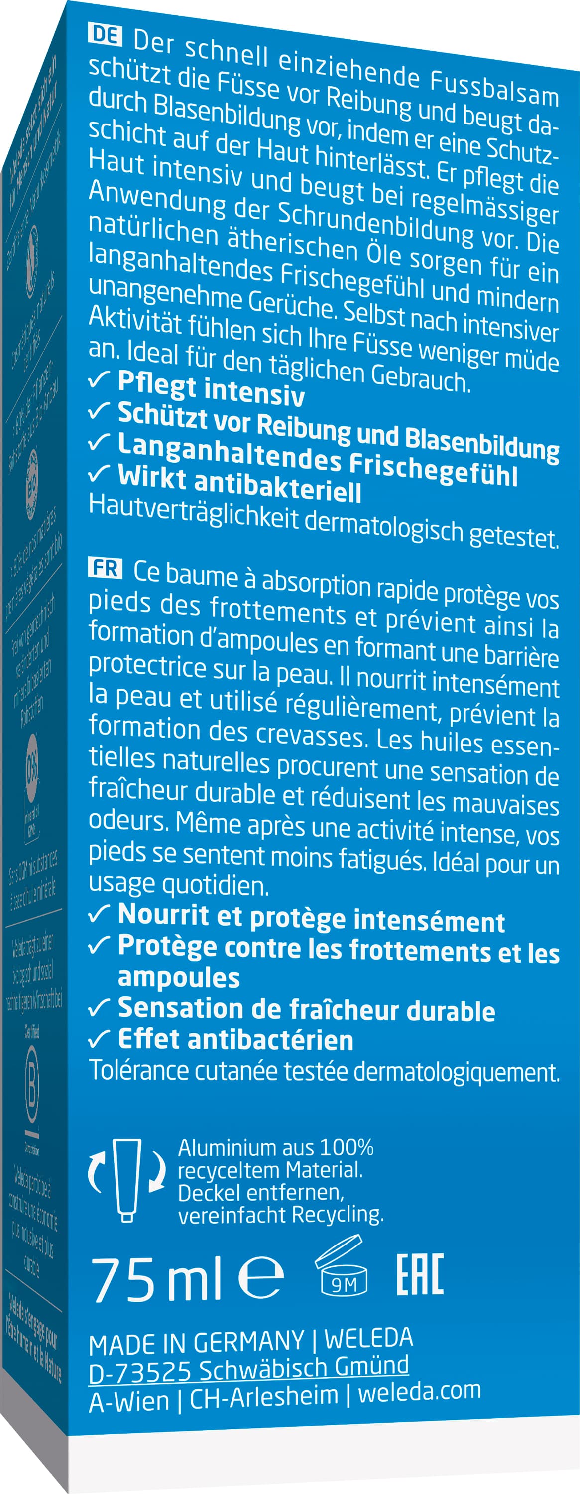Unsere Füße tragen uns durchschnittlich viermal in unserem Leben um den Globus. Mit dem Weleda Fußbalsam als Begleiter fühlen sich Ihre Füße rundum gepflegt an. Die feine Komposition aus stärkendem Myrrhe- und beruhigendem Calendulaextrakt kräftigt die Haut und beugt somit bei regelmäßiger Anwendung der Hornhaut- und Schrundenbildung vor. Tonerde bindet Feuchtigkeit und sorgt dadurch für ein angenehm trockenes Fuß-Klima. Wollwachs und Olivenöl pflegen selbst beanspruchte Haut geschmeidig weich. Echte ätherische Öle verströmen einen erfrischenden Duft, desodorieren und haben einen angenehm kühlenden Effekt auf der Haut. Extra-Verwöhnprogramm: Gönnen Sie Ihren Füßen ab und zu ein belebendes Fußbad, z.B. mit dem Weleda Citrus-Erfrischungsbad. Anschließend massieren Sie den Fußbalsam sanft ein. Ihre Füße werden es Ihnen danken. Dermatologisch getestet.