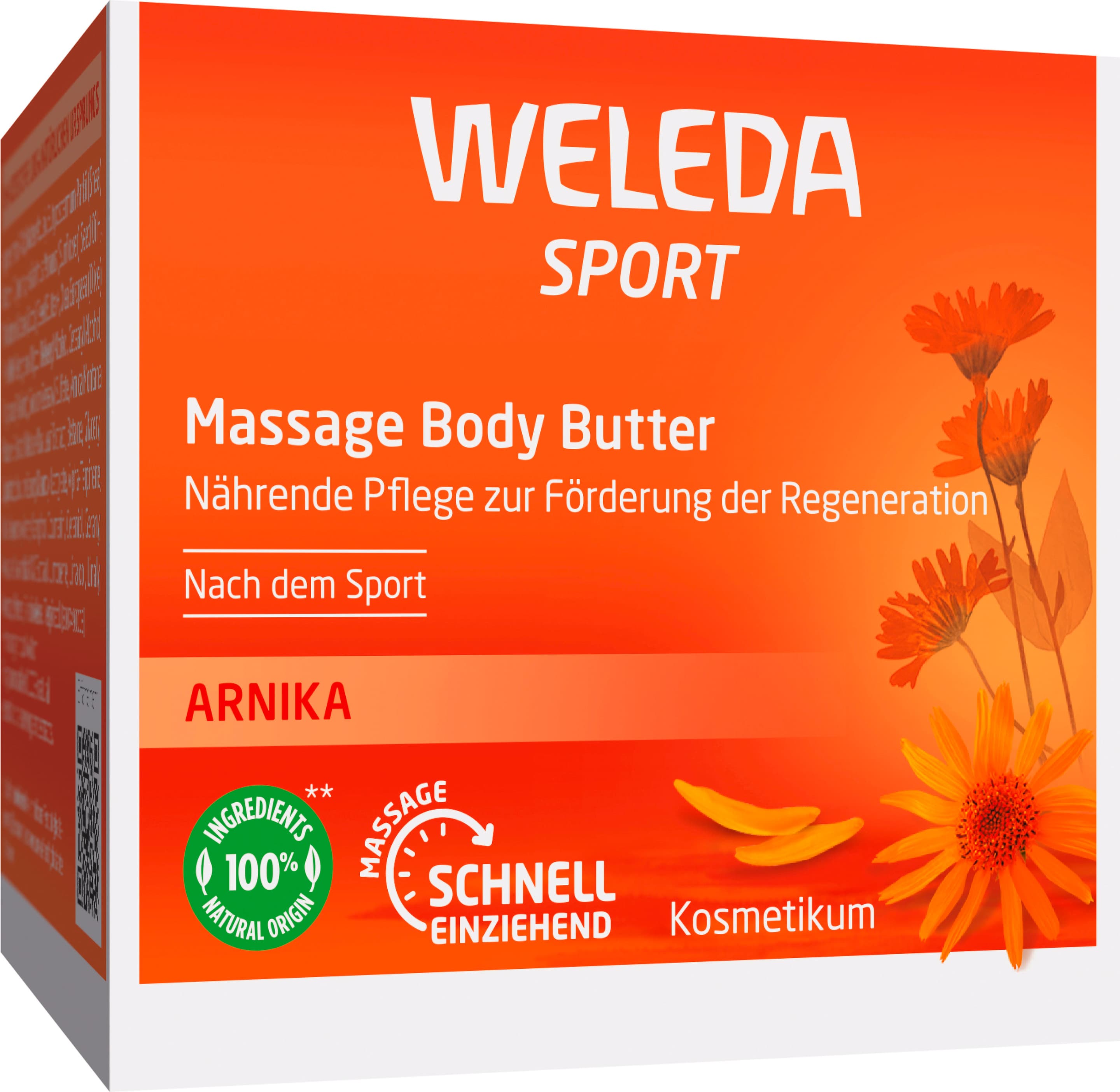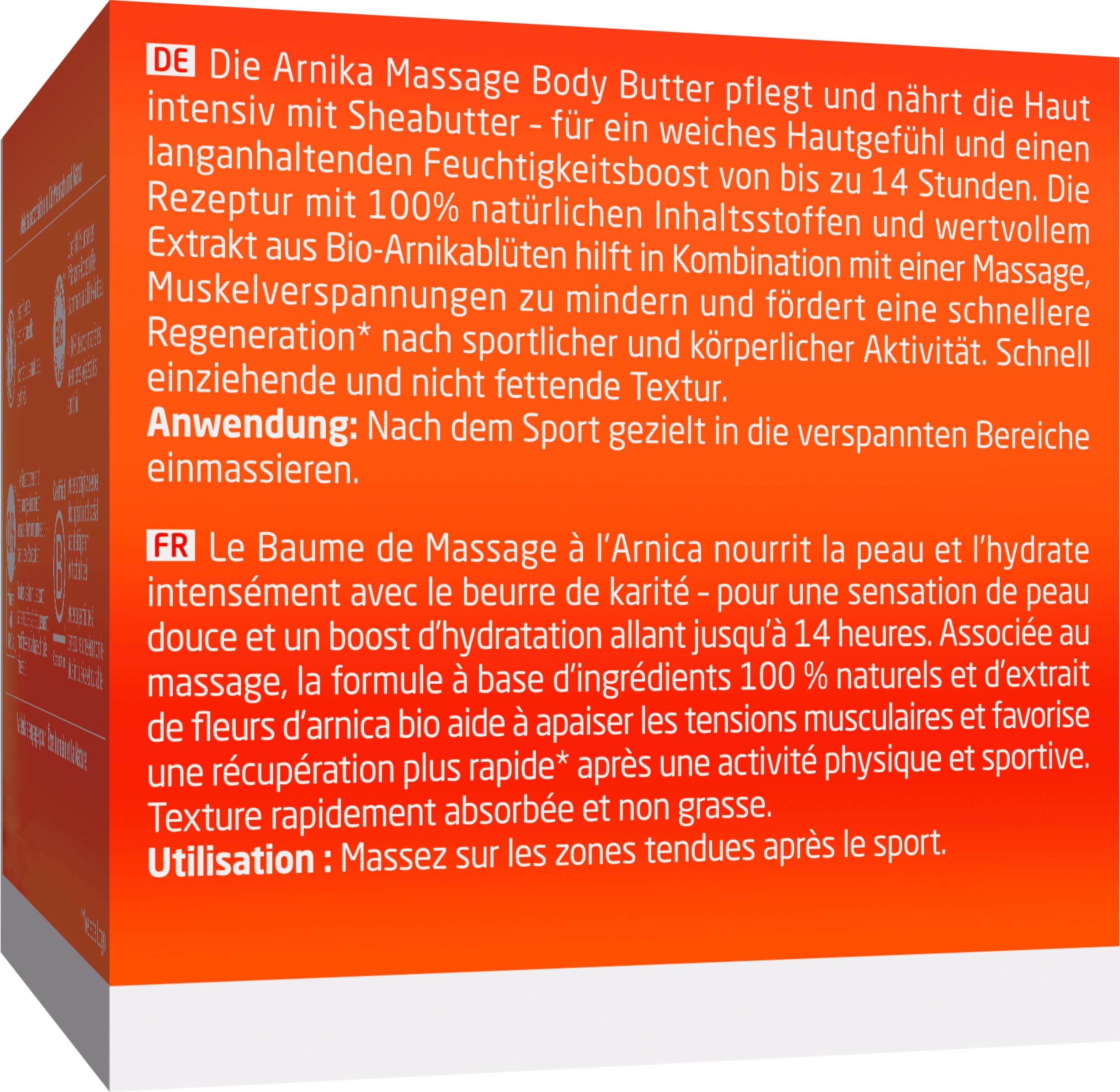 Die Arnika Massage Body Butter pflegt und nährt die Haut intensiv mit Sheabutter - für ein weiches Hautgefühl und einen langanhaltenden Feuchtigkeitsboost von bis zu 14 Stunden. Die Rezeptur mit 100% natürlichen Inhaltsstoffen und wertvollem Extrakt aus Bio-Arnikablüten hilft in Kombination mit einer Massage, Muskelverspannungen zu mindern und fördert eine schnellere Regeneration nach sportlicher und körperlicher Aktivität. Schnell einziehende und nicht fettende Textur.