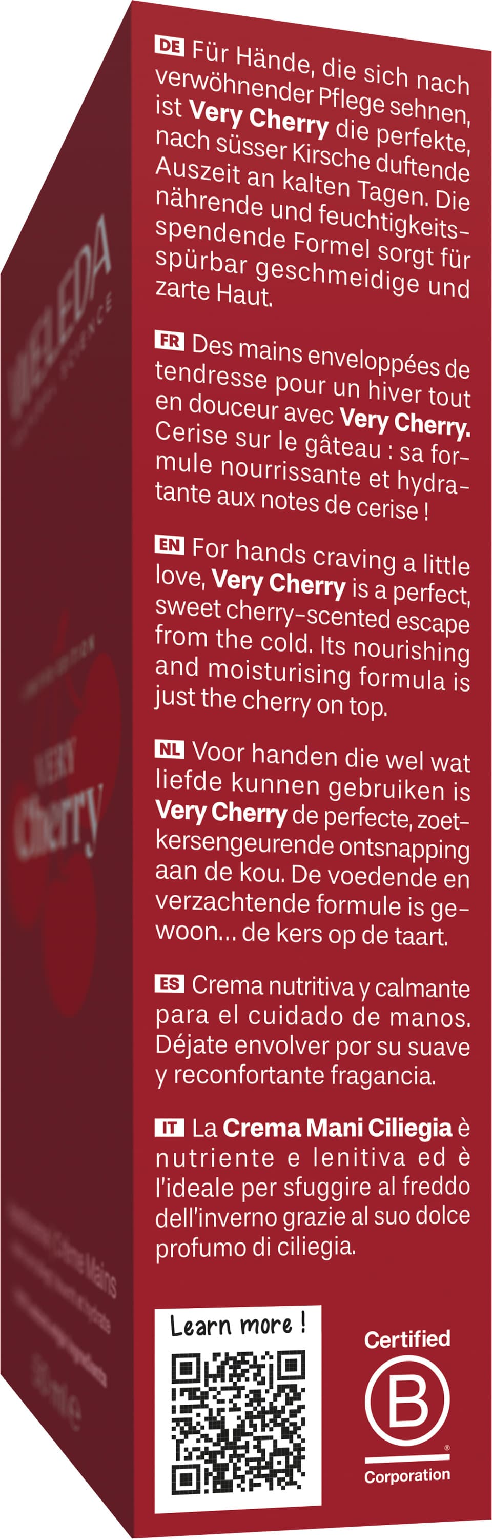 Für Hände, die sich nach verwöhnender Pflege sehnen, ist Very Cherry die perfekte, nach süsser Kirsche duftende Auszeit an kalten Tagen. Die nährende und feuchtigkeitsspendende Formel sorgt für spürbar geschmeidige und zarte Haut.