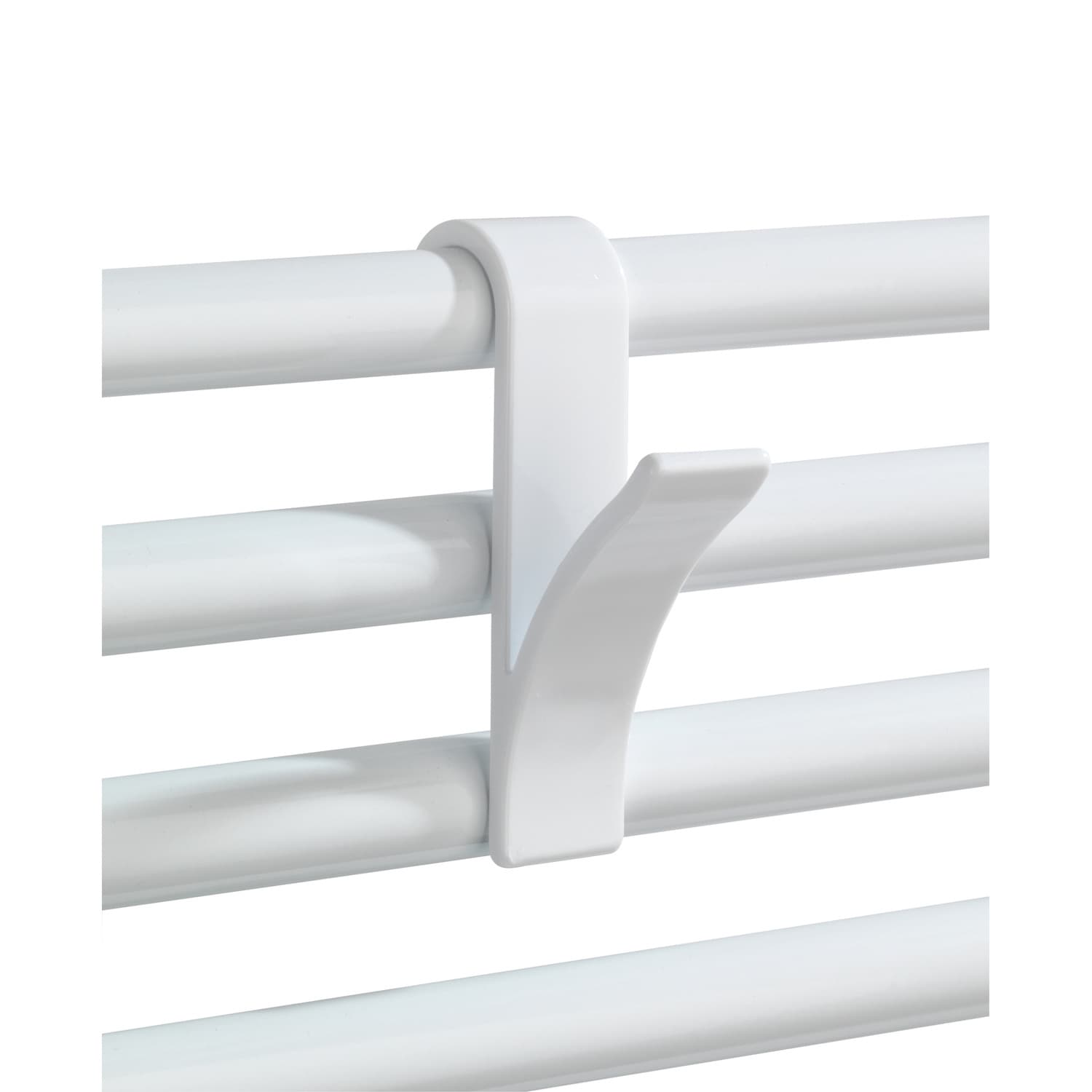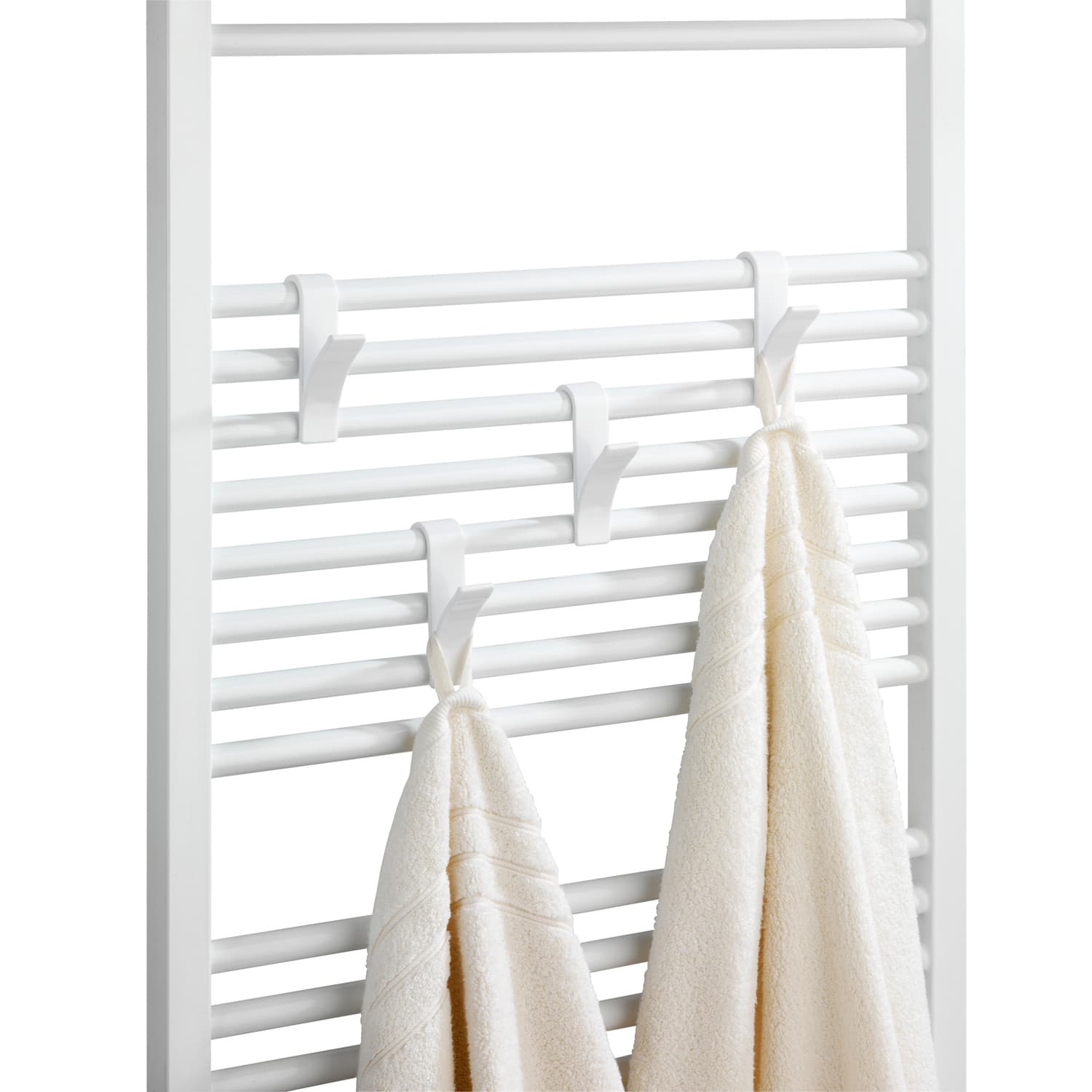 Ordnung am Badheizkörper garantieren diese beiden praktischen Haken aus stabilem Kunststoff. In dezentem Weiß gehalten, schaffen die nützlichen Helfer Platz für mehrere Bade- und Duschtücher am Handtuchheizkörper. Die Haken werden ganz einfach an die Stangen des Handtuchwärmers gehängt. Nebeneinander oder auch versetzt halten sie die Handtücher an gewünschter Stelle stets griffbereit.