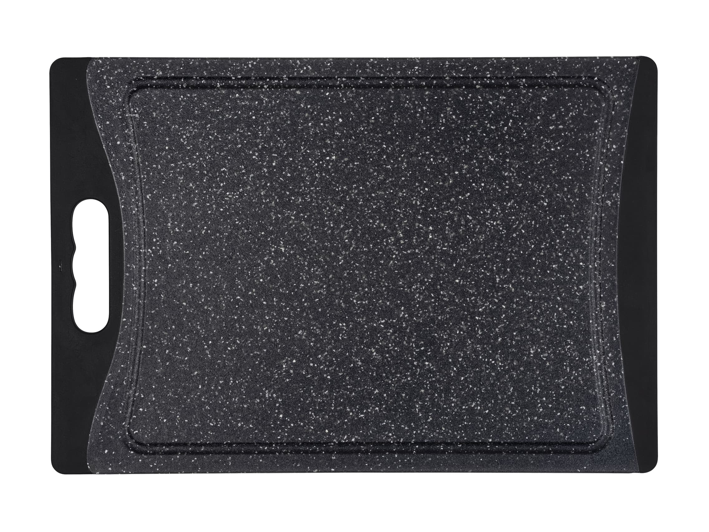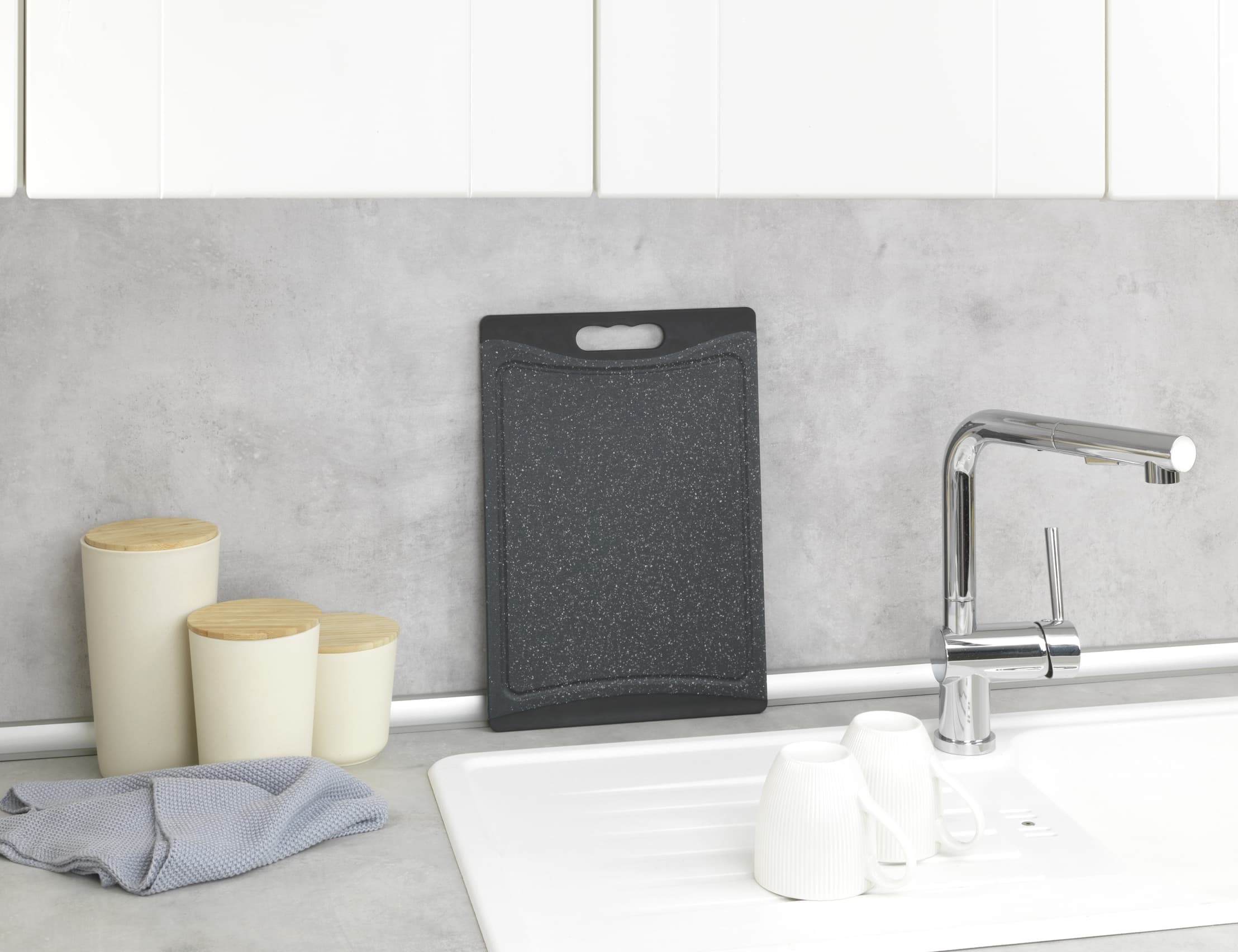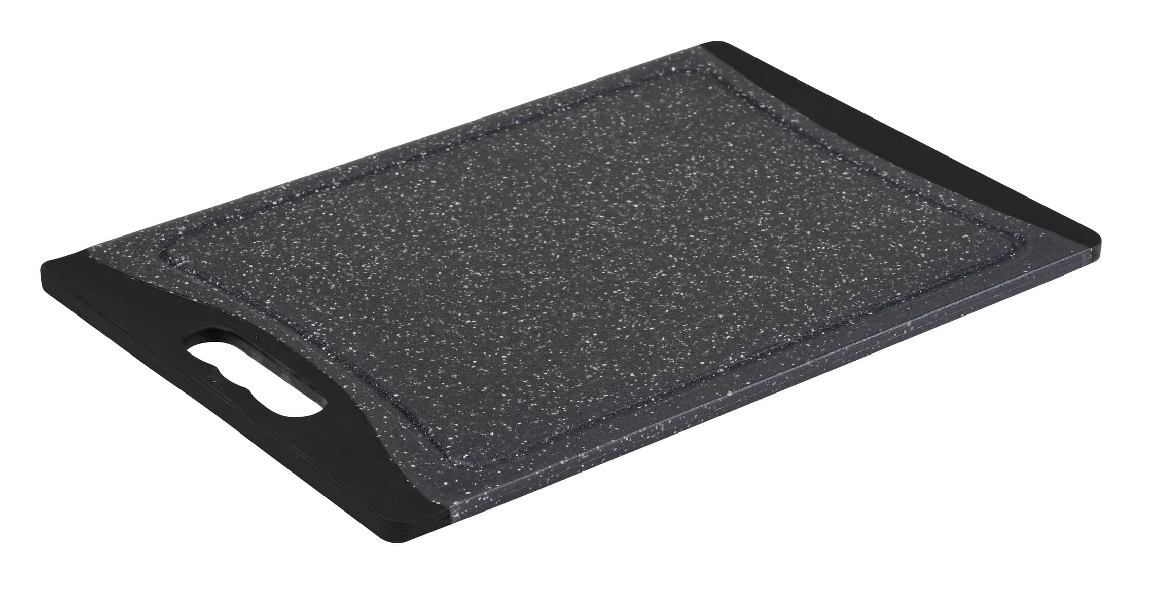 Hygienisches, rutschfestes Schneidebrett aus hochwertigem Kunststoff. Einfache Handhabung dank Griff und Saftrille. In modernem, pflegeleichtem Schwarz.