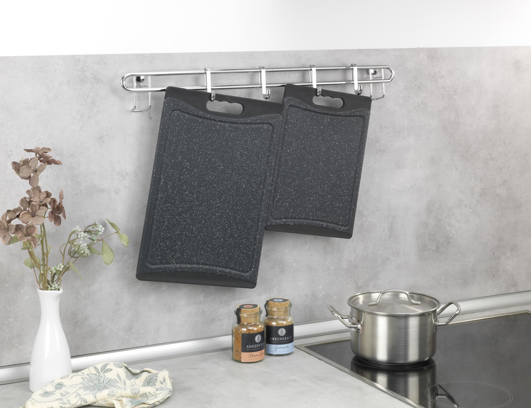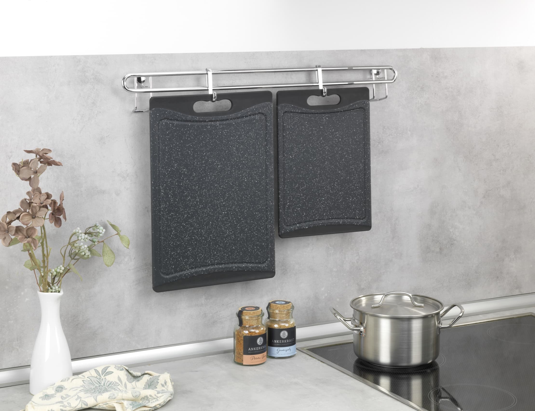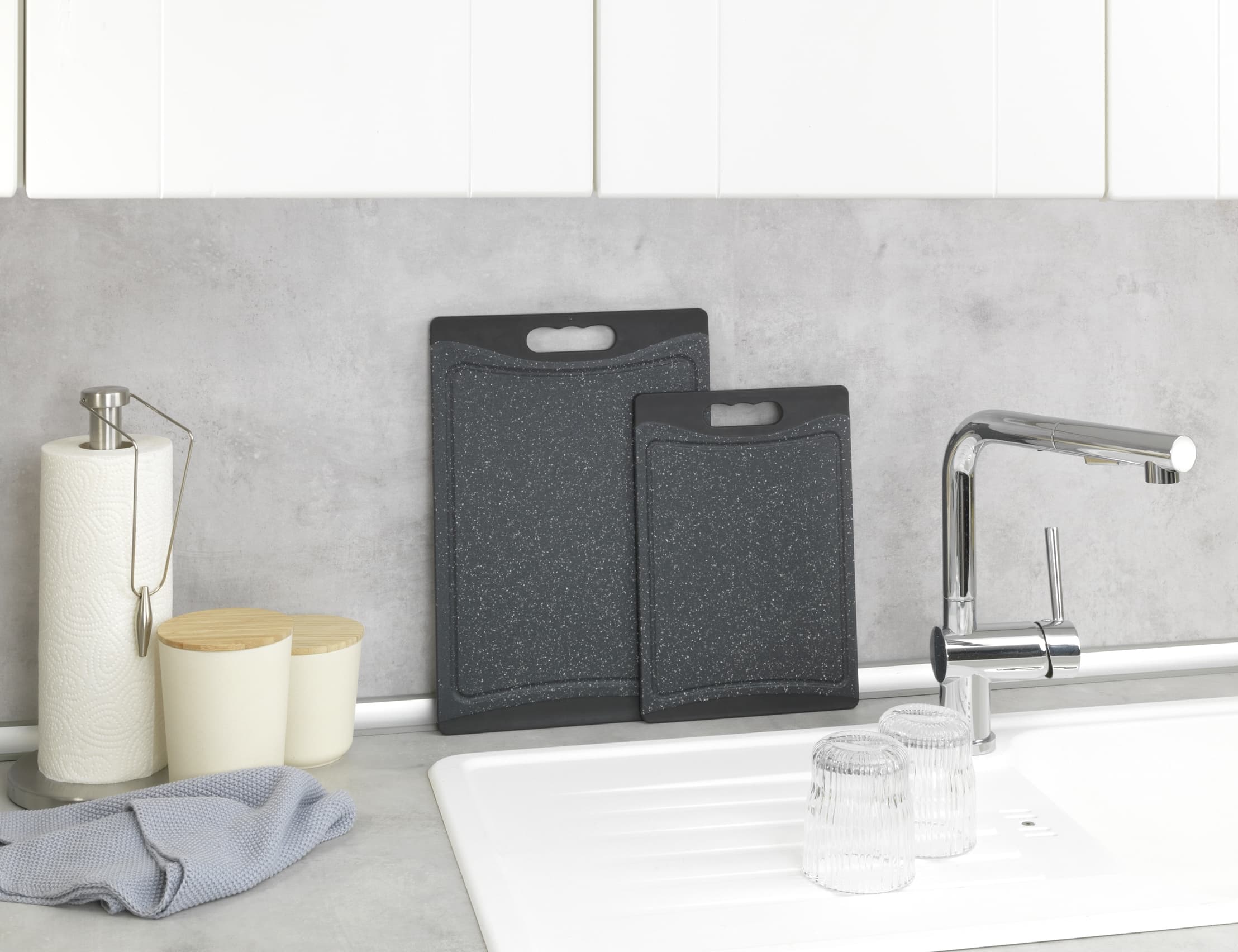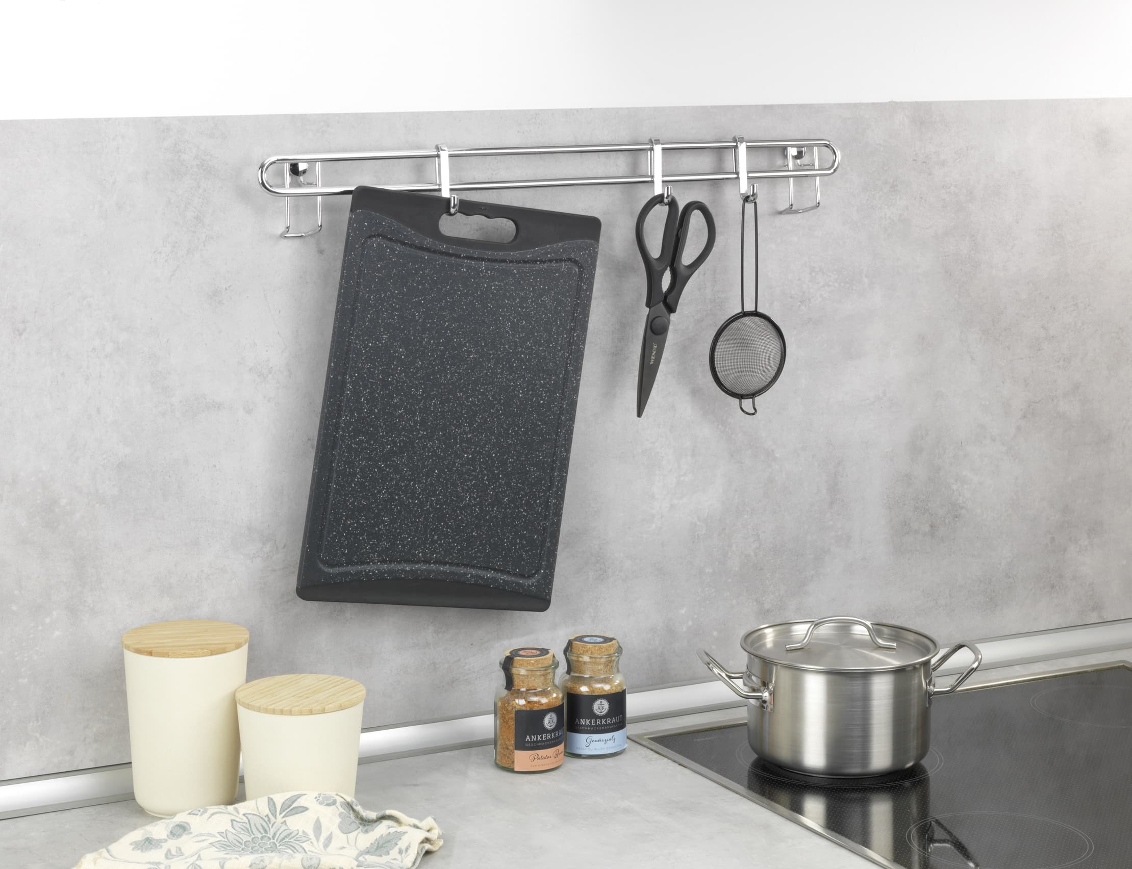 Hygienisches, rutschfestes Schneidebrett aus hochwertigem Kunststoff. Einfache Handhabung dank Griff und Saftrille. In modernem, pflegeleichtem Schwarz.
