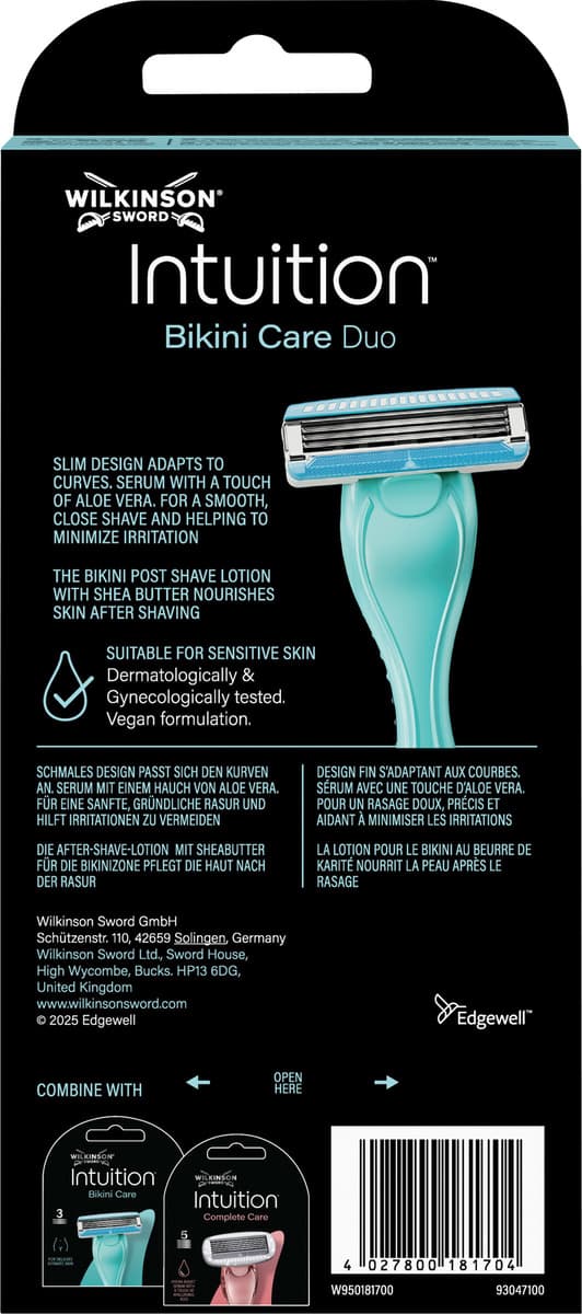Das Wilkinson Bikini Care Duo wurde speziell für die Pflege der empfindlichen Haut im Intimbereich konzipiert. Es kombiniert eine gründliche Rasur mit einer anschließenden Pflege für ein angenehmes Hautgefühl.