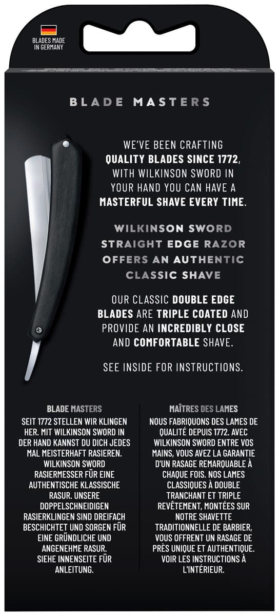 | Anwendungshinweis | Brechen oder schneiden Sie die Klinge vorsichtig der Länge nach in der Mitte innerhalb des Papiers durch. Öffnen Sie die Klinge und setzen Sie die halbe Klinge direkt auf die Punkte und parallel zur Kante in den Rasierer ein. Fixieren Sie sie und schließen Sie die Klinge! Idealerweise rasieren Sie in einem Winkel von 30° zwischen der Klinge und der Haut. Rasieren Sie langsam und üben Sie nicht zu viel Druck aus. Die Verwendung von Rasierpräparaten wird empfohlen. Reinigen und trocknen Sie die Klinge nach Gebrauch. |